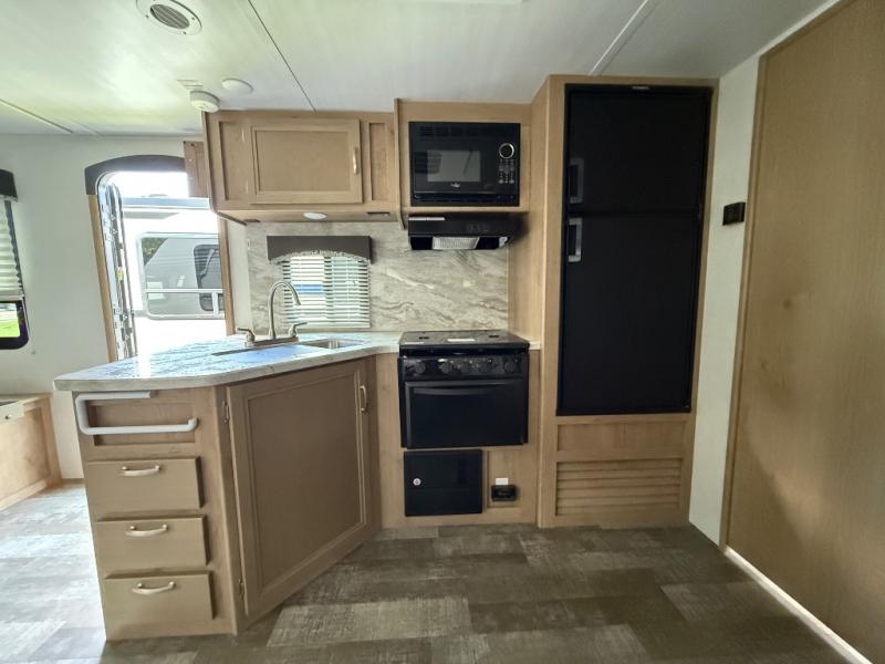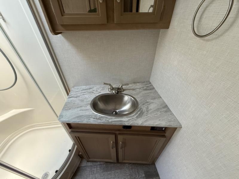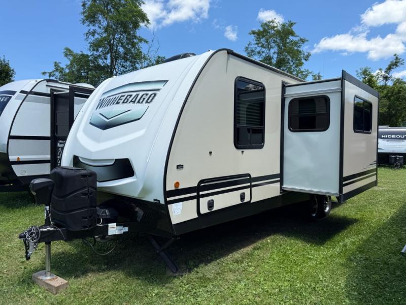 In any Minnie travel trailer by Winnebago Industries Towables, you will find increased living space with a fantastic single slide. On the inside, you will find each Minnie trailer to be full of life with light-colored interiors, easy-to-clean linoleum surfaces along with efficient LED lighting. The best-in-class exterior storage features 44 cu.ft. of space for all your camp gear, and the lockable storage door will help keep everything secure. You will also be the talk of the campground with your Minnie travel trailer because it comes with exterior fiberglass sidewalls.