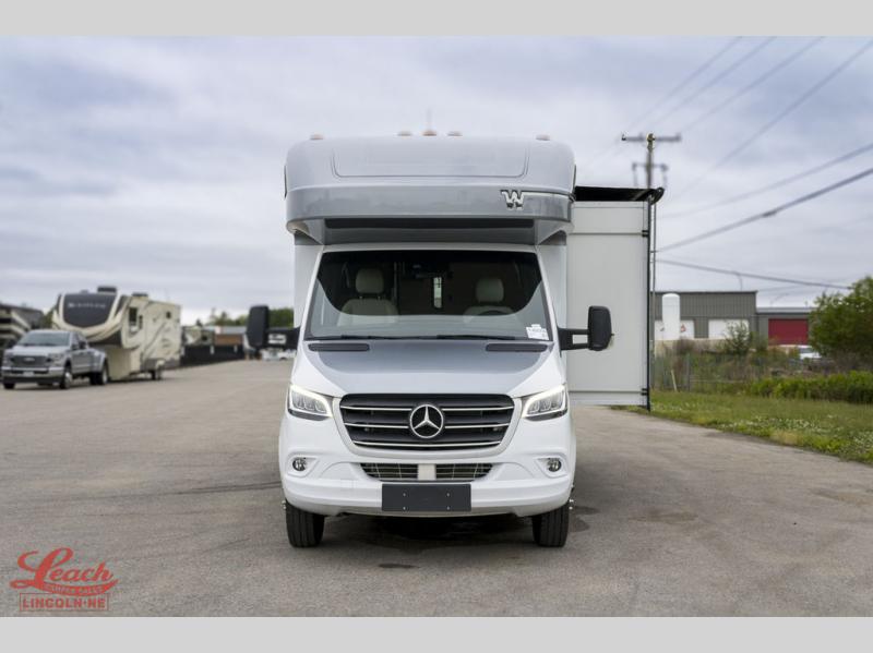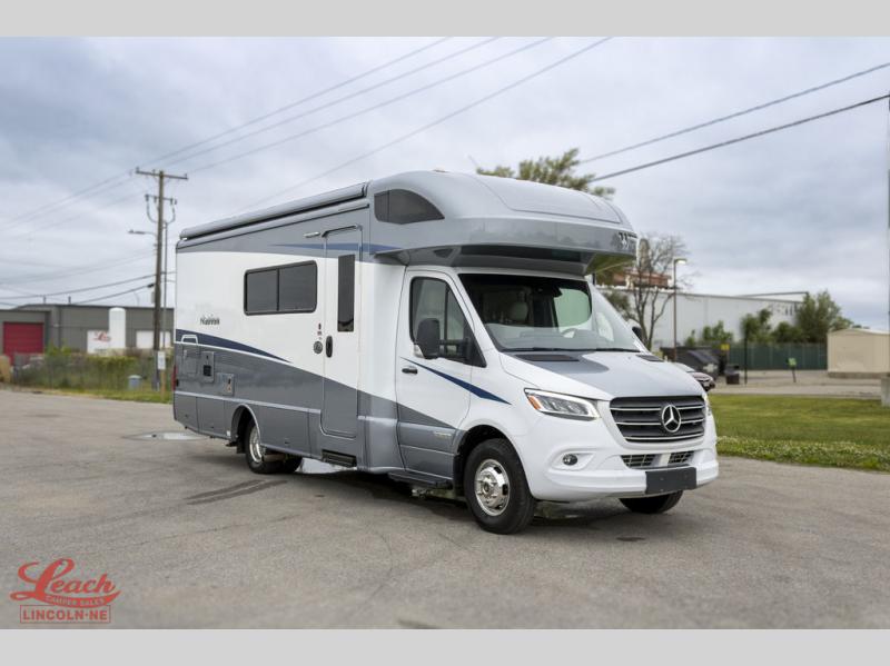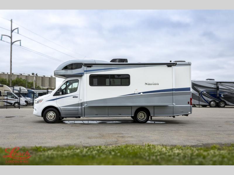 The Winnebago Navion Class C diesel motorhome provides freedom of the open road at every turn. Each model includes advanced safety features, such as brake assist, lane keeping assist, and the MBUX touchscreen infotainment system with voice interference, navigation, plus so much more! The 3,600-watt Cummins Onan MicroQuiet LP generator and the 200-watt solar panel allow you to go off the beaten path for extended adventuring. Inside, you'll enjoy vinyl flooring throughout, 110V/12V/USB charging stations, a 32" HDTV, plus laminate countertops in the galley. When you're ready to enjoy some fresh air, the power awning with LED lights will provide a comfortable outdoor living space, and the automatic entrance door step will make it easy to enter back in when it's time for bed.