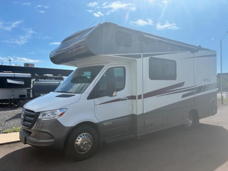 A modern update to the versatile Class C motorhome, the Winnebago® Vita® lets you pack a lot of living into its compact, easy-driving footprint. The Vita combines the power, fuel economy and safety features of the Mercedes-Benz® Sprinter chassis with Winnebago’s relentless focus on quality and innovation. With the largest carrying capacity, galley, holding tank capacity, and even bed length (24F) in its class, the Vita makes an ideal travel companion for families of all types. The 3.0L V6 turbo-diesel-powered Vita comes equipped with the latest Mercedes-Benz safety features, two 100-watt solar panels, a Cummins Onan® MicroQuiet™ generator and 1,000-watt pure sine wave inverter, as well as available dual reclining theater seating with center console and removable pedestal table that help you viva la Vita!