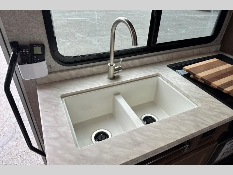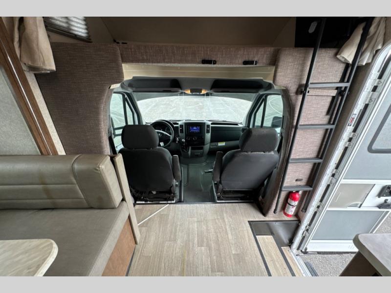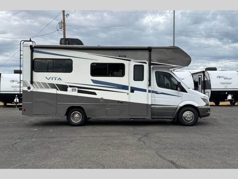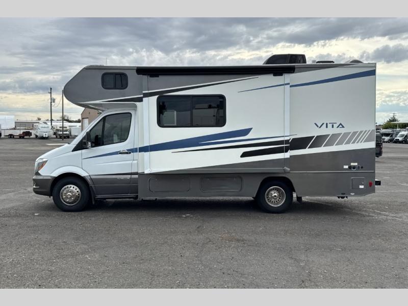 In any Winnebago Vita, you will find a motorhome in a class all its own. From the Mercedes-Benz sprinter chassis to the customizable storage cabinets. Each unit is built with an adaptive ESP technology and hydraulic brakes with ABS to help you reach your destination safely. Your driver will enjoy features like the MBUX touchscreen multimedia infotainment center, the hill start assist, and the cruise control. The cab seats have armrests, an adjustable lumbar support system, and a head rest, plus they can swivel, recline, and slide to give you a comfortable ride. While traveling, you can enjoy viewing the beautiful scenery as it goes by through the panoramic galley window or you can pull up your favorite movie on the 32" HDTV to make the time go by faster!