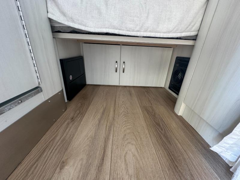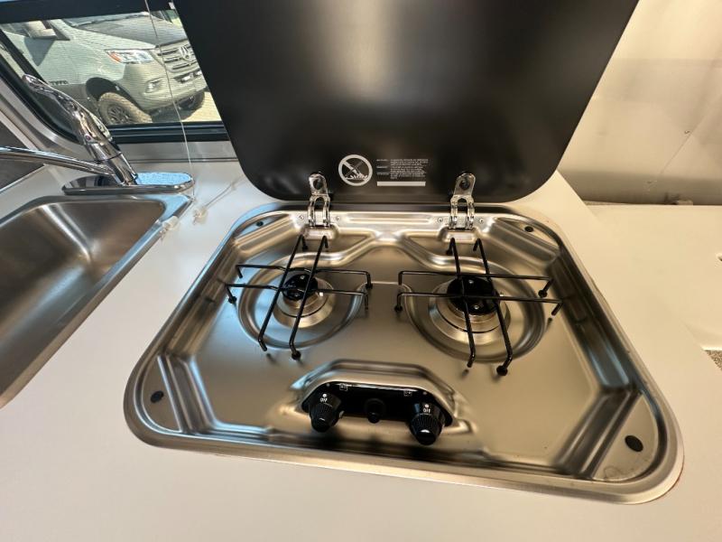 Let this Bambi travel trailer be your gateway to fun and adventure. After setting up camp, make lunch on the two-burner cooktop or make something quick in the microwave oven before heading out to find a trail. The convenient wet bath will be waiting for you when you get back, and you can use the showerhead pass-through to create an outdoor shower. Get out the deck of cards in the evening to play at the dinette. This area also converts into additional sleeping space for a guest or the kids. You'll find plenty of storage for all your items, including a hanging closet, under-the-bed storage, and overhead space.