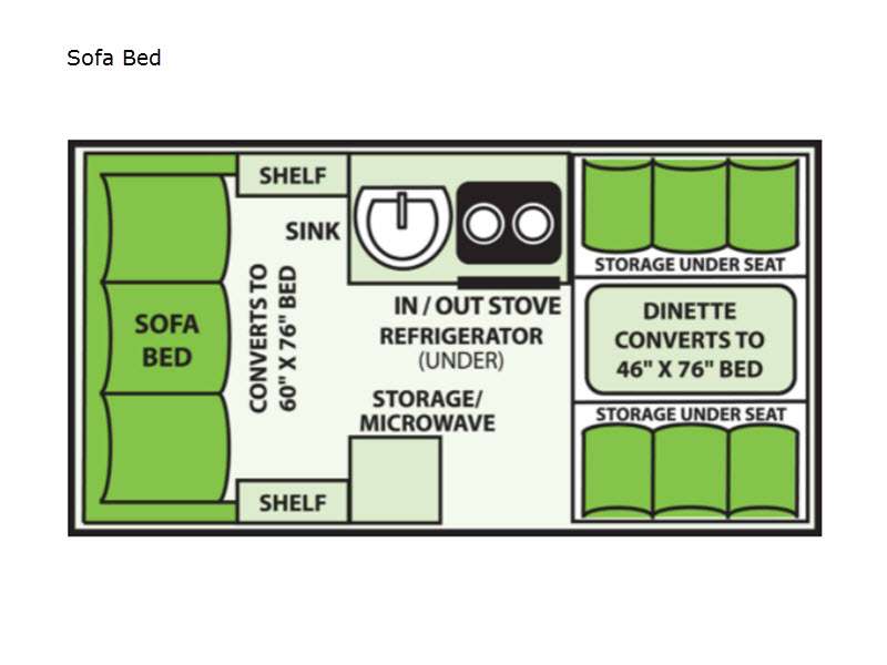 Take a romantic weekend away with your spouse in this Classic A-frame camper! You will find a two-burner in/out stove for making meals so that you don't have to rely on using a campfire for dinner, and there is also a sink and refrigerator included for washing up and keeping your produce fresh. The 60" x 76" sofa bed is convenient to have because it lets you have a lounge spot during the day with sleeping for two at night. You will also really love the two skylights with night shades because you can admire the moon before drifting off to sleep. You might even like to choose the 35th Anniversary Edition option with special graphics package and logo.
