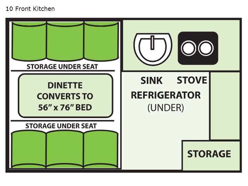 A front kitchen makes it easy to walk around as you prepare breakfast in this A-frame camper! Underneath the two burner stove and sink is a 1.9 cu. ft. three way refrigerator to keep your perishables fresh. You even have a storage area for some snacks and dishware. The rear dinette converts into a 56" x 76" bed and also has storage under the seats!
