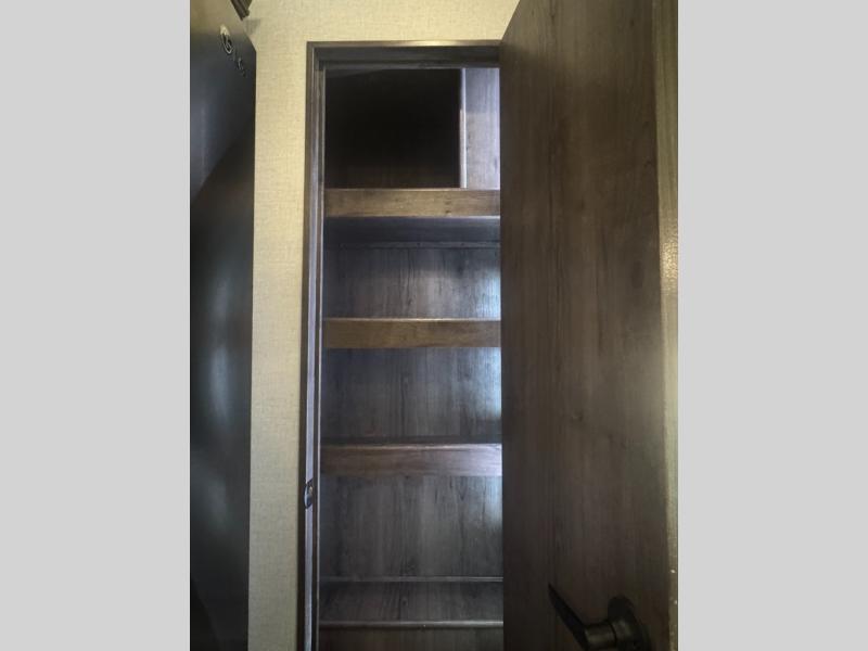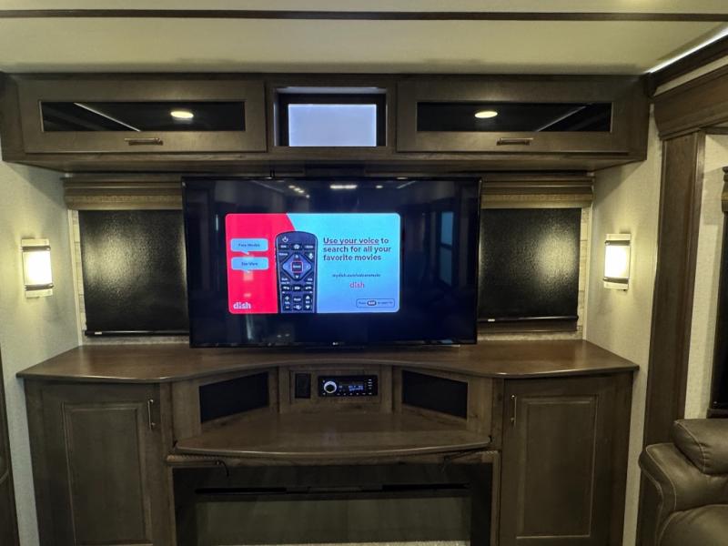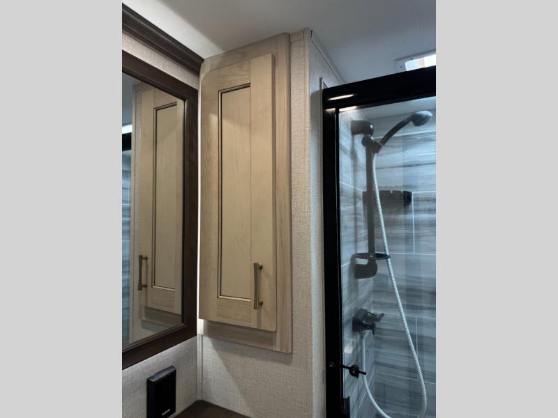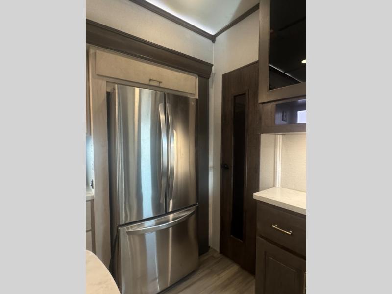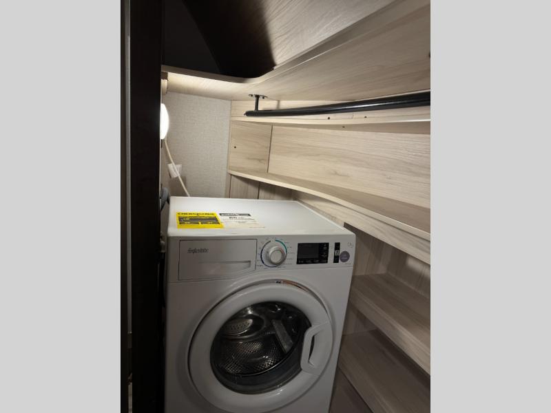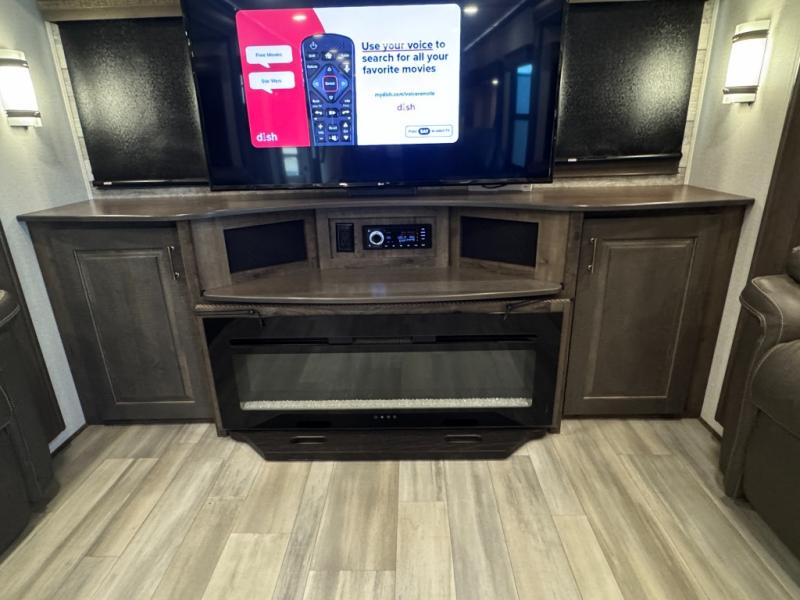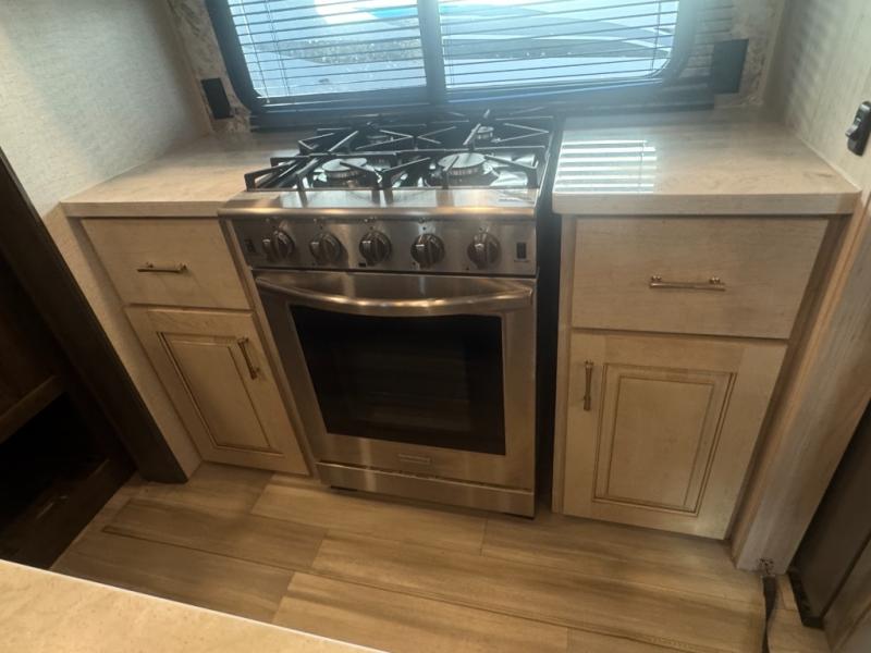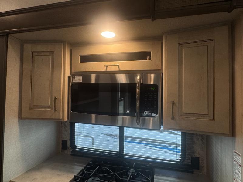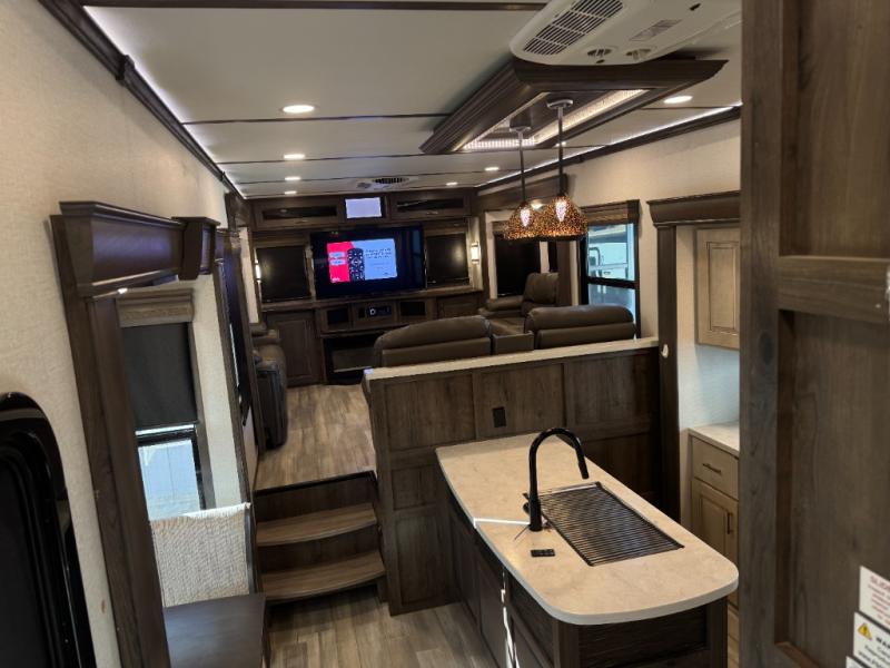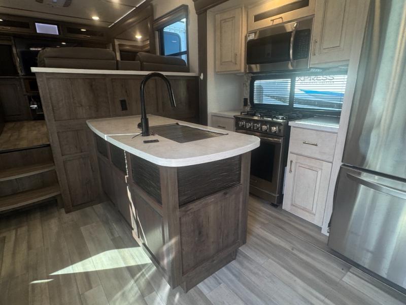 Throughout this entire Paradigm fifth wheel, you will be stunned by the residential, high-quality features! The kitchen is exceptional with its Insignia microwave, Insignia four-burner range, industry's largest oven, prep for a dishwasher, and peninsula countertop. The flush-floor kitchen slide also ensures that you won't stub your toes while you're preparing dinner, and the 18 cubic foot refrigerator will hold so much food! The technological features found on this unit are top notch, like the two Smart TVs, the USB charging ports, the dimmable LED lighting, and the marine-grade exterior speakers. Bring all of your favorite sweaters and sneakers in the walk-in closet located in the front private bedroom, and spend some time getting clean each morning in the large residential shower.