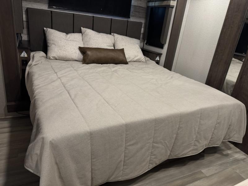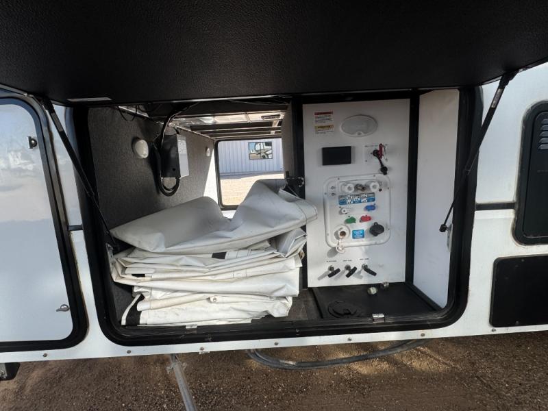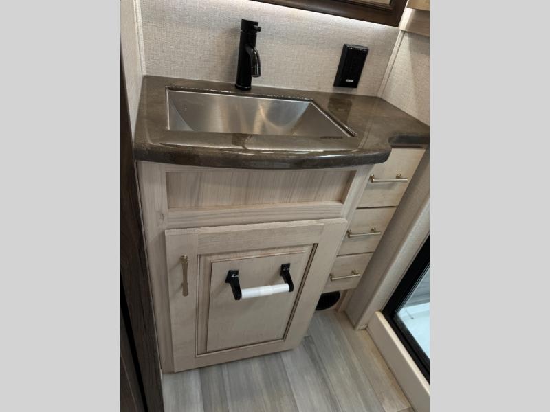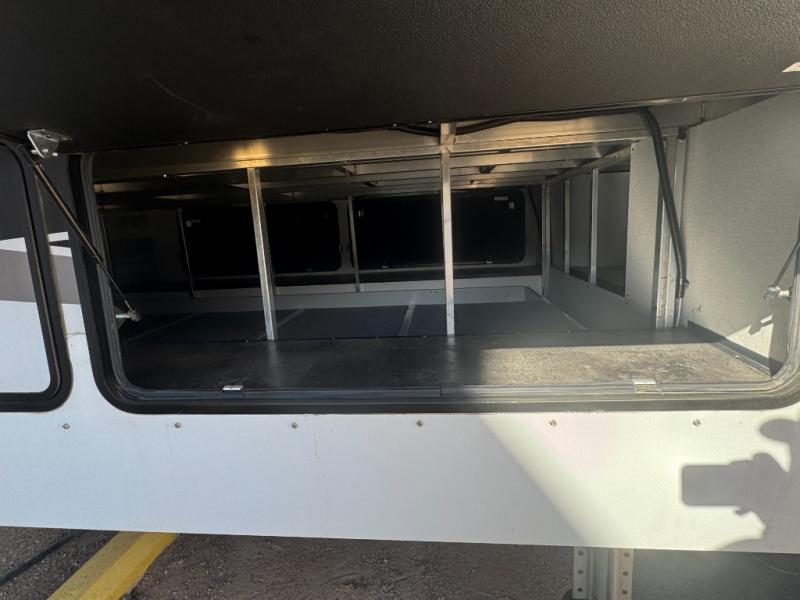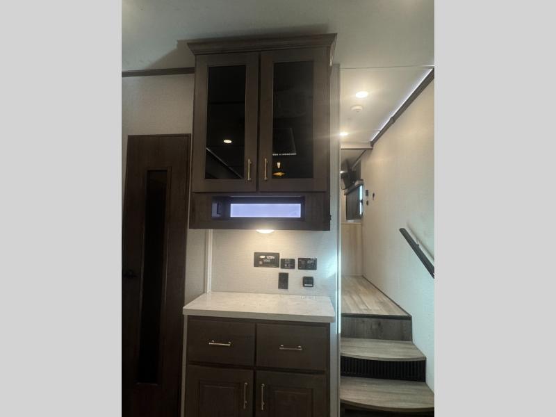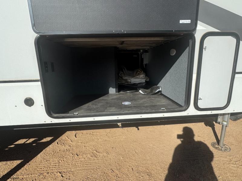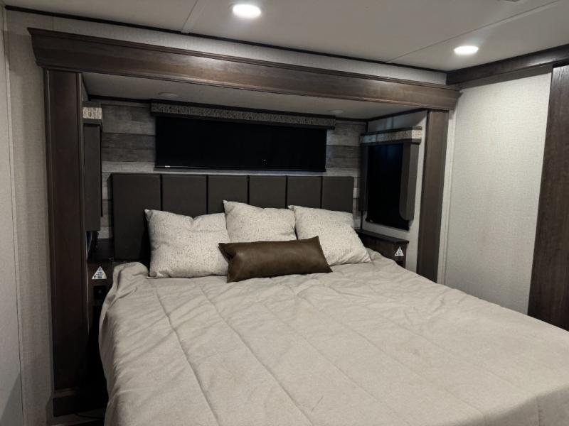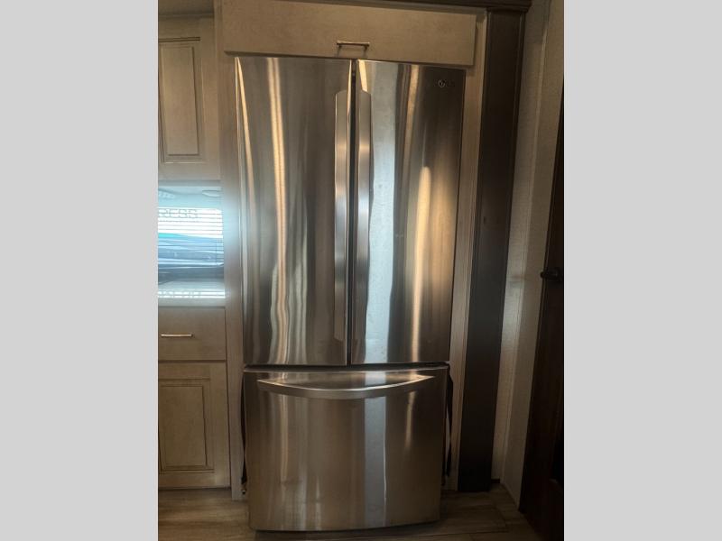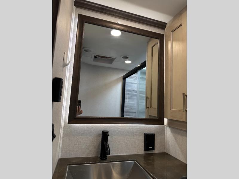 Throughout this entire Paradigm fifth wheel, you will be stunned by the residential, high-quality features! The kitchen is exceptional with its Insignia microwave, Insignia four-burner range, industry's largest oven, prep for a dishwasher, and peninsula countertop. The flush-floor kitchen slide also ensures that you won't stub your toes while you're preparing dinner, and the 18 cubic foot refrigerator will hold so much food! The technological features found on this unit are top notch, like the two Smart TVs, the USB charging ports, the dimmable LED lighting, and the marine-grade exterior speakers. Bring all of your favorite sweaters and sneakers in the walk-in closet located in the front private bedroom, and spend some time getting clean each morning in the large residential shower.