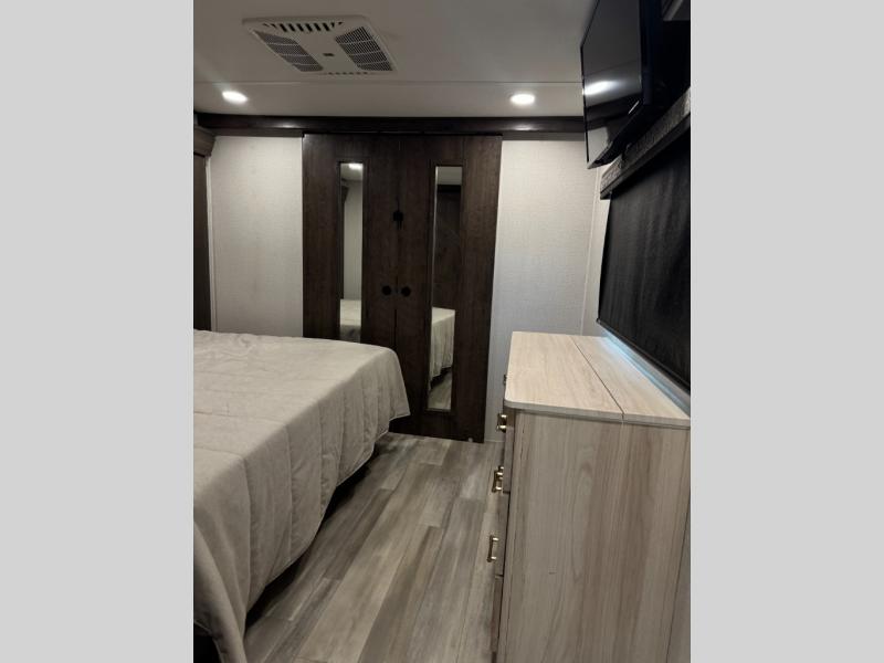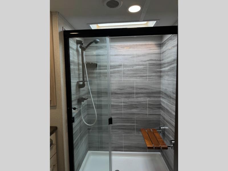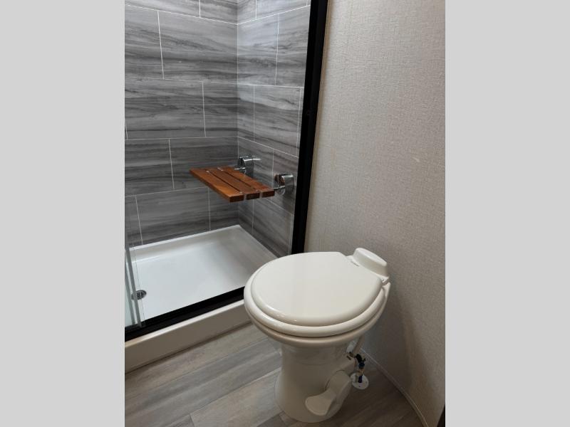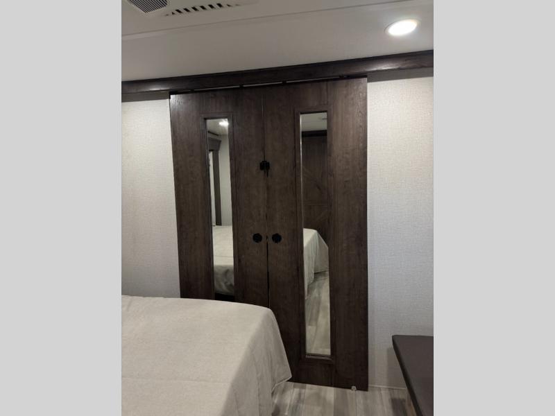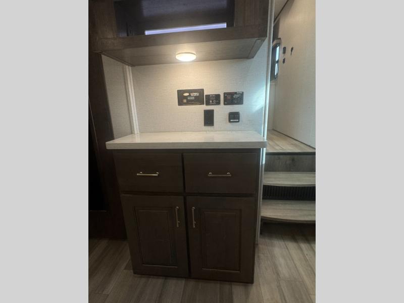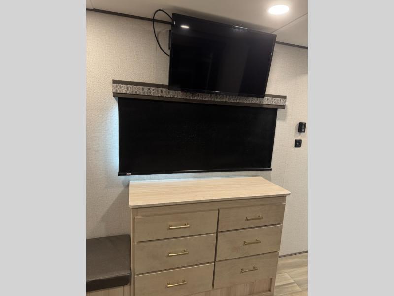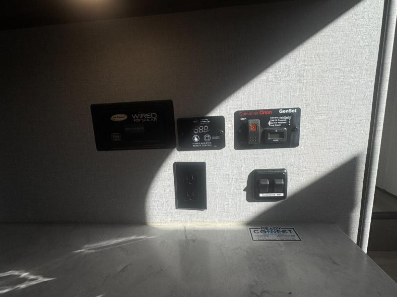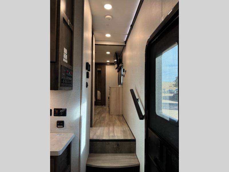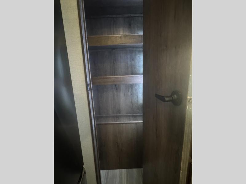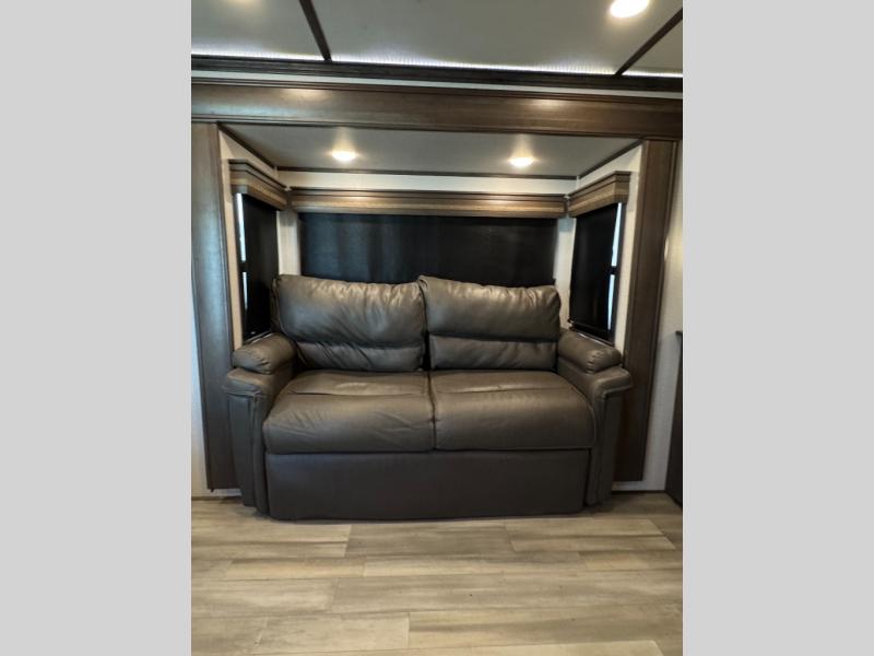 Throughout this entire Paradigm fifth wheel, you will be stunned by the residential, high-quality features! The kitchen is exceptional with its Insignia microwave, Insignia four-burner range, industry's largest oven, prep for a dishwasher, and peninsula countertop. The flush-floor kitchen slide also ensures that you won't stub your toes while you're preparing dinner, and the 18 cubic foot refrigerator will hold so much food! The technological features found on this unit are top notch, like the two Smart TVs, the USB charging ports, the dimmable LED lighting, and the marine-grade exterior speakers. Bring all of your favorite sweaters and sneakers in the walk-in closet located in the front private bedroom, and spend some time getting clean each morning in the large residential shower.
