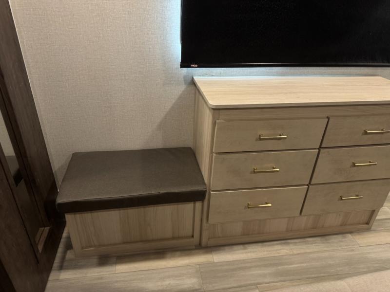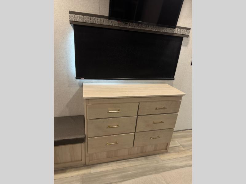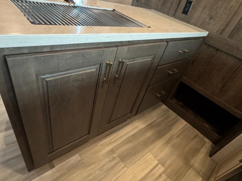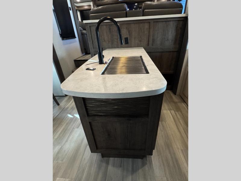 The Paradigm fifth wheel from Alliance RV is absolutely a dream to own because it combines high quality and luxury with features that you have specifically requested over the years! Some of the exterior customer-driven features are the Benchmark chassis, the G-range tires rated at 4,400 pounds, and the MorRyde CRE3000 suspension, and the Paradigm offers some of the industry's largest tank sizes at 98 gallons for fresh water and 106 gallons for gray water. The PVC roof covering will do an excellent job at protecting your RV from water intrusion, and it has increased solar reflectivity. You won't find any carpet in the Paradigm, and another great feature that has been reconstructed to meet the customer's needs is the flush-floor slide. The soft-close doors and drawers with magnetic catch are a high-end residential feature that isn't typically found on other RVs, and the excellent hidden storage capabilities of the Paradigm will surprise you when you find them.