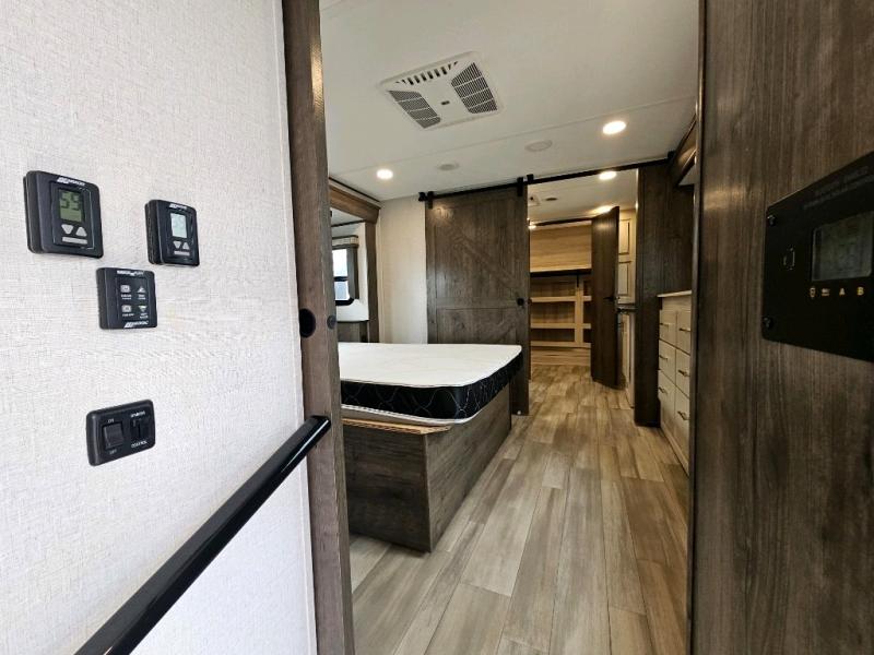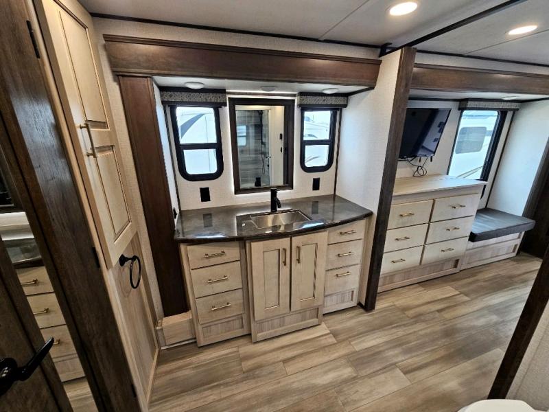 This Paradigm fifth wheel is an absolute dream! Whether it's the sunlight streaming in through the Atrium windows, or it's the bright LED dimmable lighting on the interior, you will find illumination all throughout this unit. The backlit crown molding in the living area provides an elegant feel to this already stylish fifth wheel, and modern technology is abundant with the two Smart TVs, USB charging ports, and LED motion lights in the pantry. You will be completely set for full-time living with the preparations for a dishwasher and the preparations for a washer/dryer, and the hamper in the walk-in closet will make it easy to keep your dirty clothes out of sight.