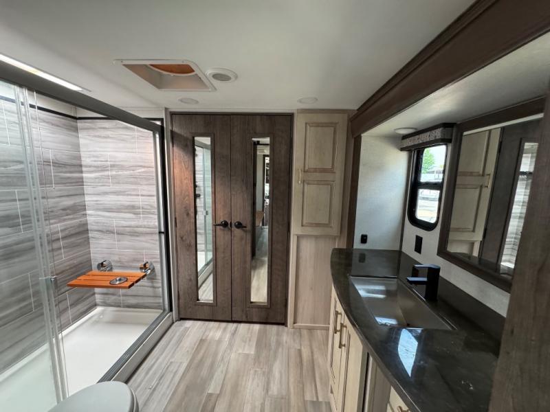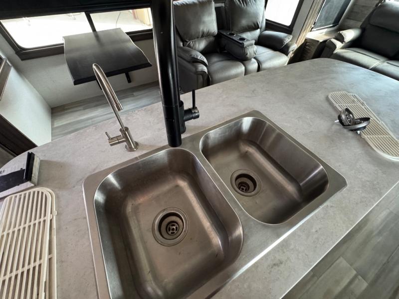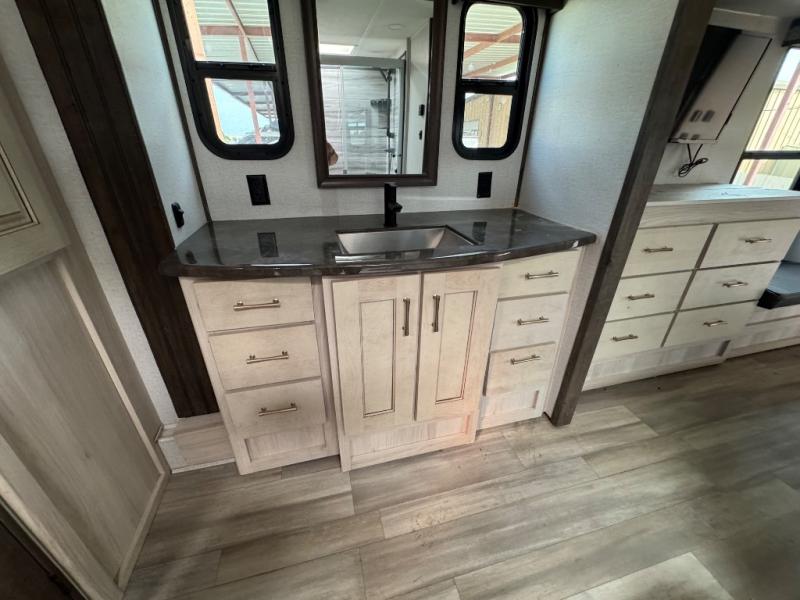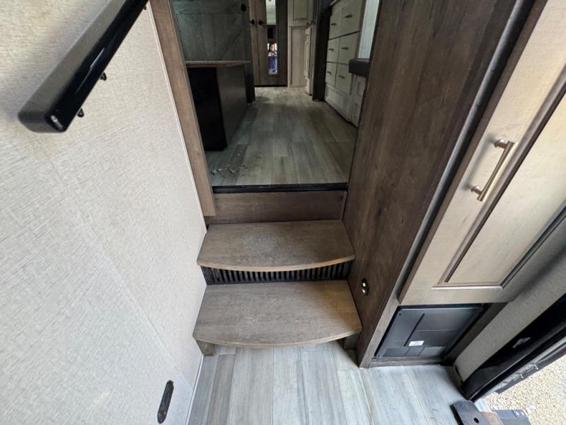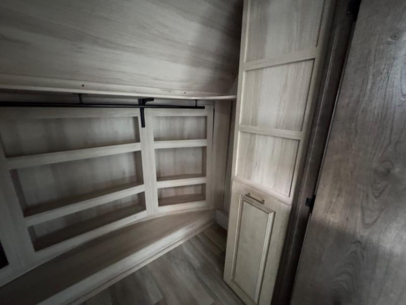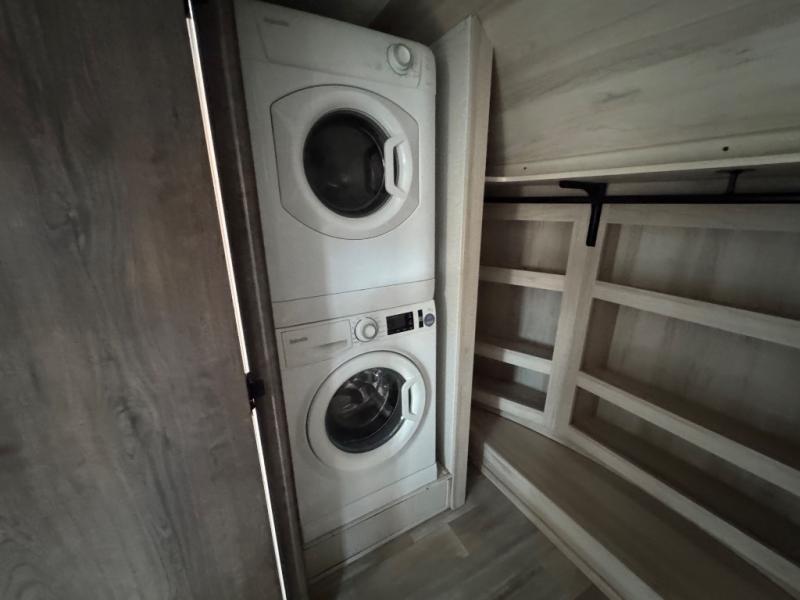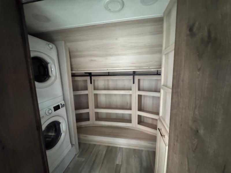 This Paradigm fifth wheel is an absolute dream! Whether it's the sunlight streaming in through the Atrium windows, or it's the bright LED dimmable lighting on the interior, you will find illumination all throughout this unit. The backlit crown molding in the living area provides an elegant feel to this already stylish fifth wheel, and modern technology is abundant with the two Smart TVs, USB charging ports, and LED motion lights in the pantry. You will be completely set for full-time living with the preparations for a dishwasher and the preparations for a washer/dryer, and the hamper in the walk-in closet will make it easy to keep your dirty clothes out of sight.