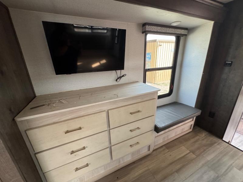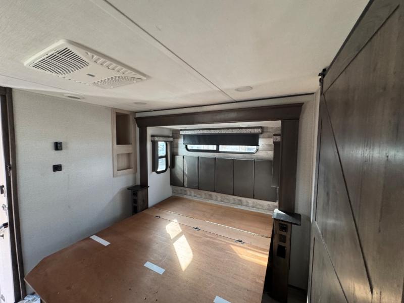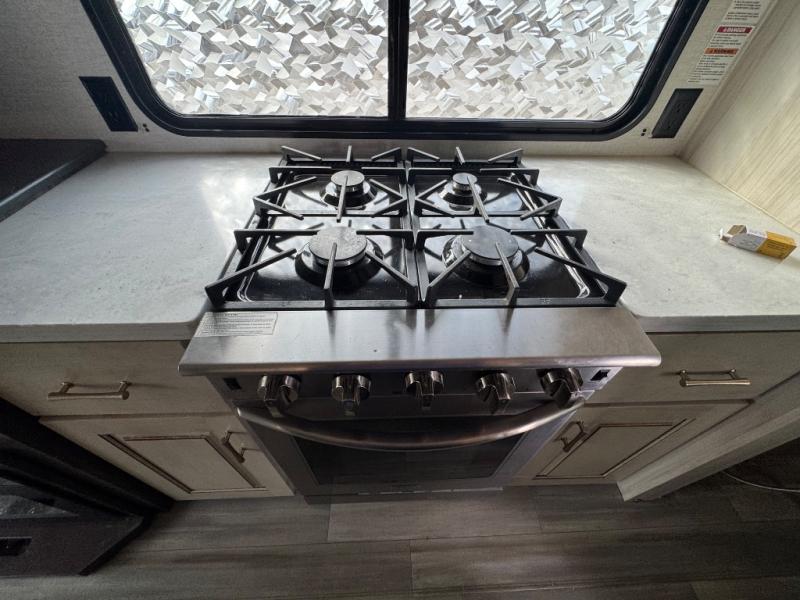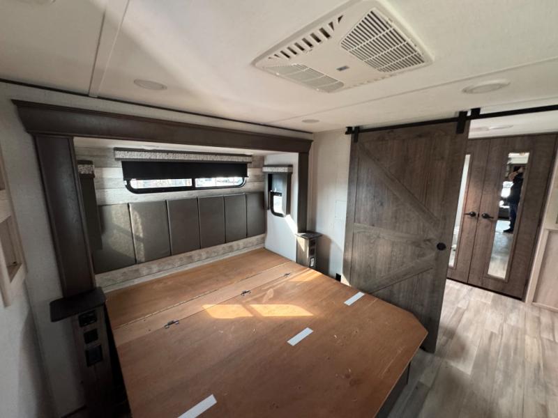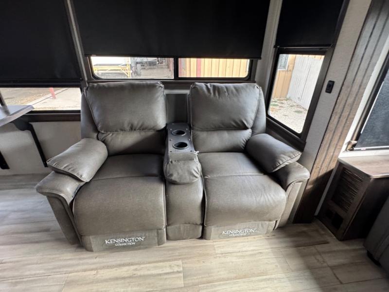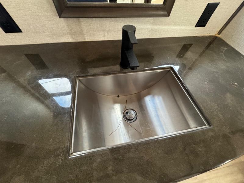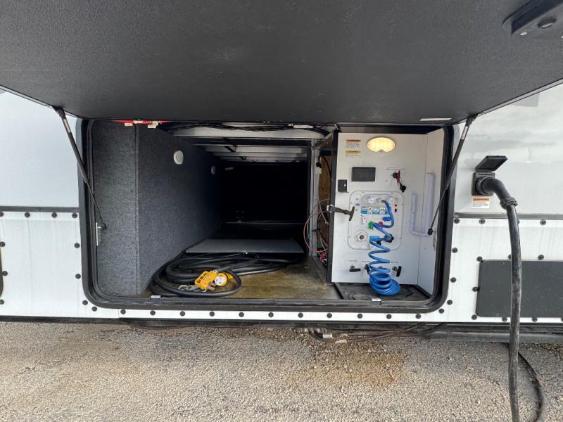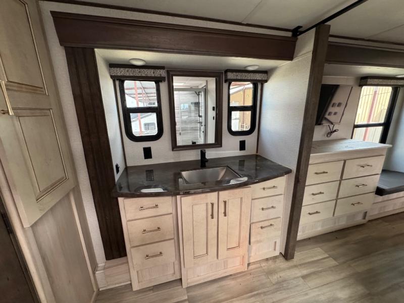 This Paradigm fifth wheel is an absolute dream! Whether it's the sunlight streaming in through the Atrium windows, or it's the bright LED dimmable lighting on the interior, you will find illumination all throughout this unit. The backlit crown molding in the living area provides an elegant feel to this already stylish fifth wheel, and modern technology is abundant with the two Smart TVs, USB charging ports, and LED motion lights in the pantry. You will be completely set for full-time living with the preparations for a dishwasher and the preparations for a washer/dryer, and the hamper in the walk-in closet will make it easy to keep your dirty clothes out of sight.