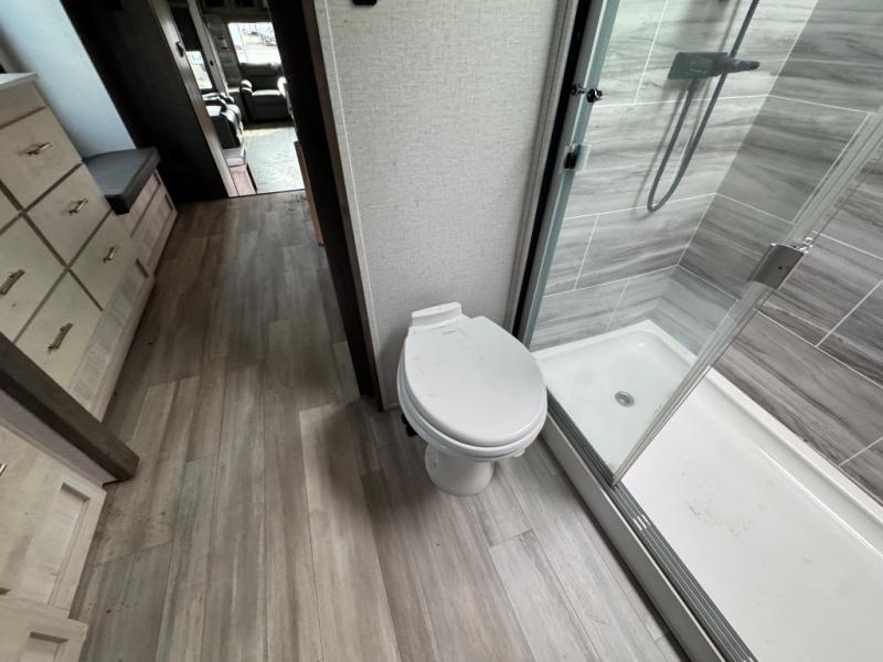 The Paradigm fifth wheel from Alliance RV is absolutely a dream to own because it combines high quality and luxury with features that you have specifically requested over the years! Some of the exterior customer-driven features are the Benchmark chassis, the G-range tires rated at 4,400 pounds, and the MorRyde CRE3000 suspension, and the Paradigm offers some of the industry's largest tank sizes at 98 gallons for fresh water and 106 gallons for gray water. The PVC roof covering will do an excellent job at protecting your RV from water intrusion, and it has increased solar reflectivity. You won't find any carpet in the Paradigm, and another great feature that has been reconstructed to meet the customer's needs is the flush-floor slide. The soft-close doors and drawers with magnetic catch are a high-end residential feature that isn't typically found on other RVs, and the excellent hidden storage capabilities of the Paradigm will surprise you when you find them.
