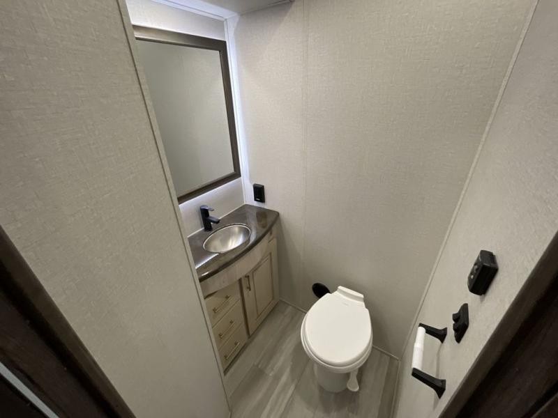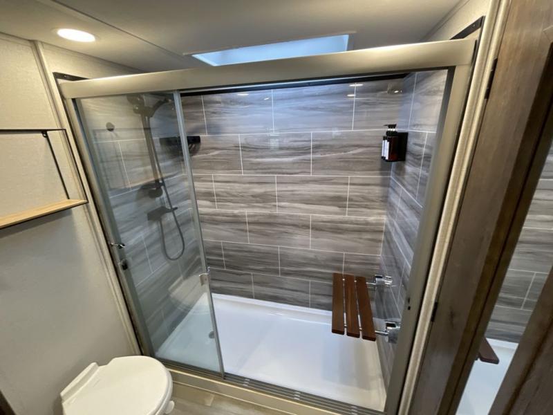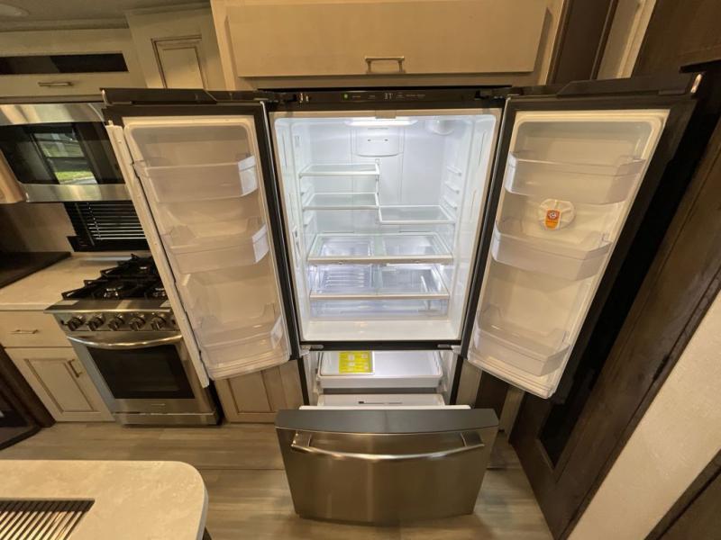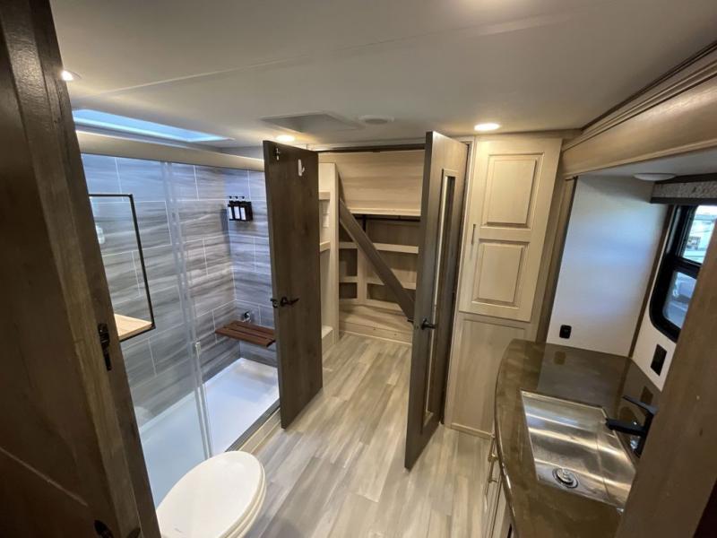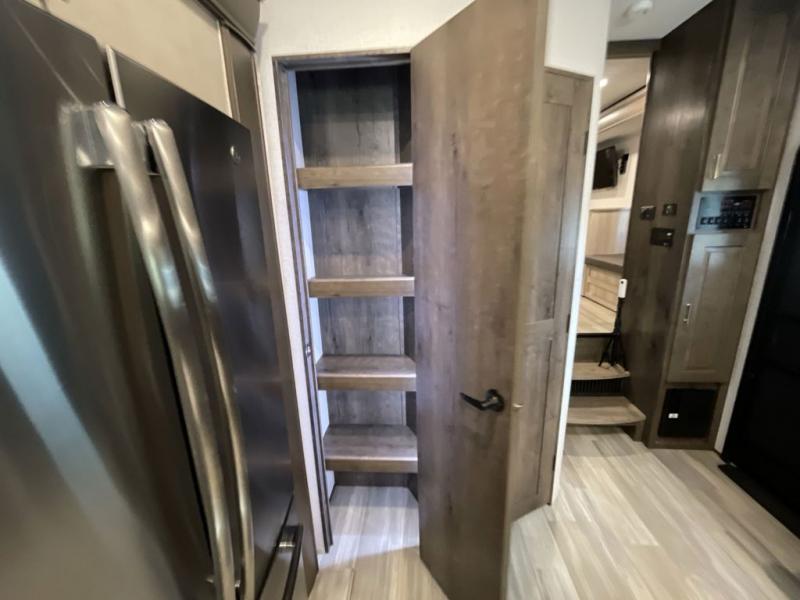 This Paradigm fifth wheel is an absolute dream! Whether it's the sunlight streaming in through the Atrium windows, or it's the bright LED dimmable lighting on the interior, you will find illumination all throughout this unit. The backlit crown molding in the living area provides an elegant feel to this already stylish fifth wheel, and modern technology is abundant with the two Smart TVs, USB charging ports, and LED motion lights in the pantry. You will be completely set for full-time living with the preparations for a dishwasher and the preparations for a washer/dryer, and the hamper in the walk-in closet will make it easy to keep your dirty clothes out of sight.