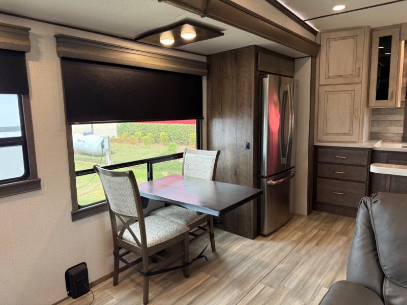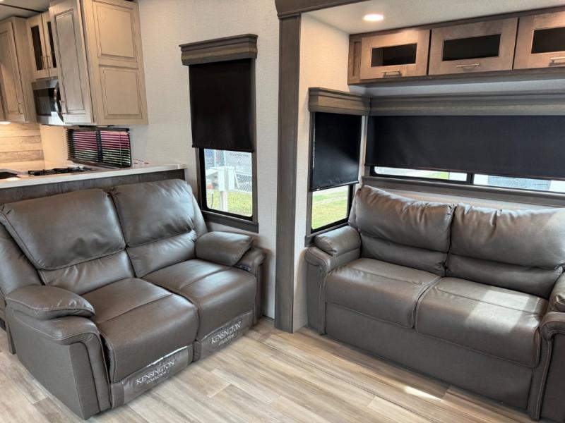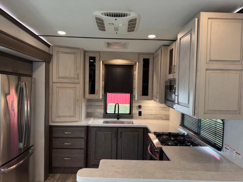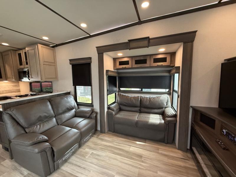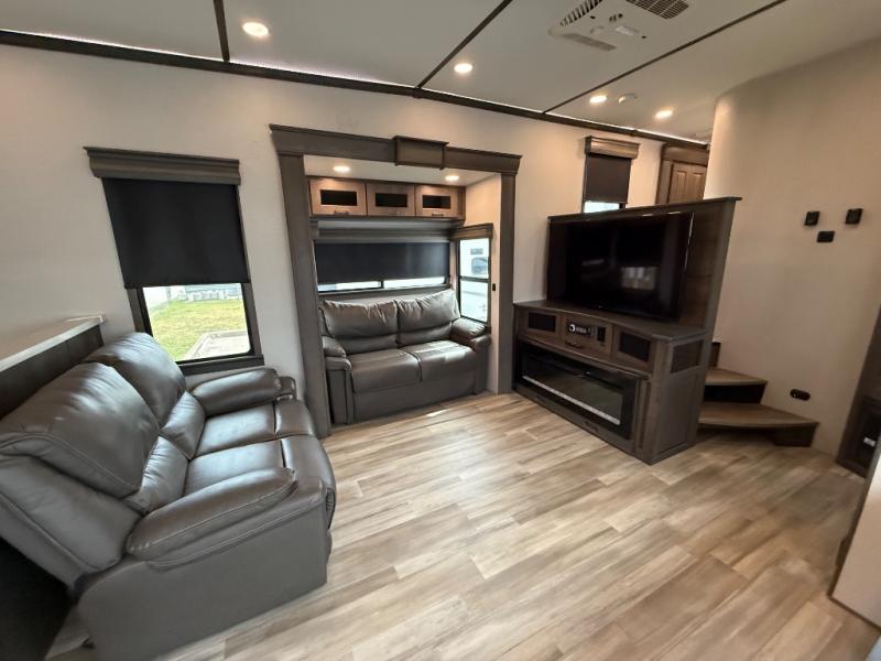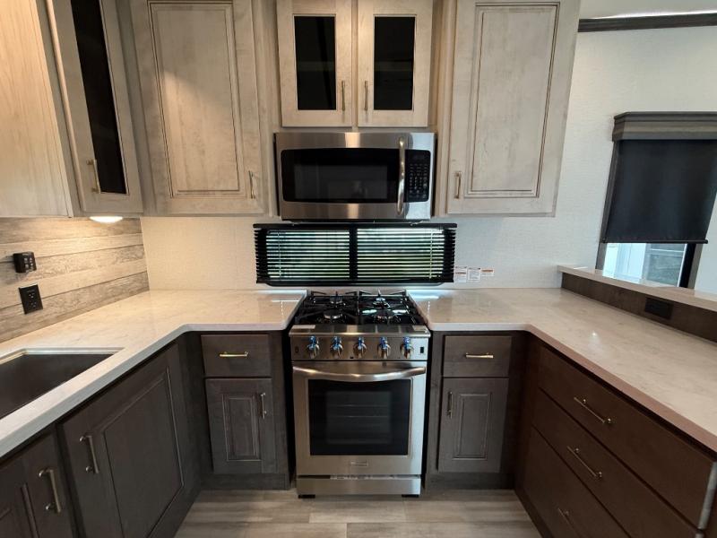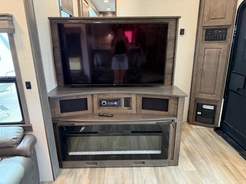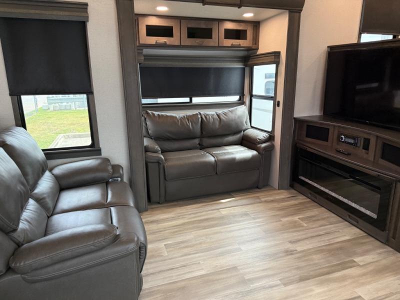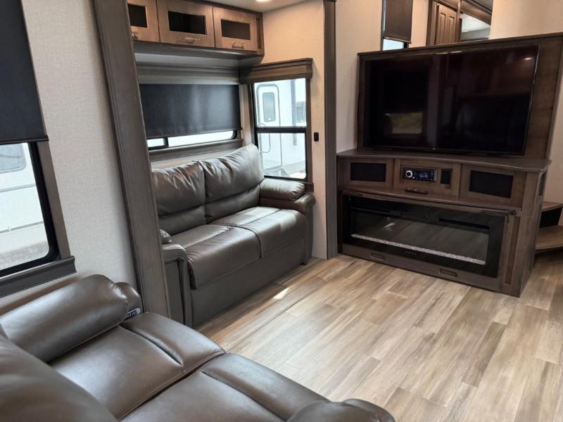 This Paradigm fifth wheel has an amazing rear kitchen that will make it both easy and enjoyable to prepare dinner each evening! The Insignia microwave, Insignia four-burner range, 3.73 cubic foot oven, 18 cubic foot refrigerator, and preparations for a dishwasher are just a few of the features that truly make this kitchen great. You can sit down at the floating dinette table with chairs to enjoy that meal, or you can head into the living room to sit back on the sleeper sofas or the dual recliner love seat. The dimmable LED lighting makes it easy to adjust the brightness level of the interior, and the two Smart TVs are super convenient to have when you have to stay inside because of the rain.