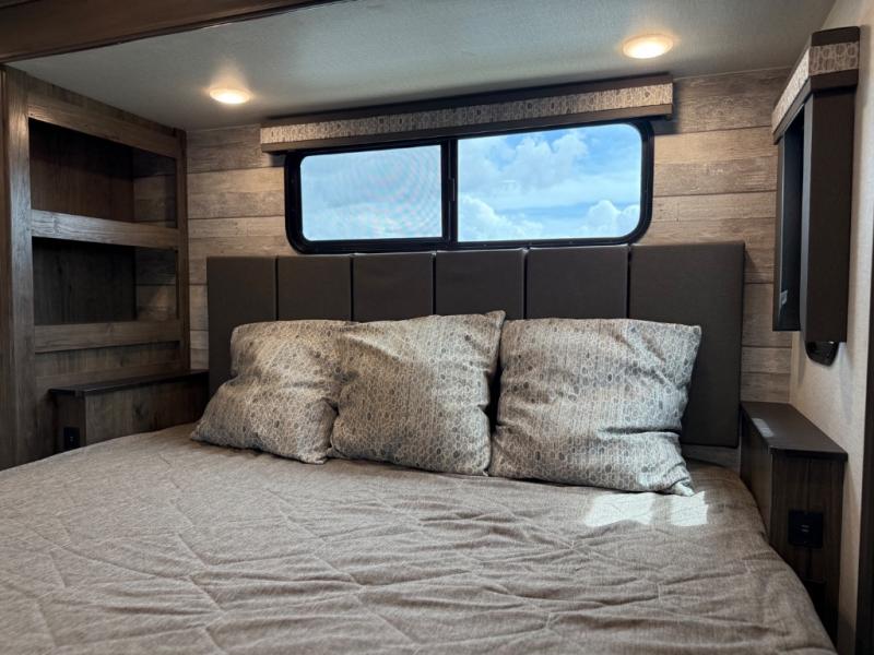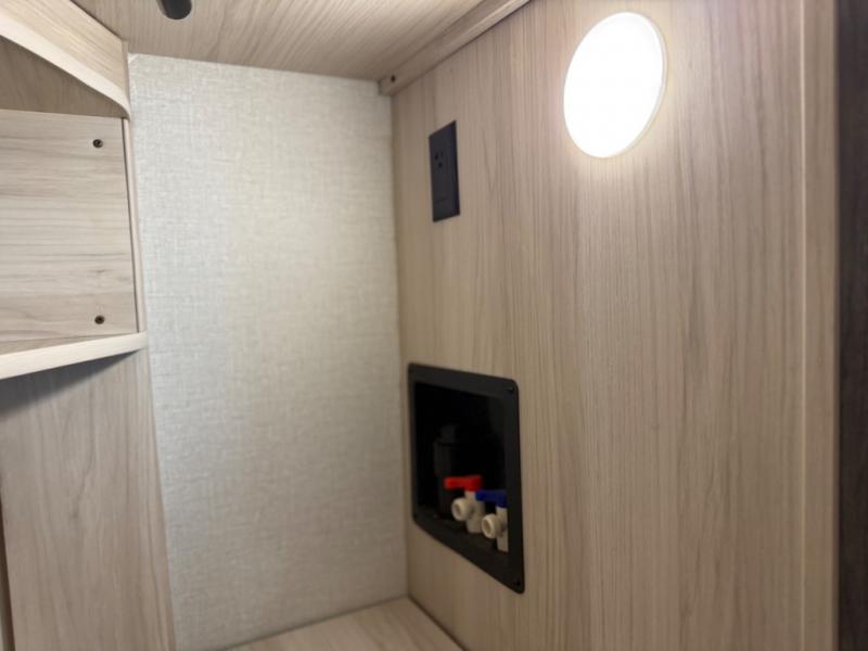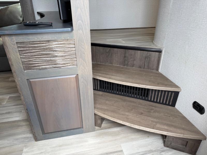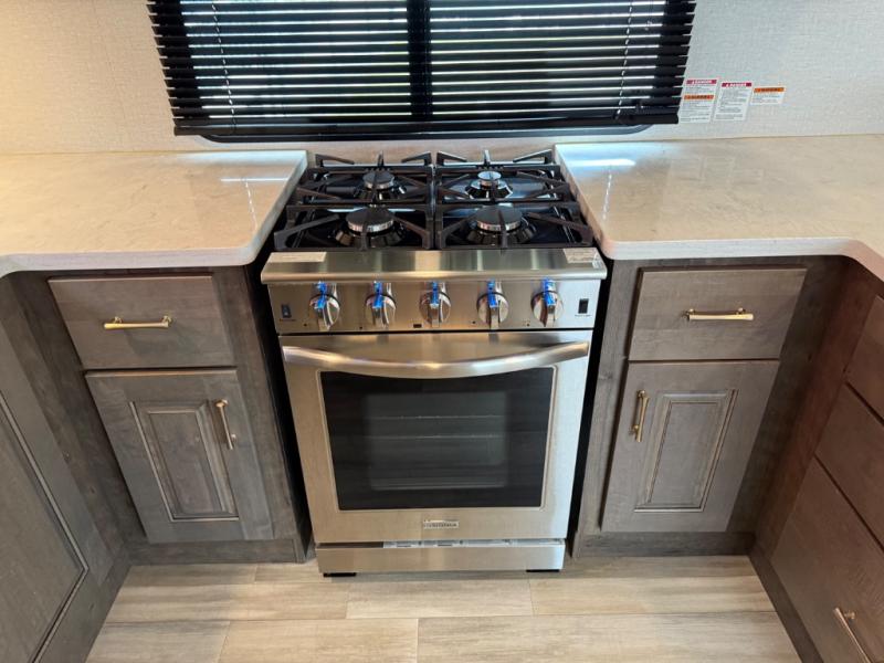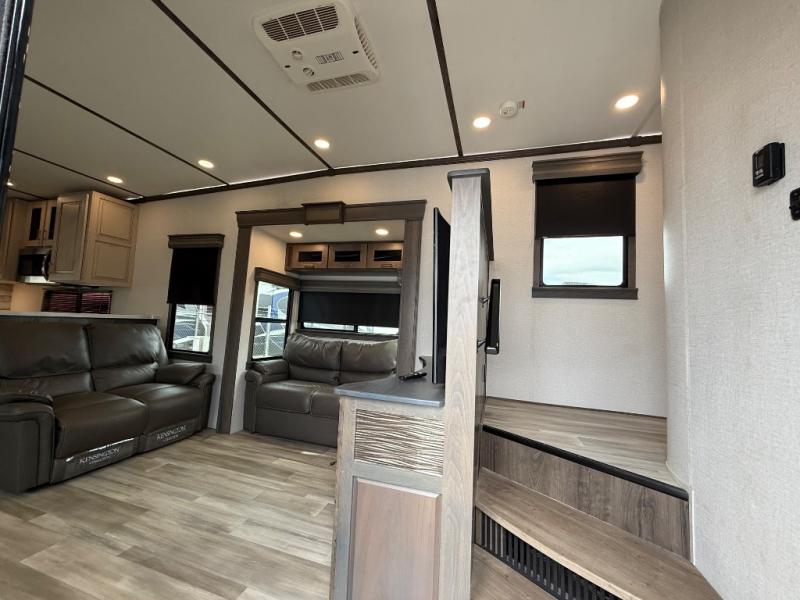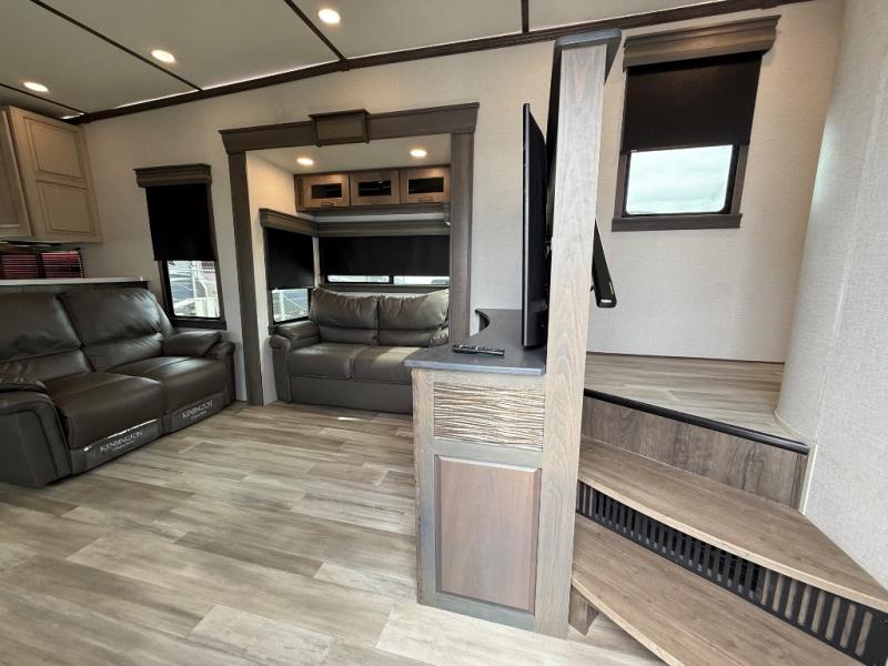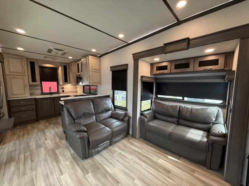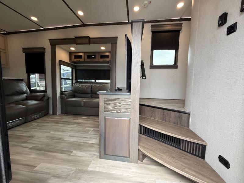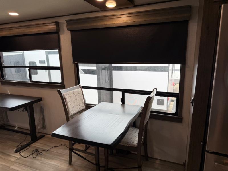 This Paradigm fifth wheel has an amazing rear kitchen that will make it both easy and enjoyable to prepare dinner each evening! The Insignia microwave, Insignia four-burner range, 3.73 cubic foot oven, 18 cubic foot refrigerator, and preparations for a dishwasher are just a few of the features that truly make this kitchen great. You can sit down at the floating dinette table with chairs to enjoy that meal, or you can head into the living room to sit back on the sleeper sofas or the dual recliner love seat. The dimmable LED lighting makes it easy to adjust the brightness level of the interior, and the two Smart TVs are super convenient to have when you have to stay inside because of the rain.