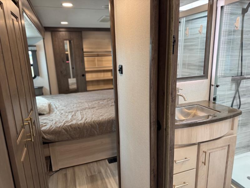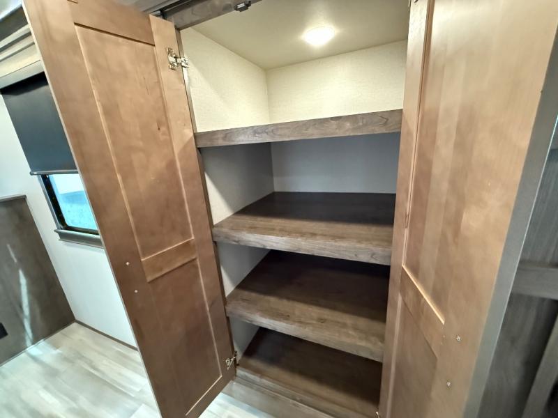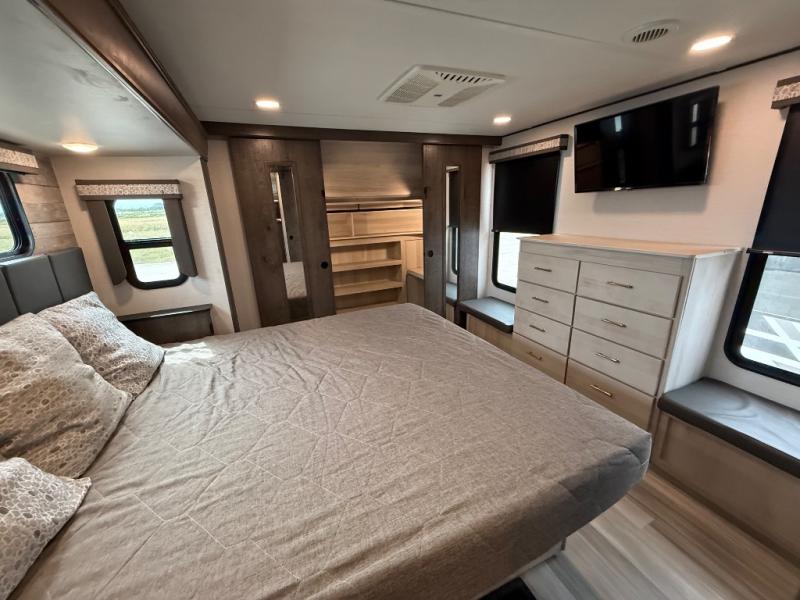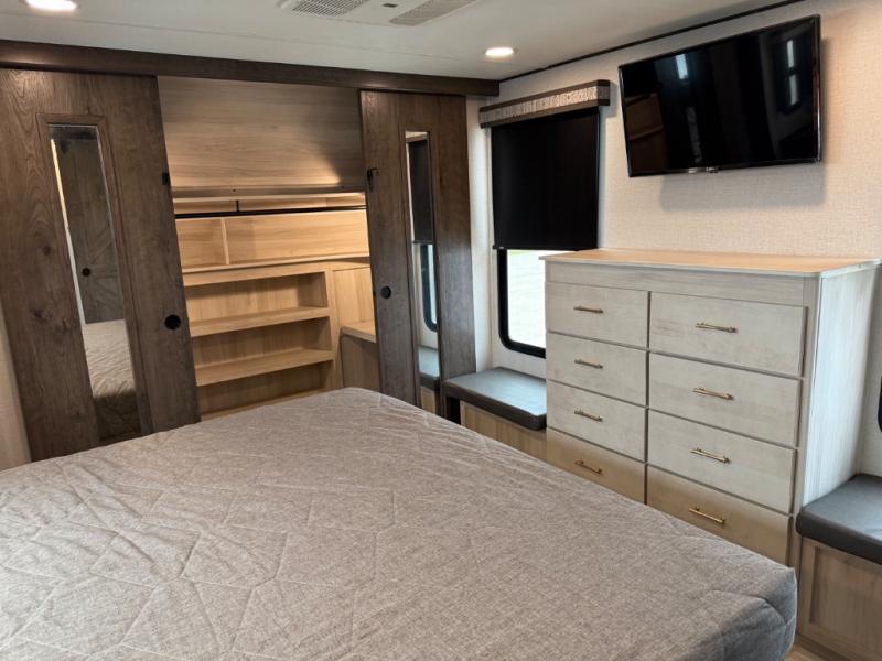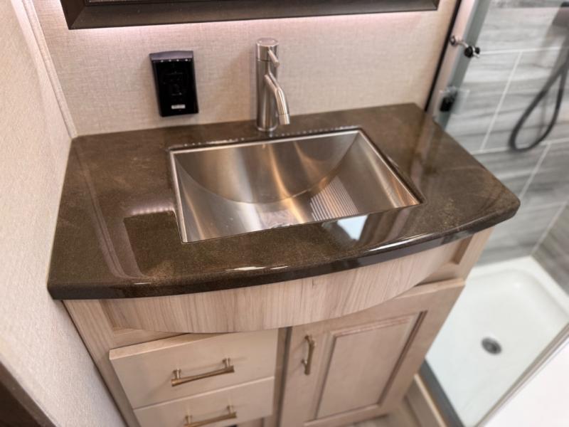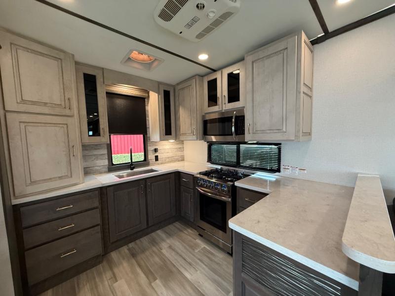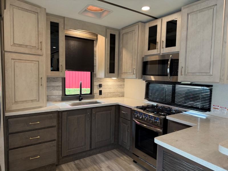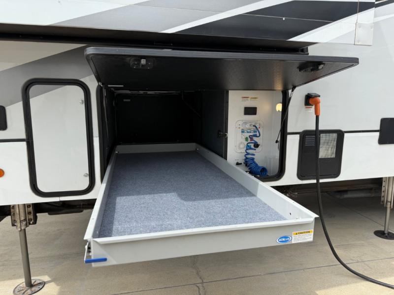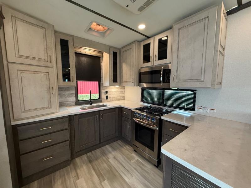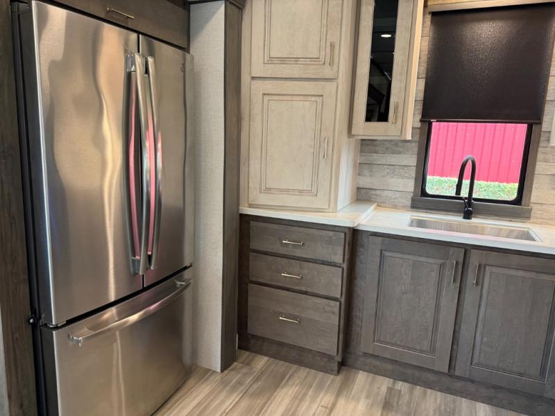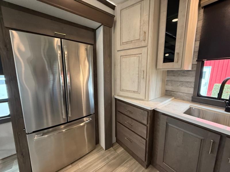 The Paradigm fifth wheel from Alliance RV is absolutely a dream to own because it combines high quality and luxury with features that you have specifically requested over the years! Some of the exterior customer-driven features are the Benchmark chassis, the G-range tires rated at 4,400 pounds, and the MorRyde CRE3000 suspension, and the Paradigm offers some of the industry's largest tank sizes at 98 gallons for fresh water and 106 gallons for gray water. The PVC roof covering will do an excellent job at protecting your RV from water intrusion, and it has increased solar reflectivity. You won't find any carpet in the Paradigm, and another great feature that has been reconstructed to meet the customer's needs is the flush-floor slide. The soft-close doors and drawers with magnetic catch are a high-end residential feature that isn't typically found on other RVs, and the excellent hidden storage capabilities of the Paradigm will surprise you when you find them.