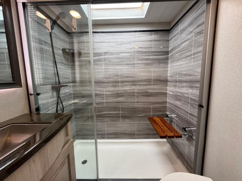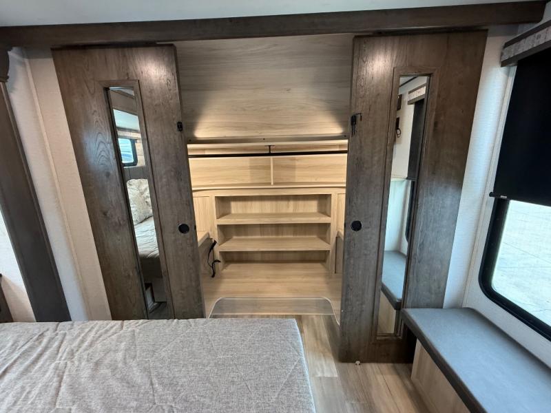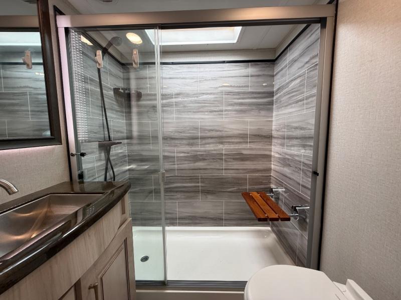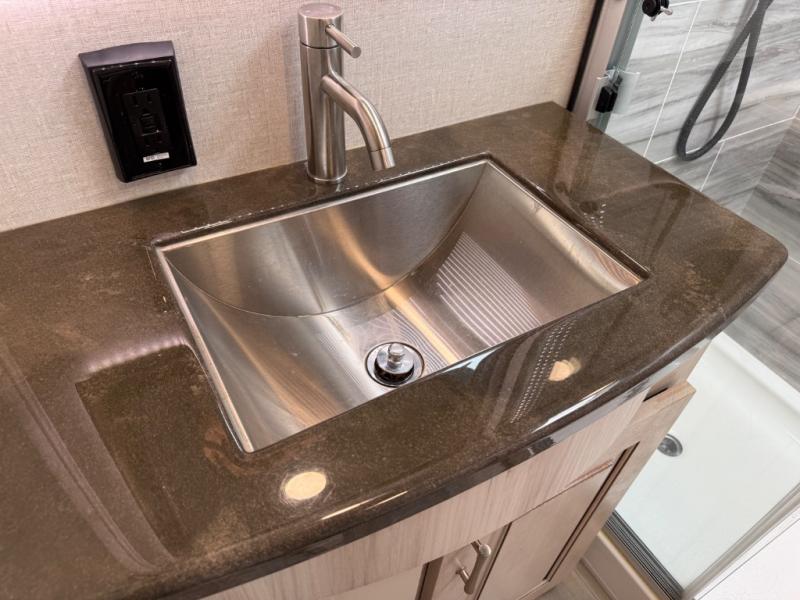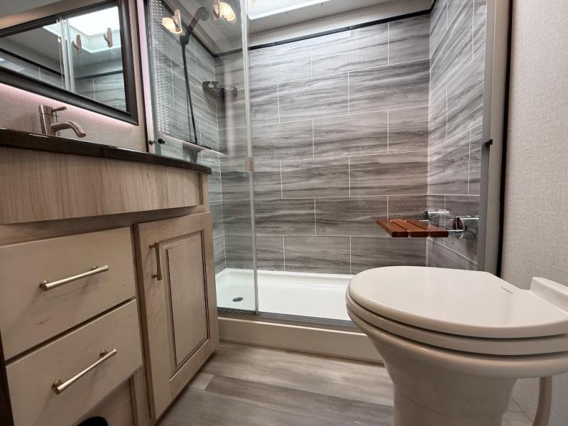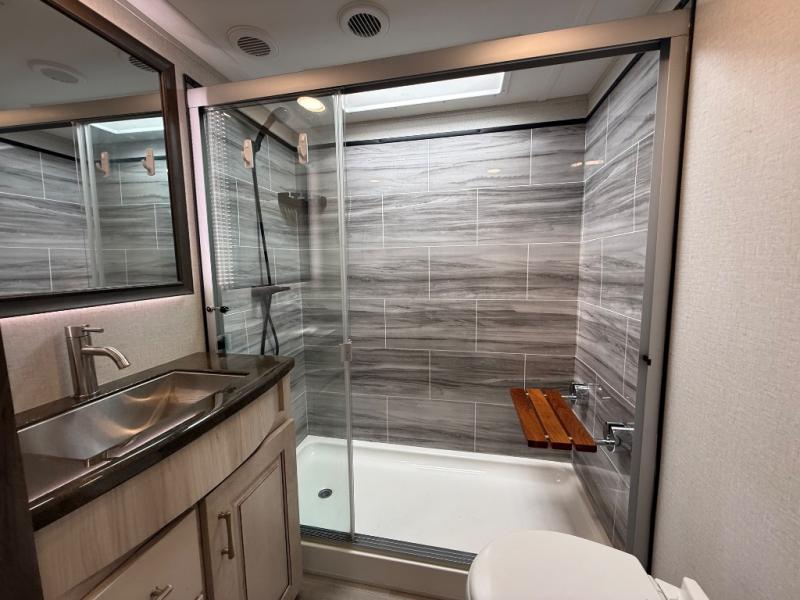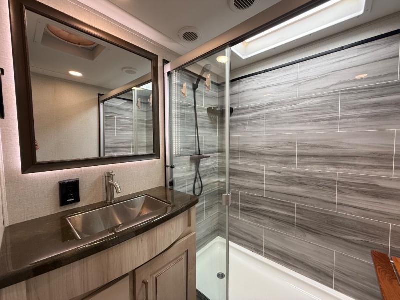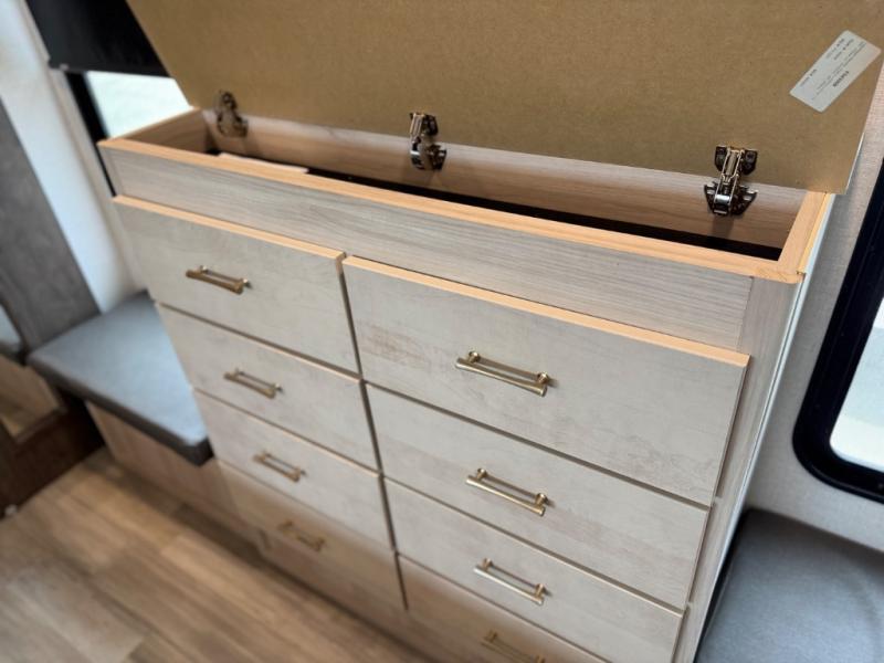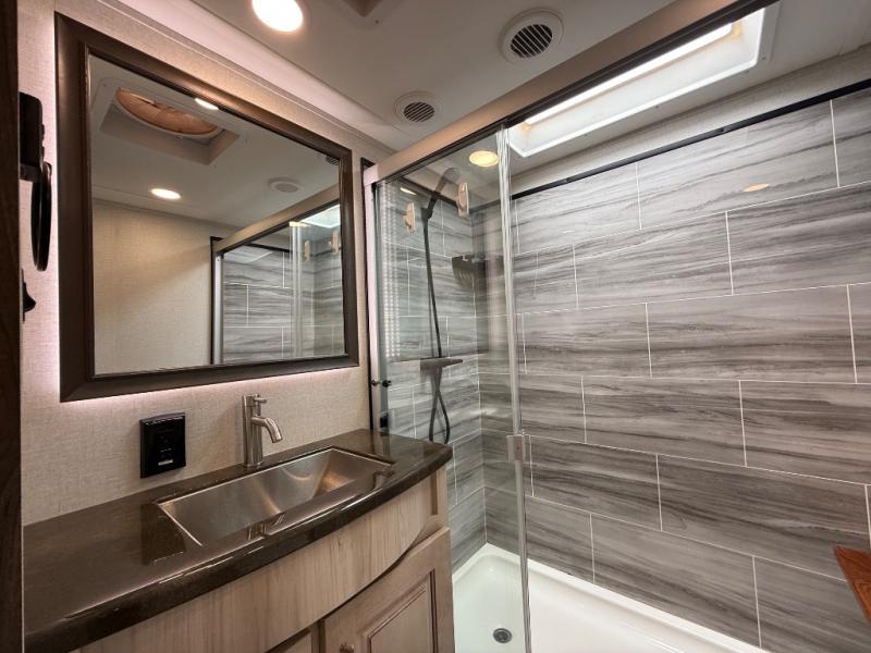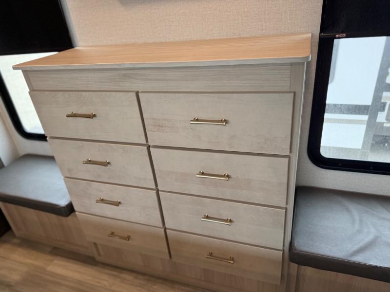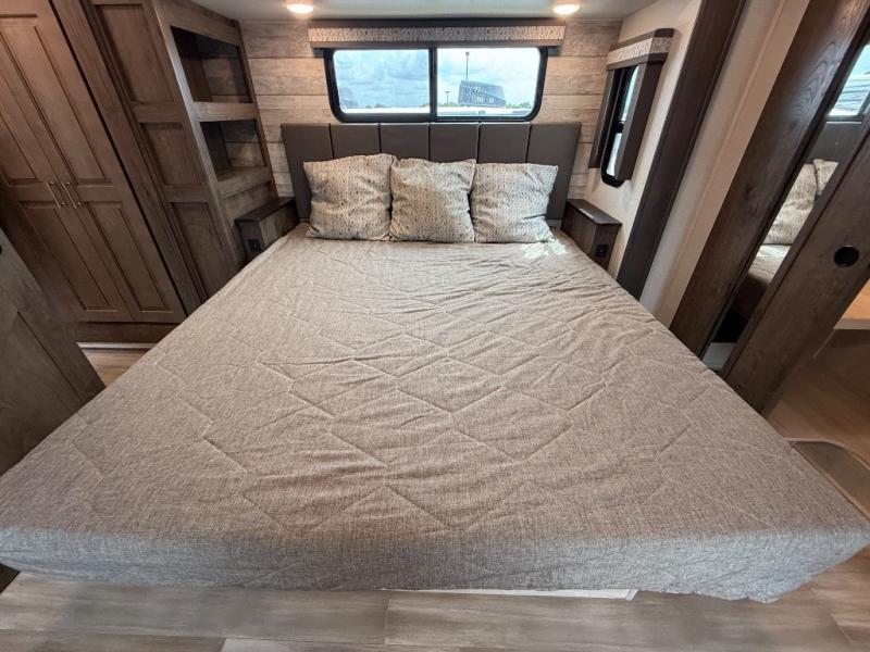 The Paradigm fifth wheel from Alliance RV is absolutely a dream to own because it combines high quality and luxury with features that you have specifically requested over the years! Some of the exterior customer-driven features are the Benchmark chassis, the G-range tires rated at 4,400 pounds, and the MorRyde CRE3000 suspension, and the Paradigm offers some of the industry's largest tank sizes at 98 gallons for fresh water and 106 gallons for gray water. The PVC roof covering will do an excellent job at protecting your RV from water intrusion, and it has increased solar reflectivity. You won't find any carpet in the Paradigm, and another great feature that has been reconstructed to meet the customer's needs is the flush-floor slide. The soft-close doors and drawers with magnetic catch are a high-end residential feature that isn't typically found on other RVs, and the excellent hidden storage capabilities of the Paradigm will surprise you when you find them.
