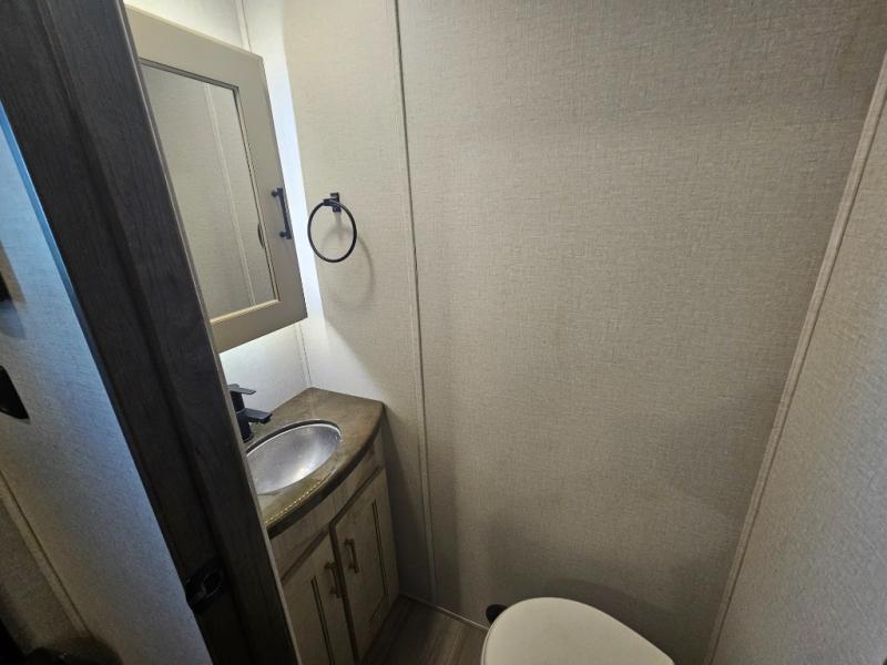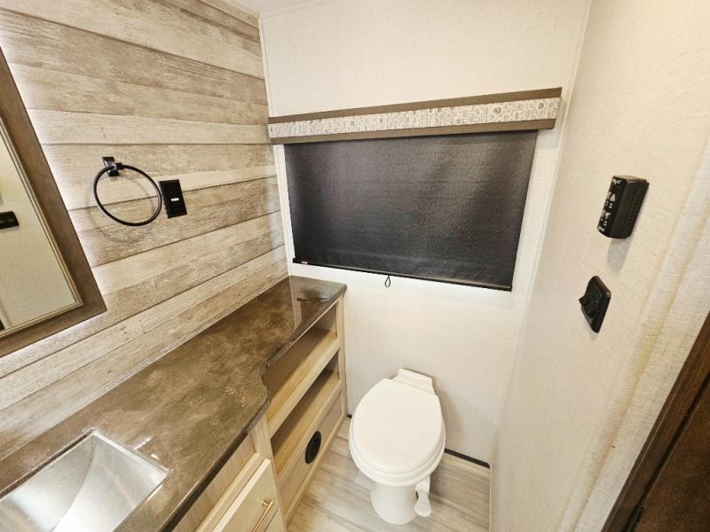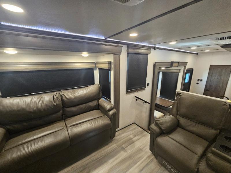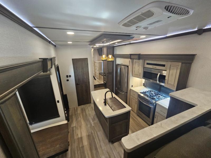 One of the most intriguing features on this Paradigm fifth wheel is the 48" x 115" basement pull-out tray because it can easily transport two kayaks! This unit also has some other extremely useful features scattered all throughout, like the preparations for a dishwasher in the kitchen, the under-step shoe storage, the dual recliner love seat in the front living room, and the pull-out fireplace at the front entertainment center. There are two Smart HDTVs in this unit so that you can enjoy a movie at the end of a long day, and the king-size bed is going to be ultra relaxing.