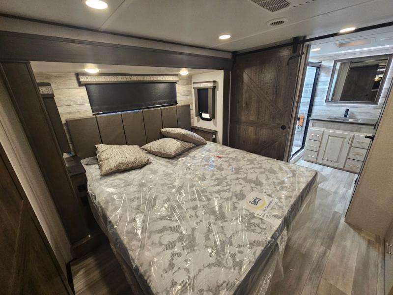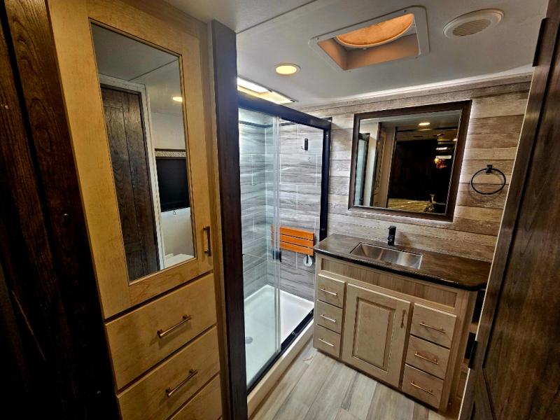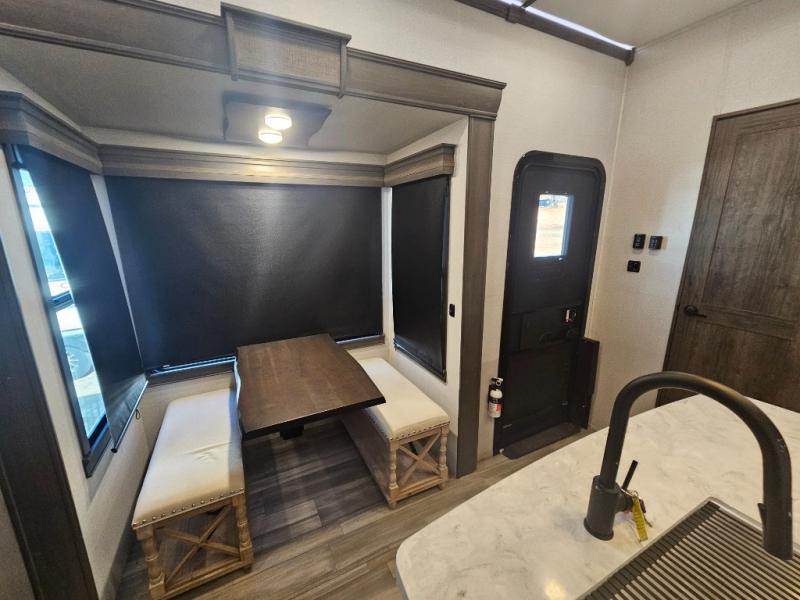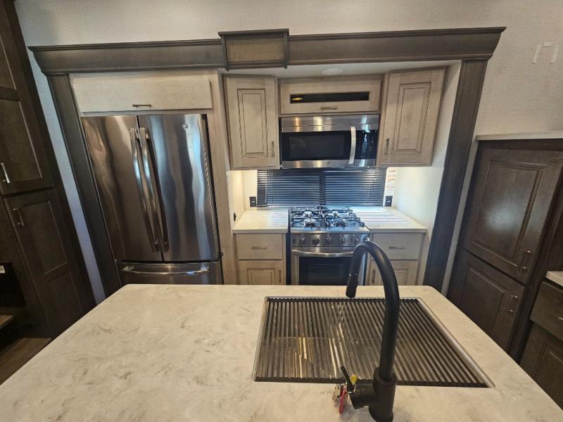 The Paradigm fifth wheel from Alliance RV is absolutely a dream to own because it combines high quality and luxury with features that you have specifically requested over the years! Some of the exterior customer-driven features are the Benchmark chassis, the G-range tires rated at 4,400 pounds, and the MorRyde CRE3000 suspension, and the Paradigm offers some of the industry's largest tank sizes at 98 gallons for fresh water and 106 gallons for gray water. The PVC roof covering will do an excellent job at protecting your RV from water intrusion, and it has increased solar reflectivity. You won't find any carpet in the Paradigm, and another great feature that has been reconstructed to meet the customer's needs is the flush-floor slide. The soft-close doors and drawers with magnetic catch are a high-end residential feature that isn't typically found on other RVs, and the excellent hidden storage capabilities of the Paradigm will surprise you when you find them.
