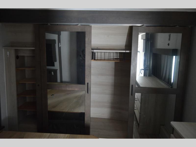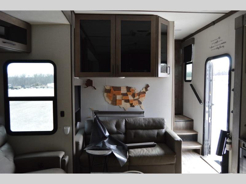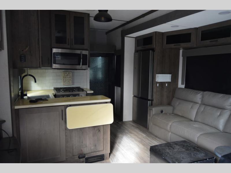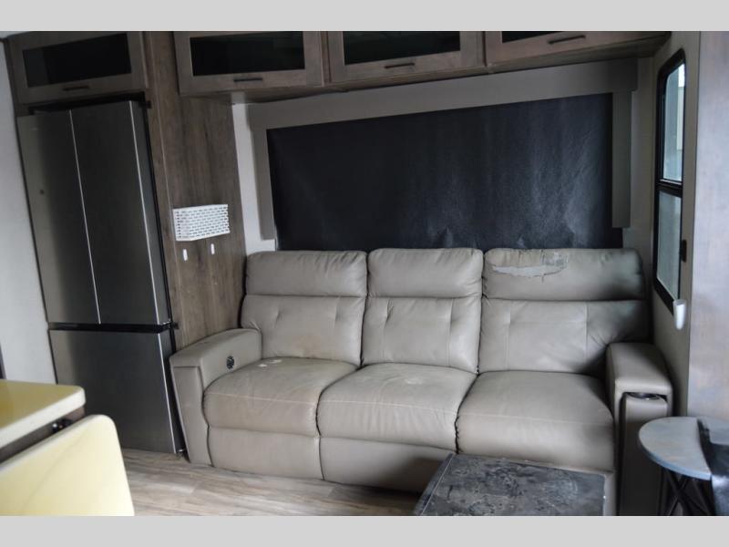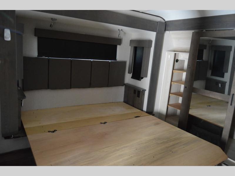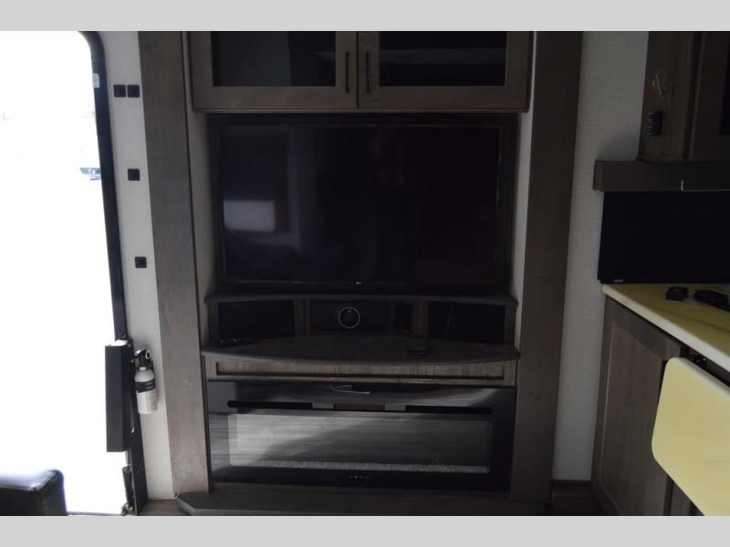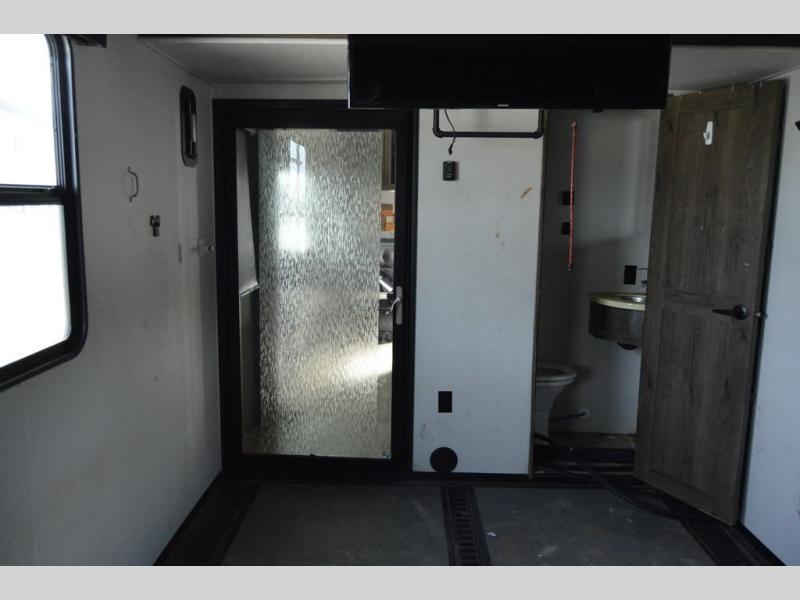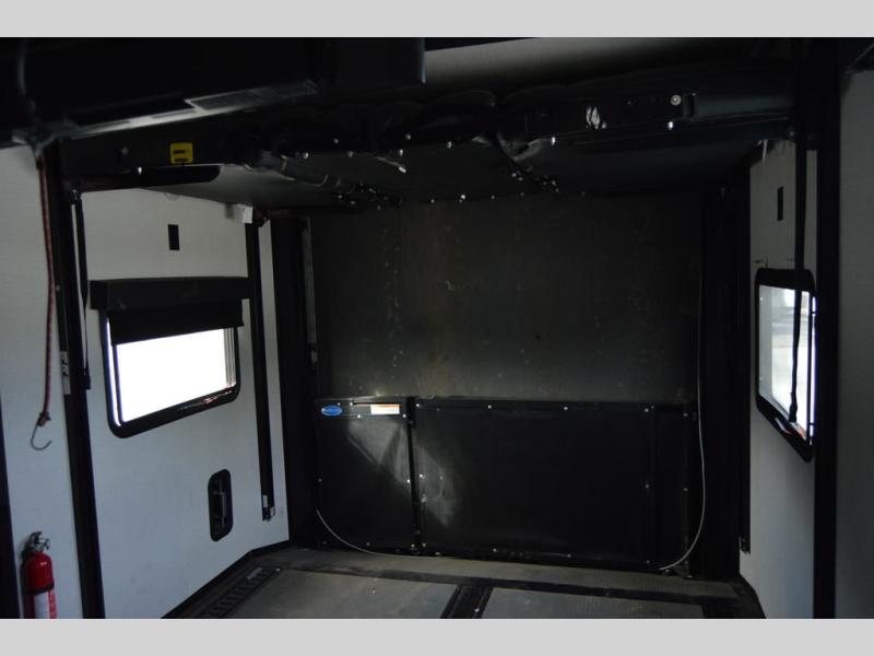 With this Valor fifth wheel toy hauler, there is practically nothing stopping you from having the best adventures! You will have endless nights of fun in the living area that has two sofas, a fireplace, and a Smart TV, and since the kitchen is also included in this space, you can get up to make a little snack while still being involved in the party. Get away for a little relaxation in the front master suite. The bedroom has a king-size bed slide for some extra space and comfort, and the full-width wardrobe will easily be able to store your clothing. The other area that is decked out to perfection is the 13' separate garage. The garage has two roll-over sofas, a queen-size bunk, a half bathroom, and the second exterior entry door, and just outside of that entry door is where you will find an air compressor on the exterior.
