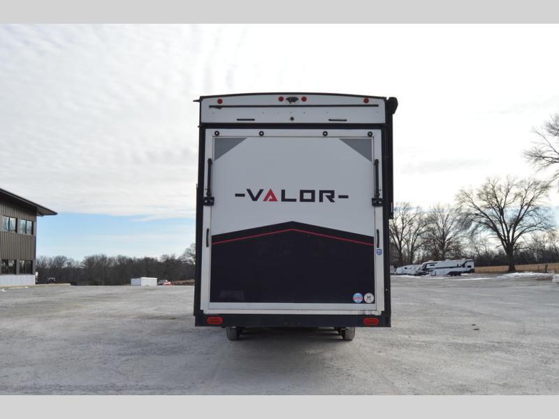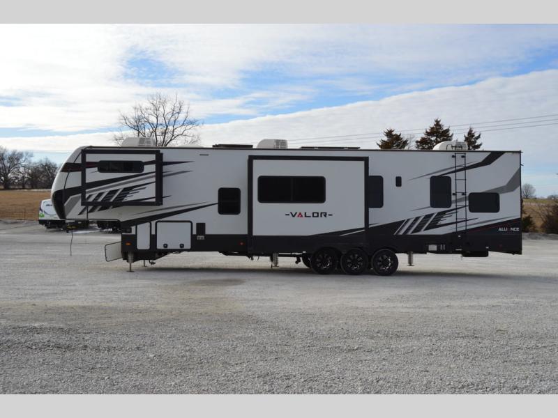 The Alliance RV Valor fifth wheel toy hauler is courageously bold and determined! The Valor has some of the best features, and you have to see them for yourself. The fully weather-resistant ramp door is an industry-first, and another industry-first is the standard solar package that has a monitor system enabling you to see the battery life in real time. The fully insulated garage has a dedicated A/C and electronic heat source so that your gear can remain fully protected, and the Epoxy-poured countertops are extremely lightweight. The Valor has the most efficient and effective A/C system that produces great cooling power with the least amount of ductwork, and the flush-floor slides are completely free of carpet for your benefit. Plus, as another industry-exclusive, the Valor has its very own air compressor on board so that you can have your own air supply for your toys or other gear.