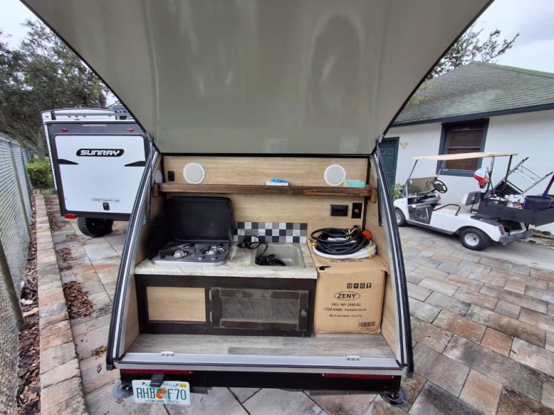 Exterior Kitchenette: Located under a rear hatch, typically includes a 2-burner gas cooktop, built-in sink, and a Coleman 12V cooler/refrigerator.
