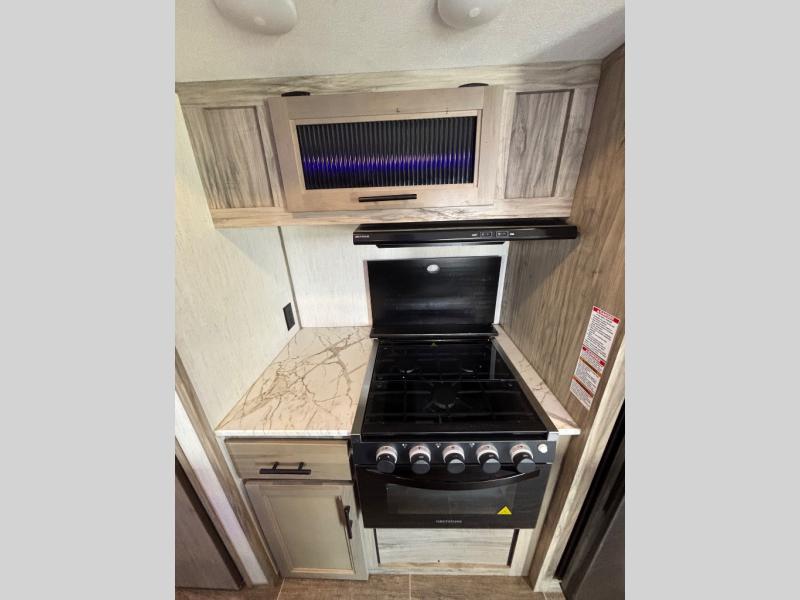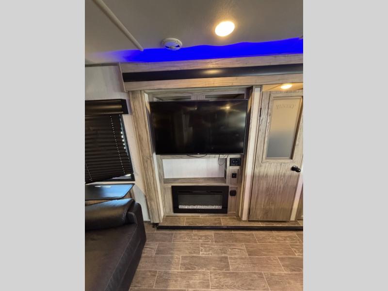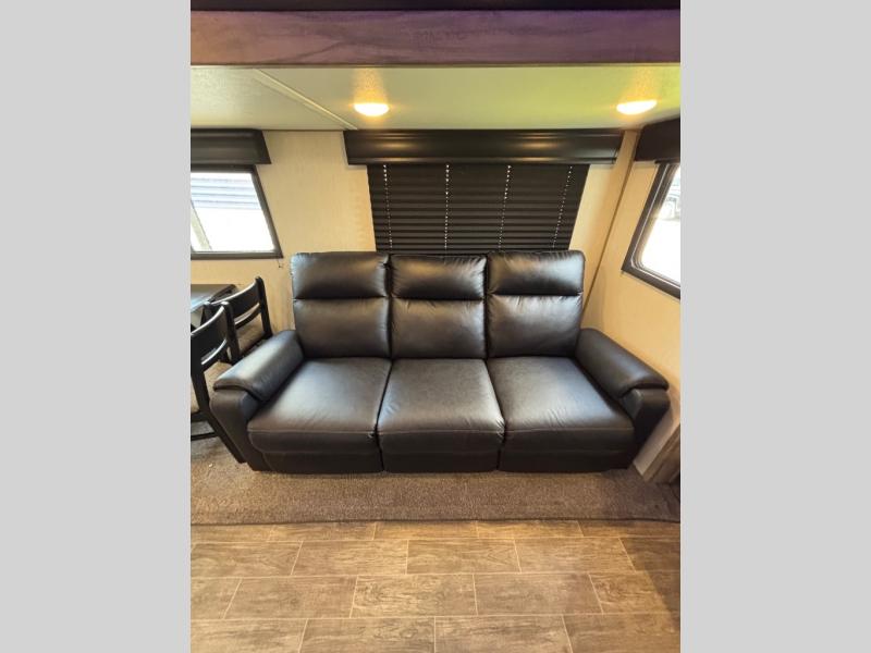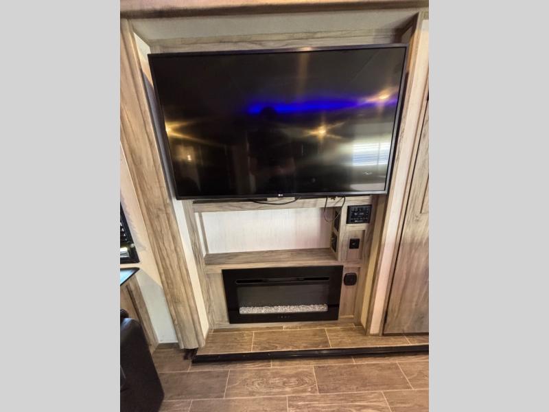 Come see how popular and spacious this couples travel trailer is! An extra guest or two can join in on the fun too with the rear tri-fold hide-a-bed sofa to convert into a sleeping space. The chef of your group will have an easy time preparing dinner with the kitchen island, and the coffee lover will appreciate the coffee bar. The free standing table comes with four chairs to enjoy your meals at, and after dinner you can relax at the home theatre seating for a relaxing, heated massage with a cozy fire roaring in the electric fireplace. Everyone can easily access the dual entry bathroom and take a hot shower in the radius shower with a skylight above to let in some natural lighting, plus you can head right into the front private bedroom from the bathroom. Grab your pajamas from one of the shirt closets on either side of the queen bed, and if you choose to add the optional TV then you can watch your favorite movie in true relaxation!