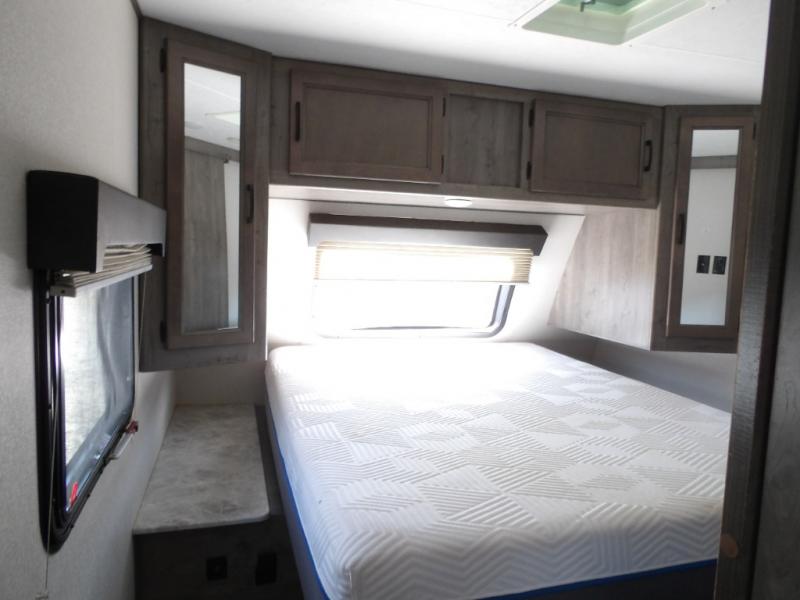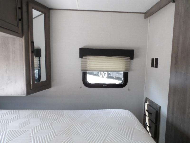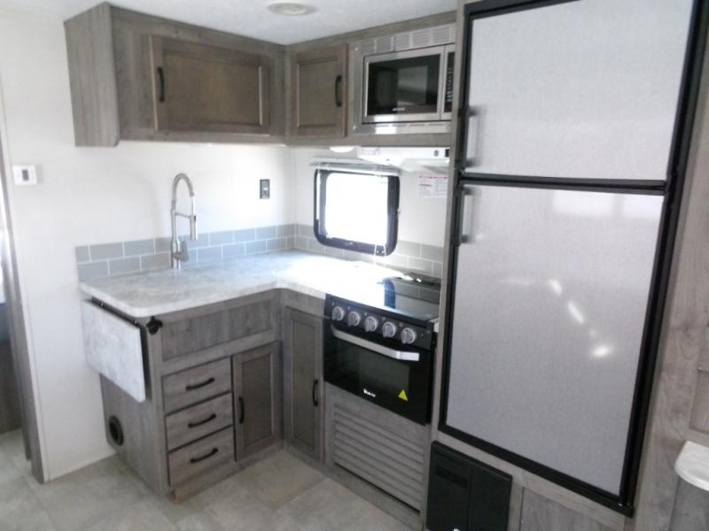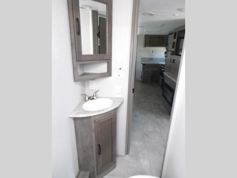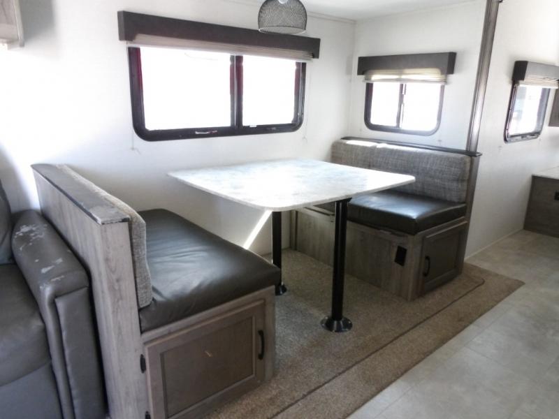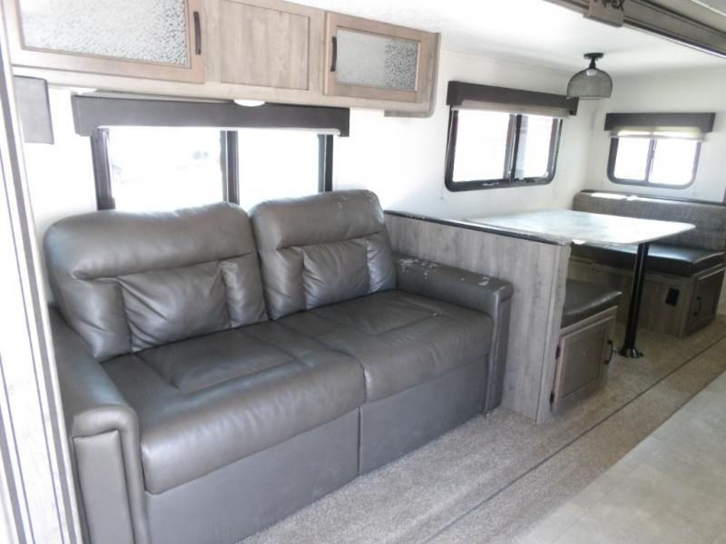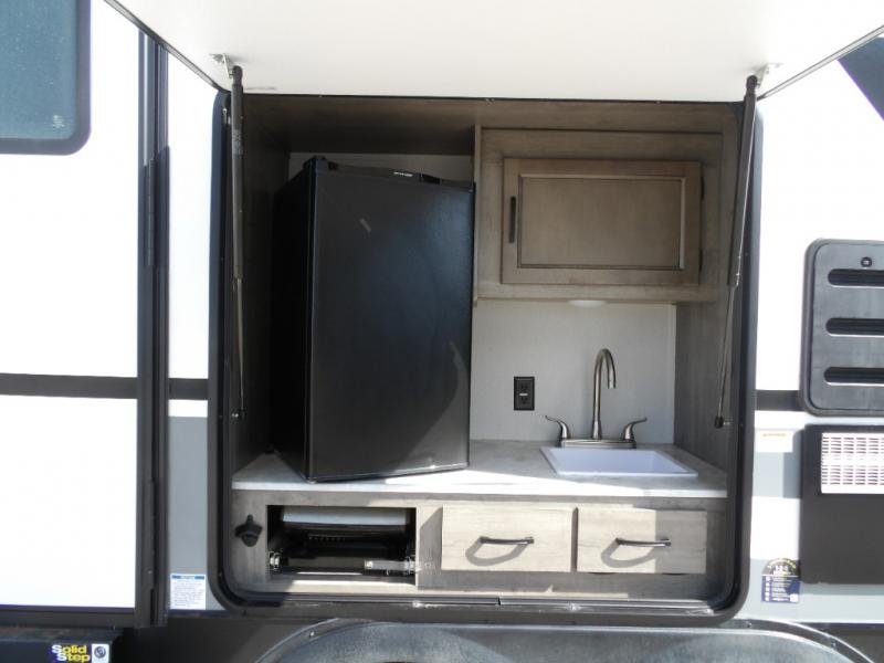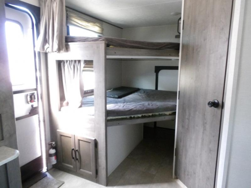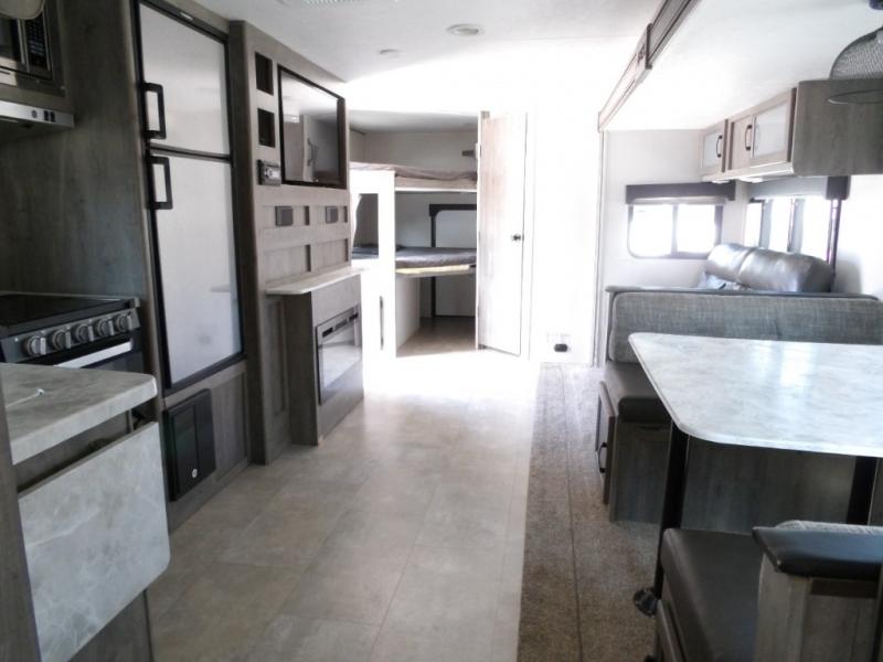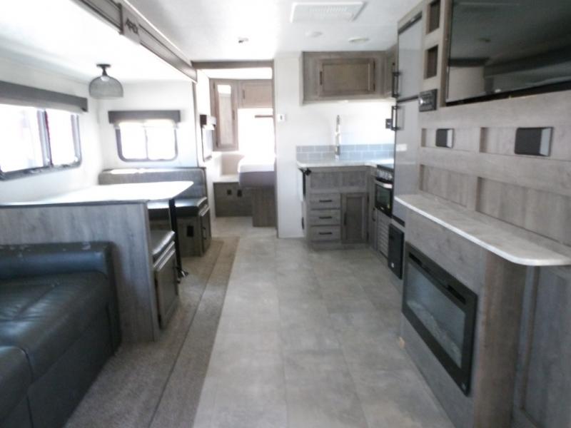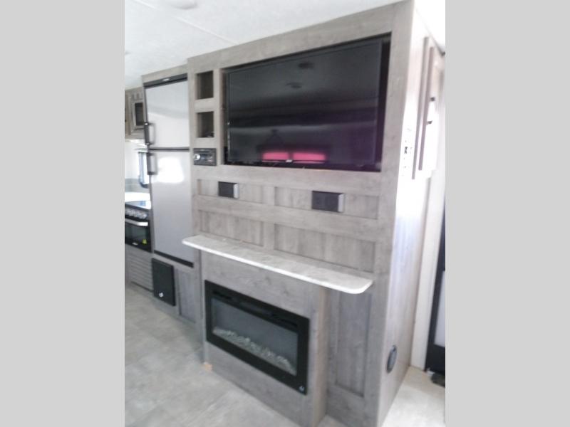 Make camping trips that will last a lifetime with this spacious travel trailer in tow. Your crew will love to relax in the main living area that includes a large slide out, a convertible U-shaped dinette, plus a fireplace and entertainment center. The double-size bunks will be perfect for your guests, and since the lower bunk flips up, you can bring along the kayak or bikes. There is a fully-equipped indoor kitchen with a three burner cooktop and a microwave oven, and check out the outside kitchen under the 18' power awning with LED lights!