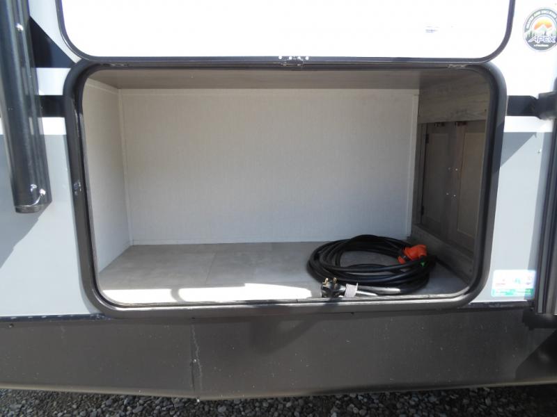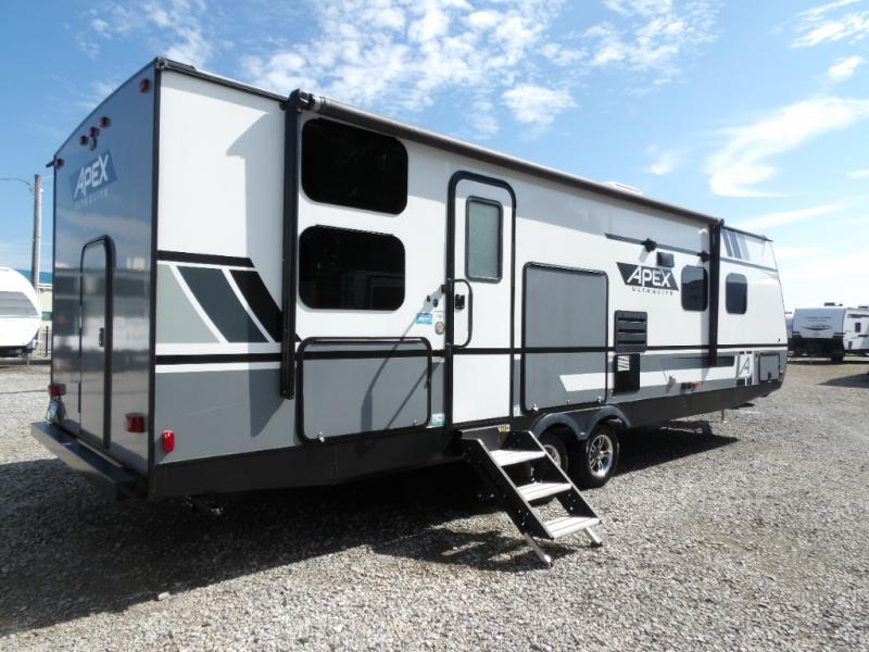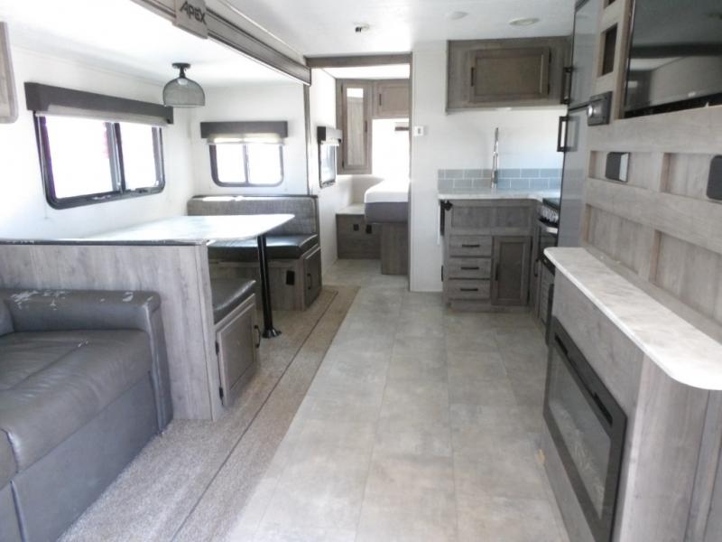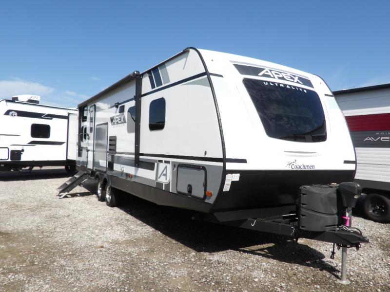 Lightweight living and camping is found with the Apex Ultra-Lite travel trailers by Coachmen. These eco-friendly units are made to last thanks to the Azdel composite sidewalls, the laminated aluminum floor, and the vacuum-bonded laminated crowned roof. Lippert axles and nitrogen filled radial tires make towing easier than ever, plus there is a friction hinge entrance door, a 100-watt solar panel with a 10 Amp control charger, and slam latch baggage door catches for easy unloading. Some of the interior comforts you'll fall in love with are the one-piece seamless edge countertops, the hard valances with night shades throughout, the matte black hardware, and the residential comforter. The Apex Ultra-Lite trailers also include USB ports, a digital TV antenna with cable hook-ups and Wi-Fi capability, and an AM/FM stereo with Bluetooth to ensure you'll never go bored on rainy camp days!