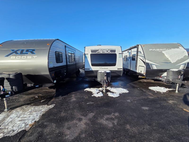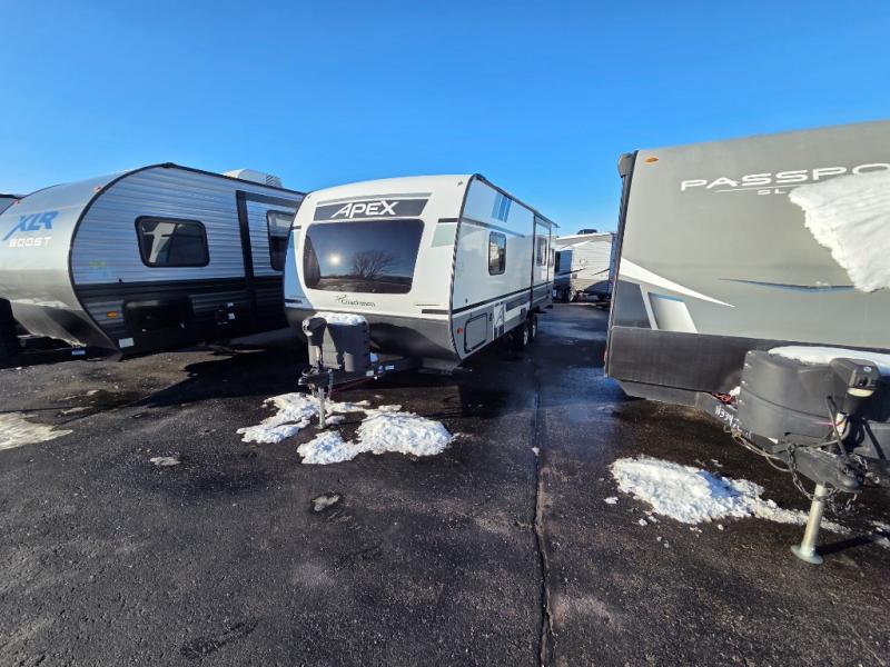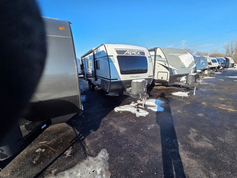 The Coachmen Apex Nano travel trailers and expandables should be at the top of your list because they are lightweight, easy to tow, and comfortable! Built upon an aluma-cage construction, the Apex Nano has a vacuum-bonded, aluminum trussed roof, a corrosion-resistant powder-coated frame, a front stone guard, Dexter E-Z Lube axles, and nitrogen-filled radial tires. Some of the modern features include a digital TV antenna with cable hook-ups and Wi-Fi capability, an AM/FM stereo with Bluetooth, exterior speakers, a DSI gas/electric water heater, and a power awning with LED lighting.