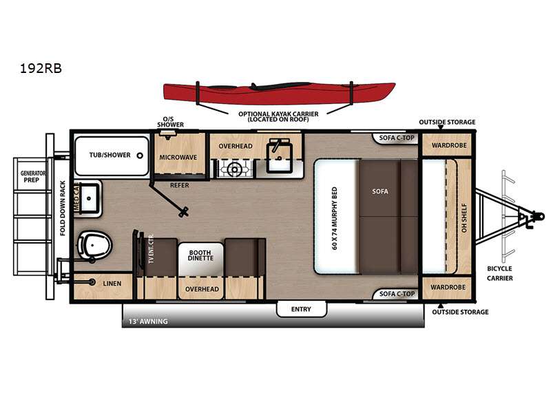 It's time to go off-grid with this Catalina Expedition travel trailer without leaving your comforts behind! You'll love the versatile Murphy bed because you can just fold it up during the day and relax on the sofa. The chef of the family can prepare breakfast on the three-burner range, and the milk and eggs can go back in the refrigerator. The full rear bath also includes a tub/shower and a linen closet allowing you to stay refreshed for whatever is next on your adventure. You will appreciate the outside storage for your gear, the outdoor shower to clean off the dirt, and the bicycle carrier when towing and setting your bikes out of the way. You might even like to add the optional kayak carrier on the roof.