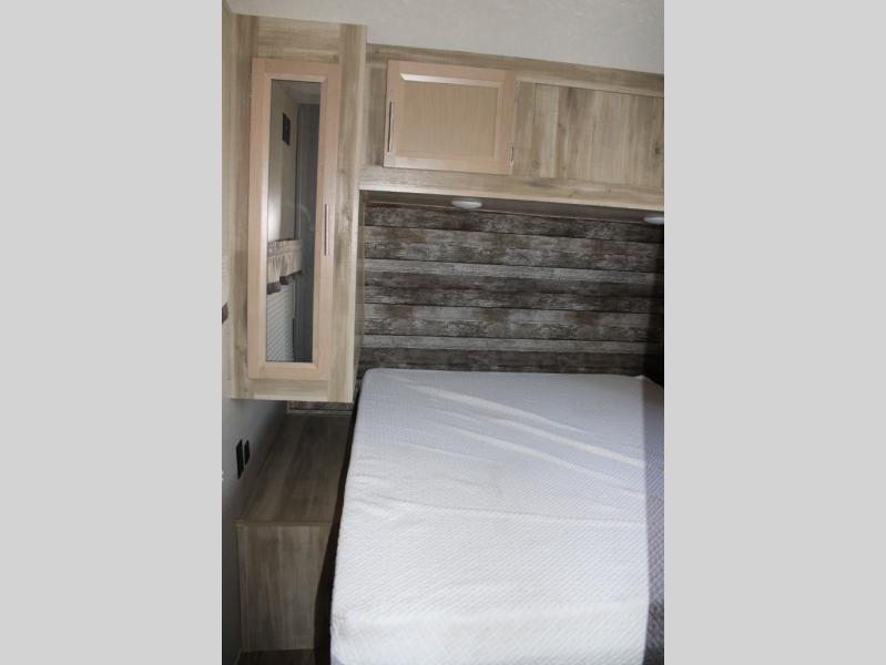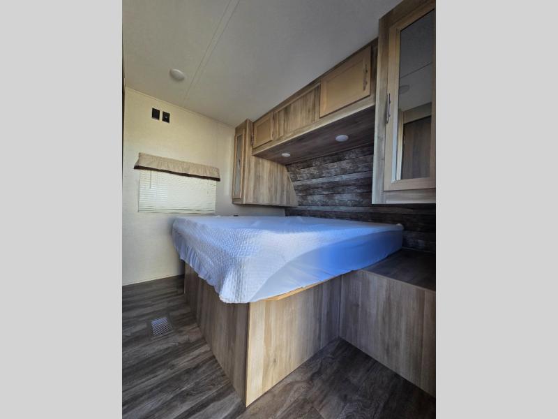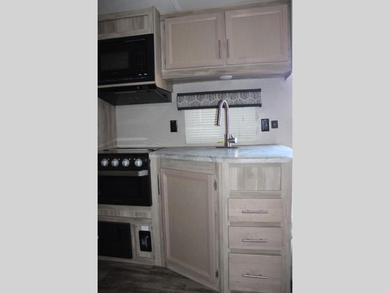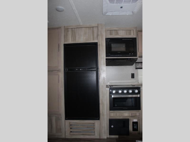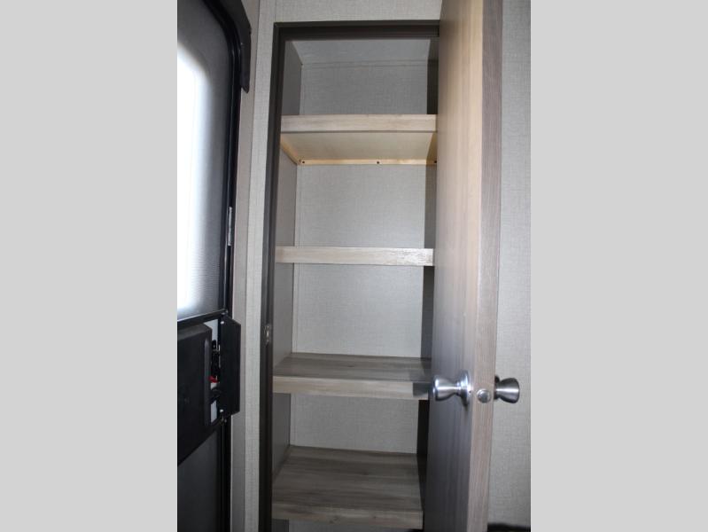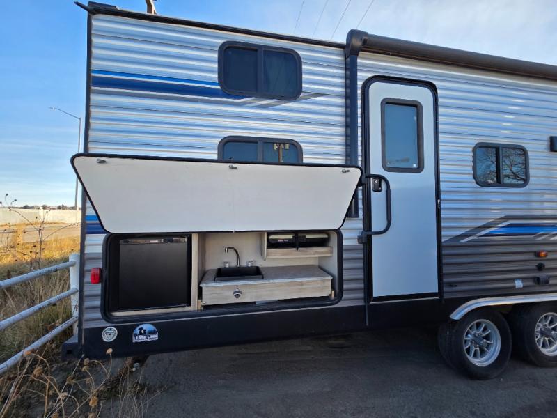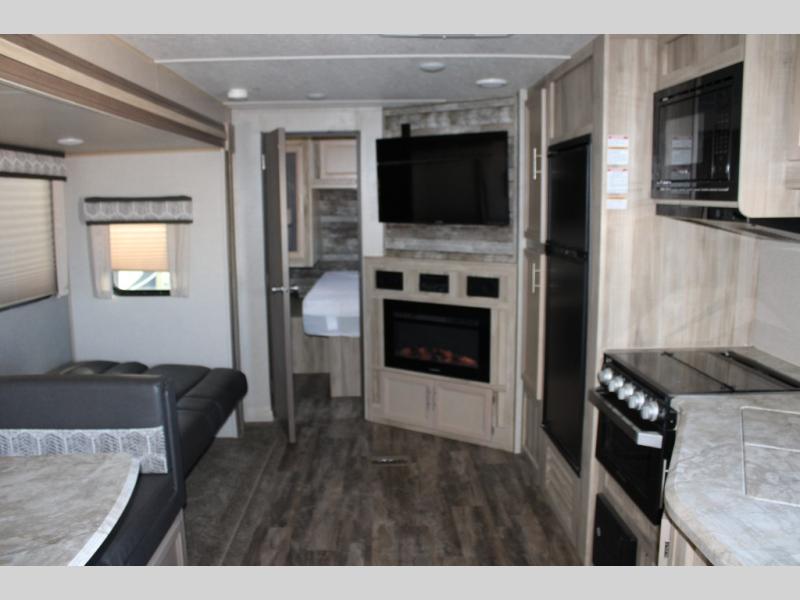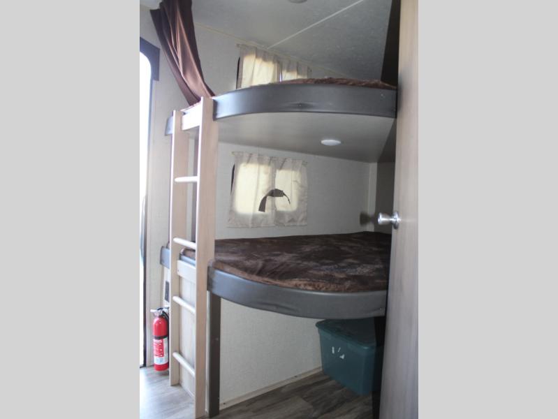 This classic family travel trailer layout offers plenty of sleeping space for the whole family plus some, and modern design throughout! The double-sized bunk beds will be the kids favorite, and the furniture provides additional sleeping space when they invite friends, and you will get your own queen bed in the master bedroom which also has the second exterior entry. The cook will appreciate the kitchen pantry and all the interior amenities as well as the outside camp kitchen. The 39" TV with dual zone entertainment sound bar is at an angle giving everyone a better view from the sofa and U-shaped dinette, and the rear corner bathroom offers everything you need to stay refreshed. You will also find an outside shower to clean off your pet, and a cargo rack in the back.