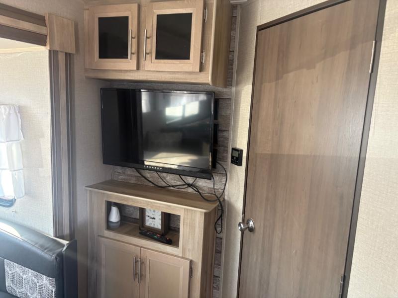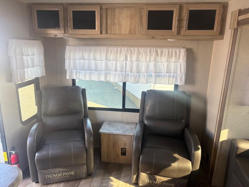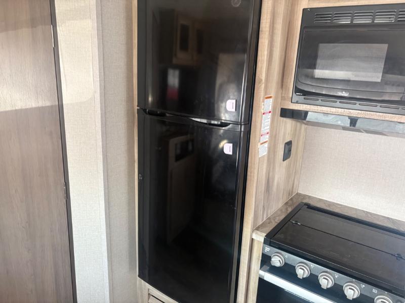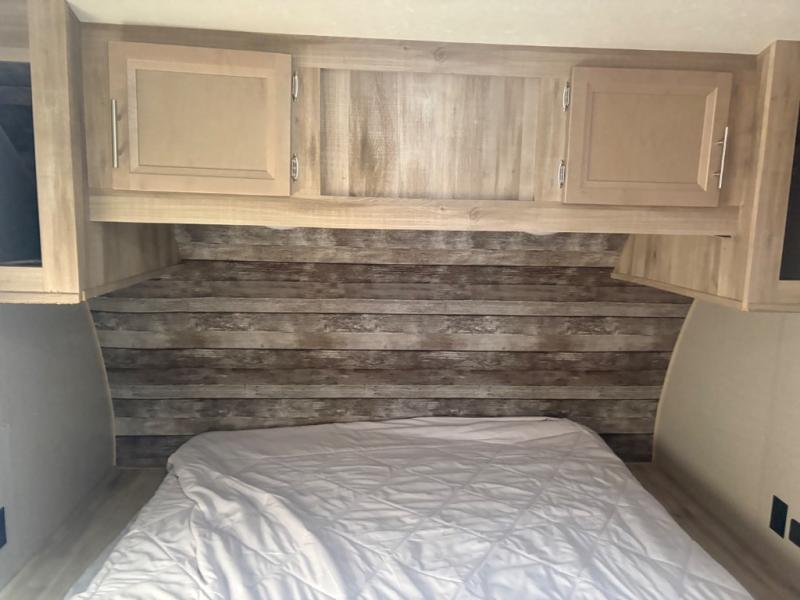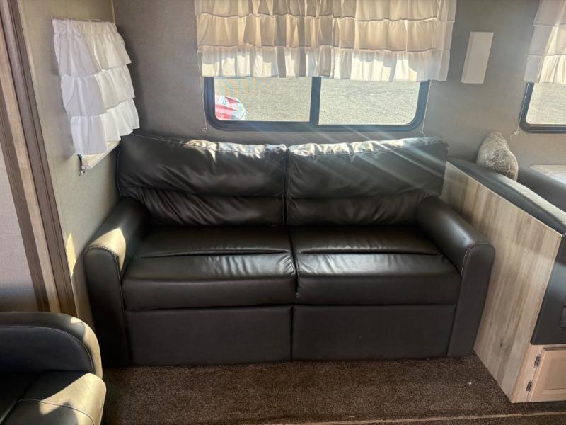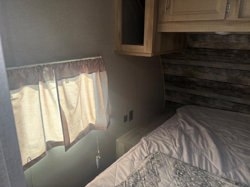Whether you are couple that enjoys relaxation or a family that seeks adventure, this trailer will sleep at least four when you utilize the sofa and booth dinette. You and your spouse will have their own walk-around queen bed to sleep in privacy as well as have access to the outside with your own exterior entry. When you are outside grab your camping chairs from the pass-through compartment and relax under the electric awning. When you are hungry, the cook can make warm meals with full amenities inside and the 10 cu. ft. refrigerator will hold the beverages and leftovers. There are many more features that will make you want this one, step inside!