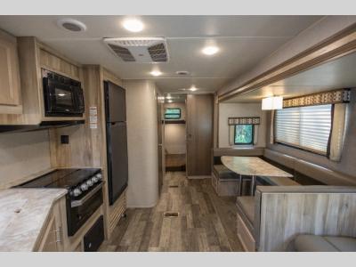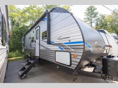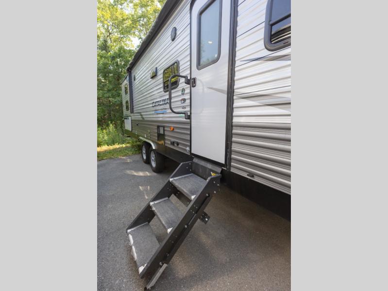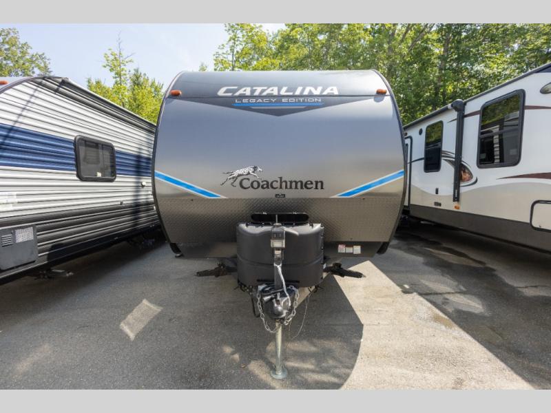 The Catalina Legacy Edition travel trailers by Coachmen RV are constructed with a cambered structural steel l-beam frame, a seamless Alpha roof membrane, full length frame E-coated outriggers, fiberglass insulation throughout, and an enclosed, fully sealed underbelly for four seasons of traveling. Along the exterior you will find a flip-down Cargo rack with 200 lb. capacity, a power awning with multi-color LED lighting and a remote, two JBL Elite speakers, a battery disconnect switch on the A frame and an LP quick connect port. The interior offers seamless Thermofoil countertops throughout, an under-mount farm style sink, a slim line range hood, and Congoleum Woodplank linoleum flooring for style and durability. Choose your favorite today and enjoy comfort and style where ever you decide to camp!
