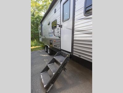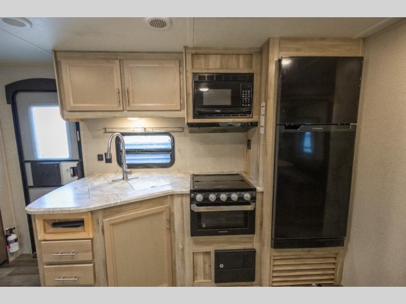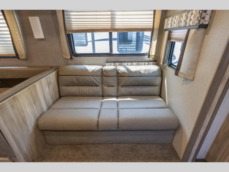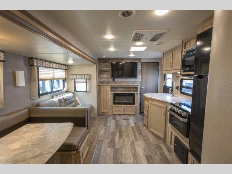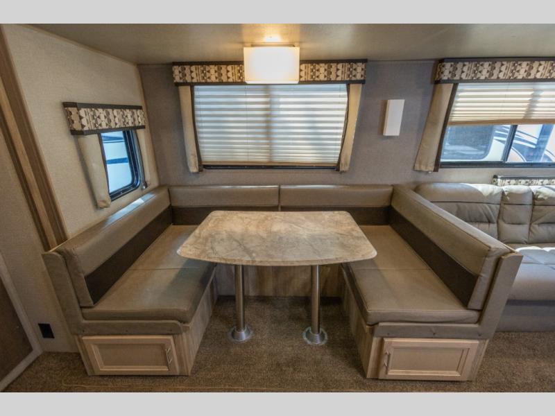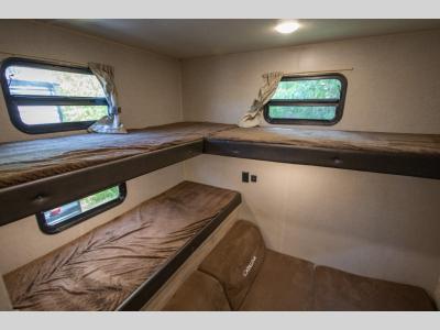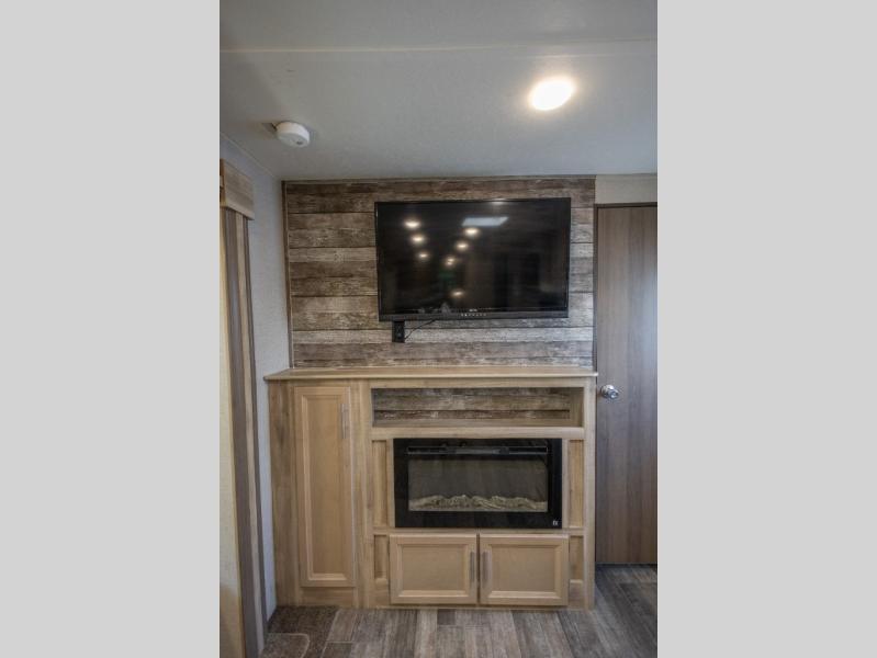 Get ready for a whole of fun with your family in this trailer! From the slide out U-shaped dinette and sofa giving you more interior space in the main living and kitchen area to the private bunkhouse with two COA cubes and three bunk beds, you might never want to go home. The full bathroom will keep everyone clean, and the outside shower can clean off the family pet. Everyone can watch the 39" TV with dual zone entertainment sound bar, and keep warm by the fireplace if you added that option. The cook will have full amenities inside as well as an outside camper kitchen with pull-out griddle. And the parents will have their own privacy in the front bedroom, see... fun for the whole family!