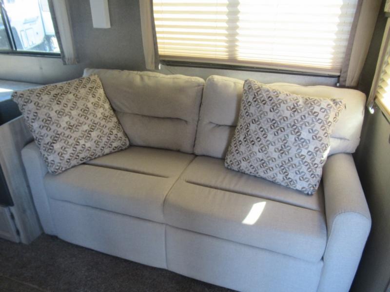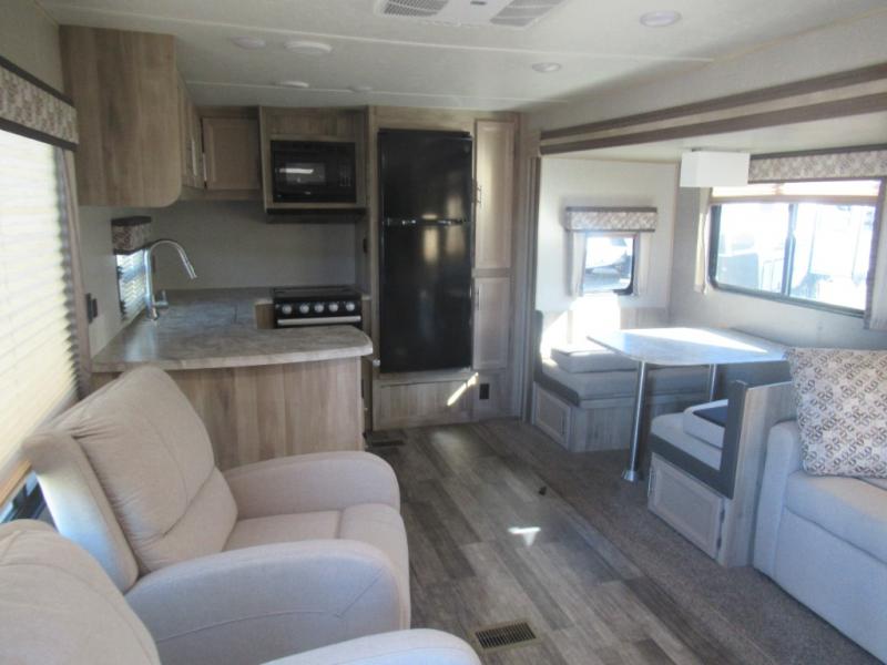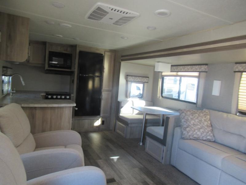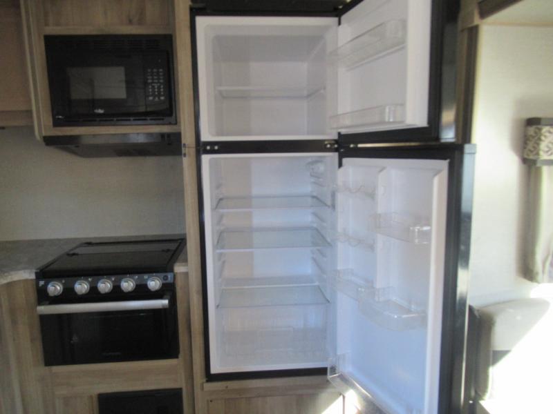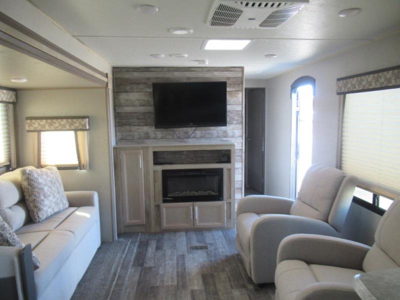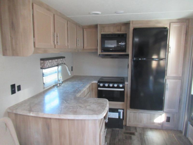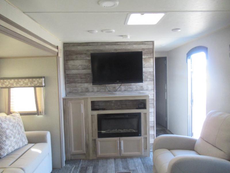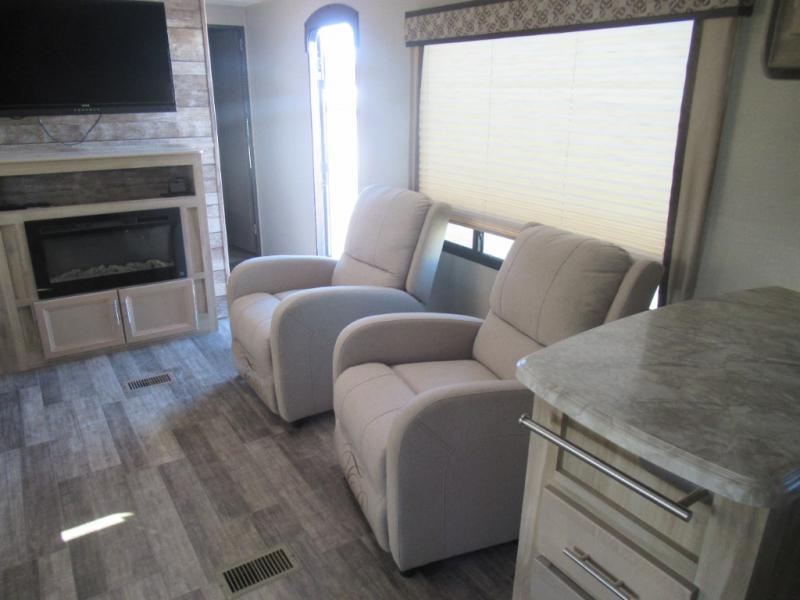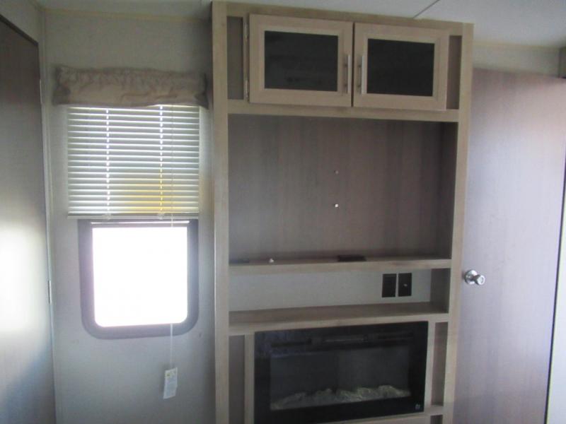 This perfect couples trailer offers dual recliners, a private front bedroom and a rear kitchen layout, yet families are always welcome! The booth dinette and sofa offer sleeping space for two or three kiddos, and the slide out makes the main living and kitchen area spacious and inviting for other RVers to visit. You can even add a washer/dryer option if you plan to stay awhile. The bedroom offers a fireplace and there is a fireplace option in the main area, now that is cozy! And the 18' electric awning offers an outdoor living area protected by the elements and includes choices of color of LED lighting for you to enjoy. There is more to love, start camping!