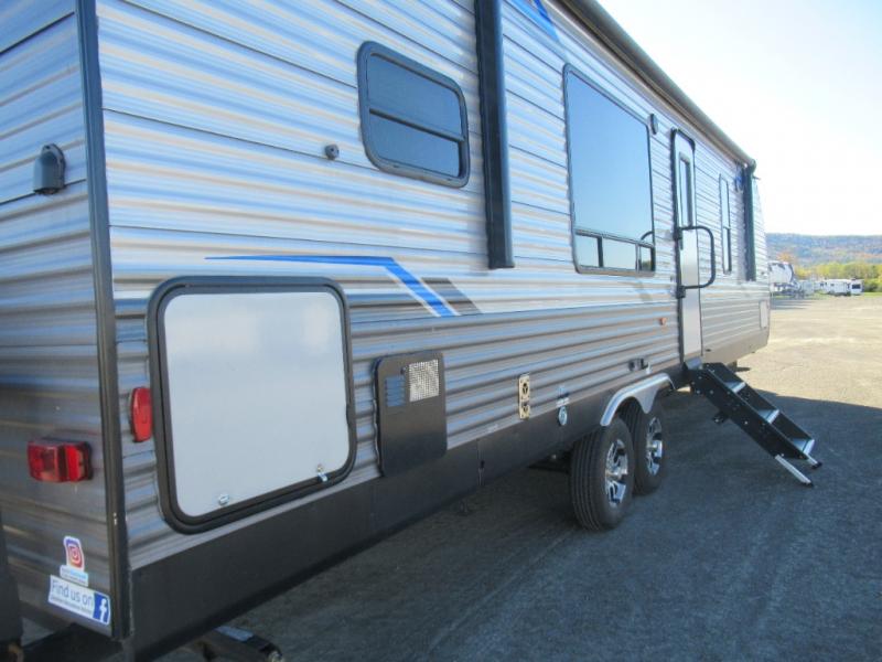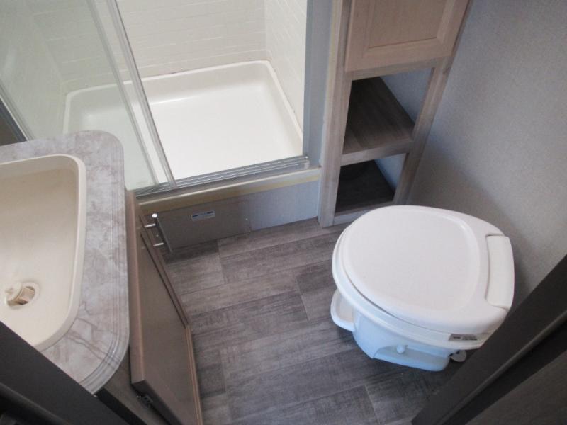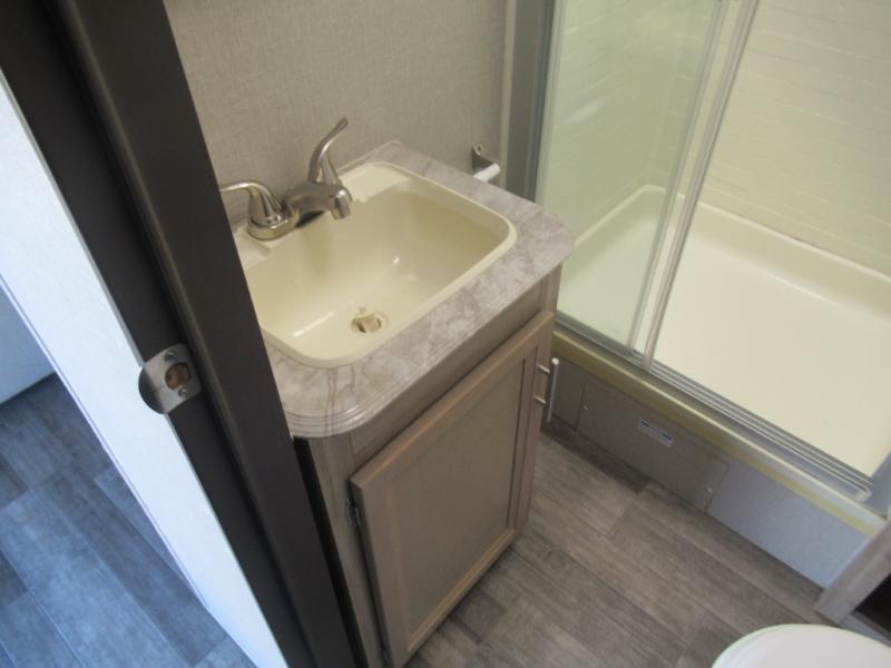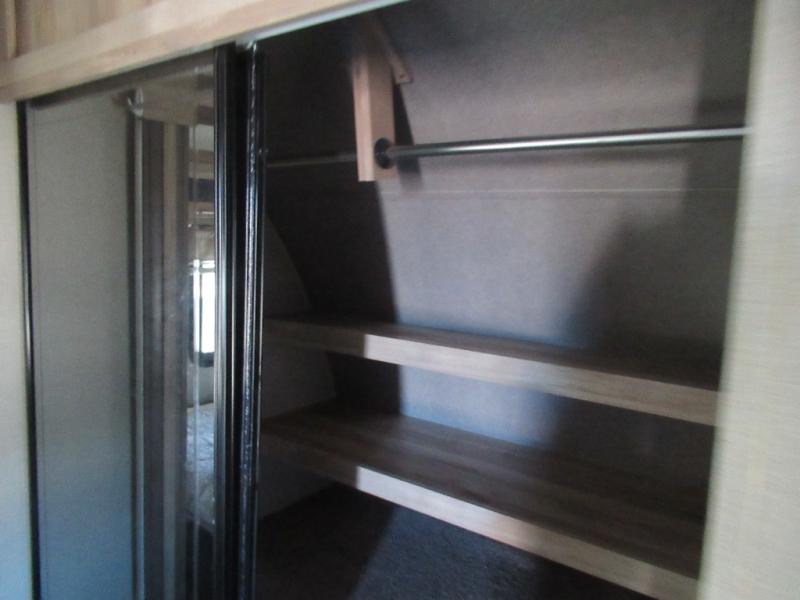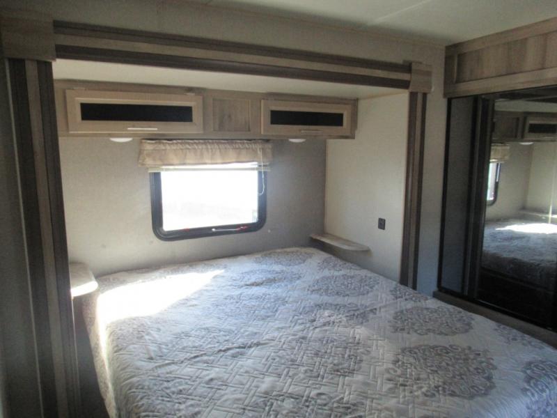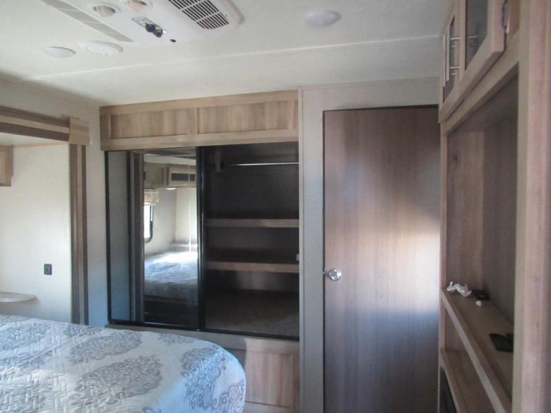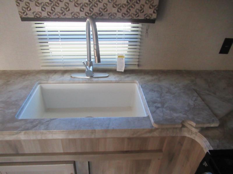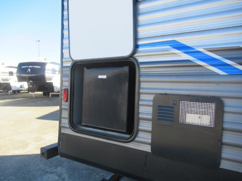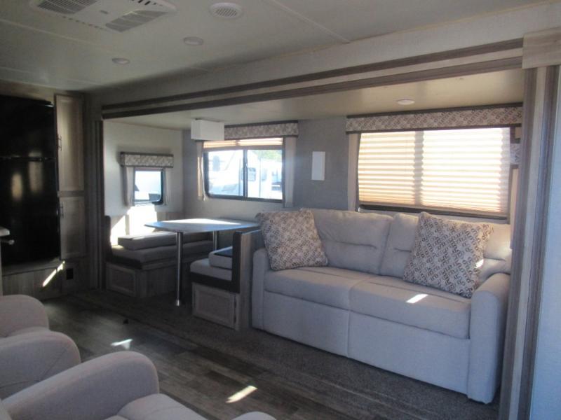 This perfect couples trailer offers dual recliners, a private front bedroom and a rear kitchen layout, yet families are always welcome! The booth dinette and sofa offer sleeping space for two or three kiddos, and the slide out makes the main living and kitchen area spacious and inviting for other RVers to visit. You can even add a washer/dryer option if you plan to stay awhile. The bedroom offers a fireplace and there is a fireplace option in the main area, now that is cozy! And the 18' electric awning offers an outdoor living area protected by the elements and includes choices of color of LED lighting for you to enjoy. There is more to love, start camping!