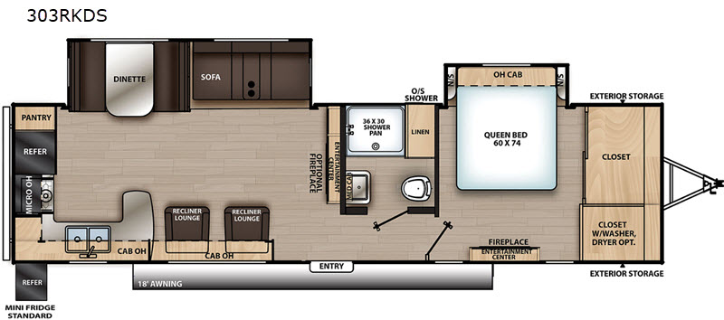 This perfect couples trailer offers dual recliners, a private front bedroom and a rear kitchen layout, yet families are always welcome! The booth dinette and sofa offer sleeping space for two or three kiddos, and the slide out makes the main living and kitchen area spacious and inviting for other RVers to visit. You can even add a washer/dryer option if you plan to stay awhile. The bedroom offers a fireplace and there is a fireplace option in the main area, now that is cozy! And the 18' electric awning offers an outdoor living area protected by the elements and includes choices of color of LED lighting for you to enjoy. There is more to love, start camping!
