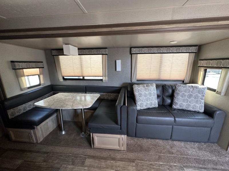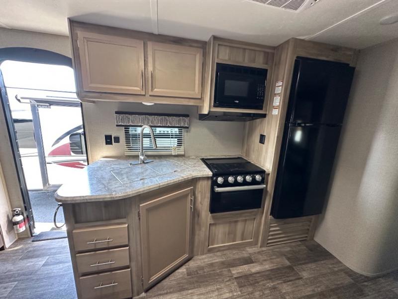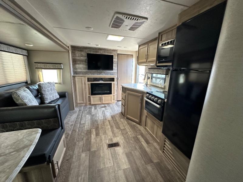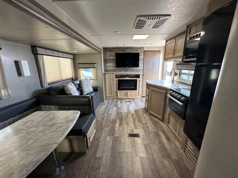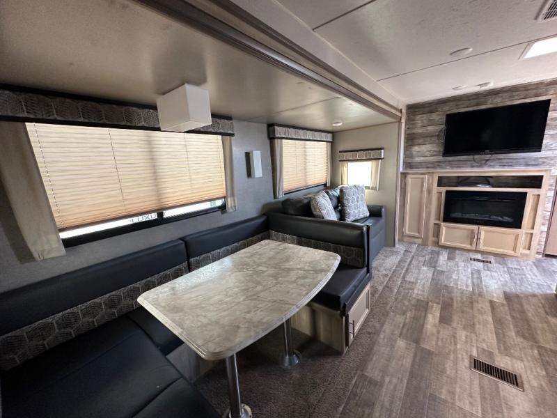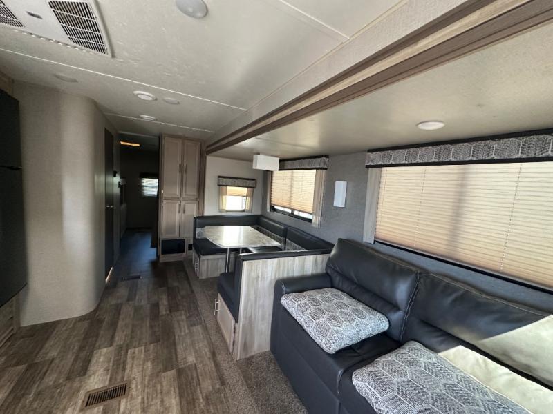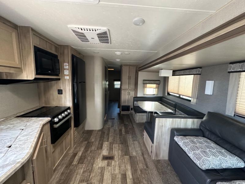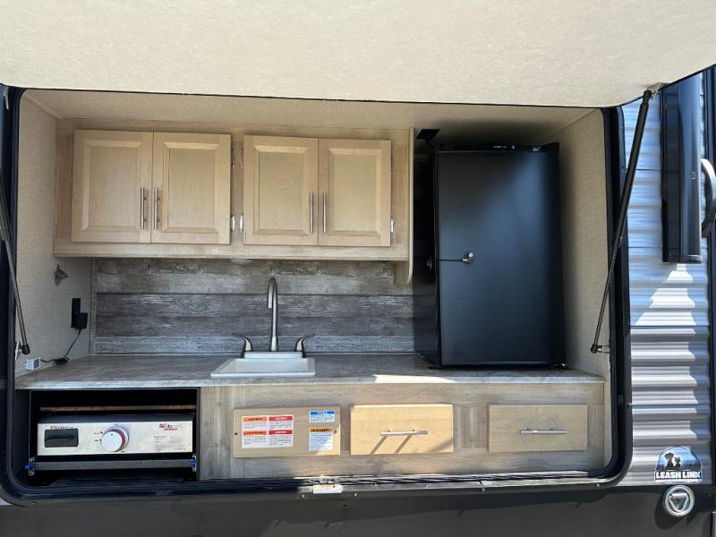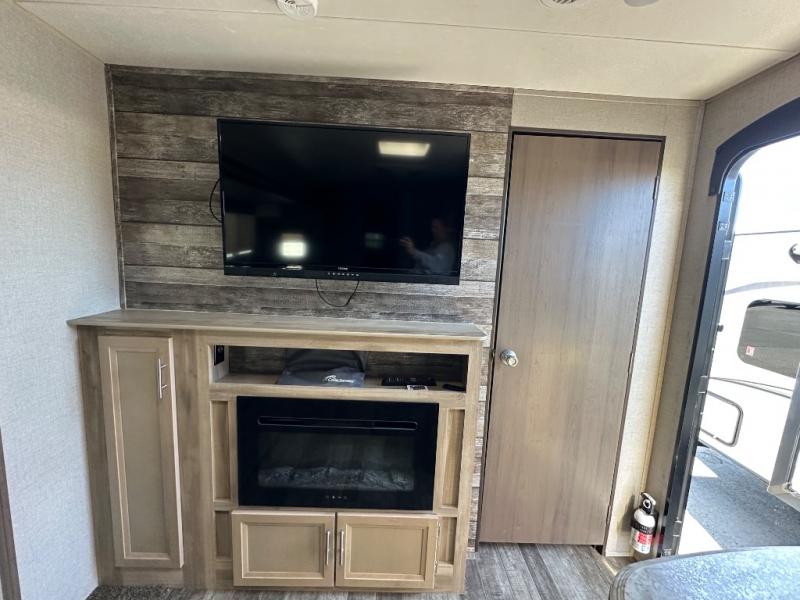 A larger family will love all the space in this trailer with a slide out in the bunkhouse and a second slide out in the main living area! The kids will claim their own bunk bed or COA cube futon to sleep on at night and they will find storage fro their things in the wardrobes and cabinets. You will have dual wardrobes in the private bedroom on the opposite side, and your own walk-around queen bed. The outside full-size camper kitchen might be one of your favorite features or maybe its the 21' electric awning with the choice of LED lighting color to keep the party going into the night. On the chilly evenings, hang out inside at the U-shaped dinette or sofa and watch the 39" LED TV with dual zone entertainment sound bar and optional fireplace. And the inside kitchen has full amenities.