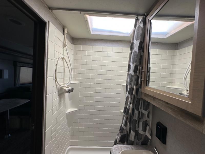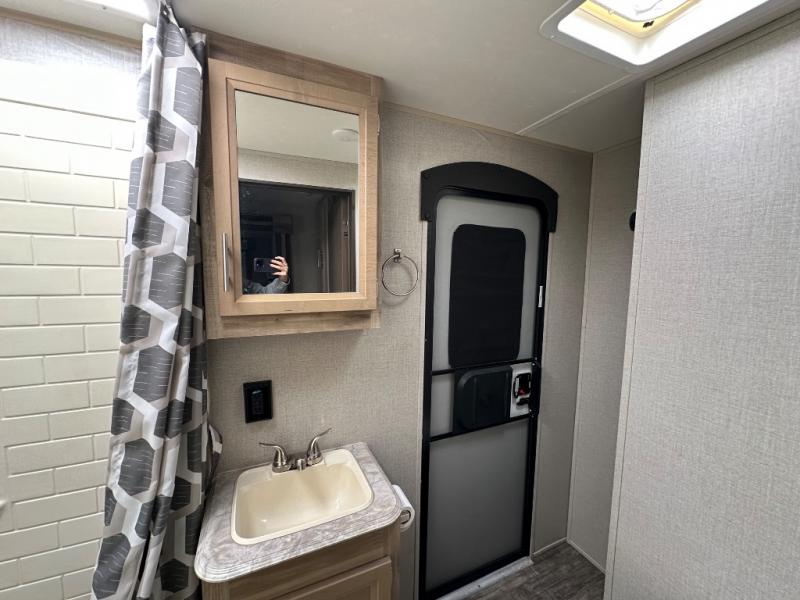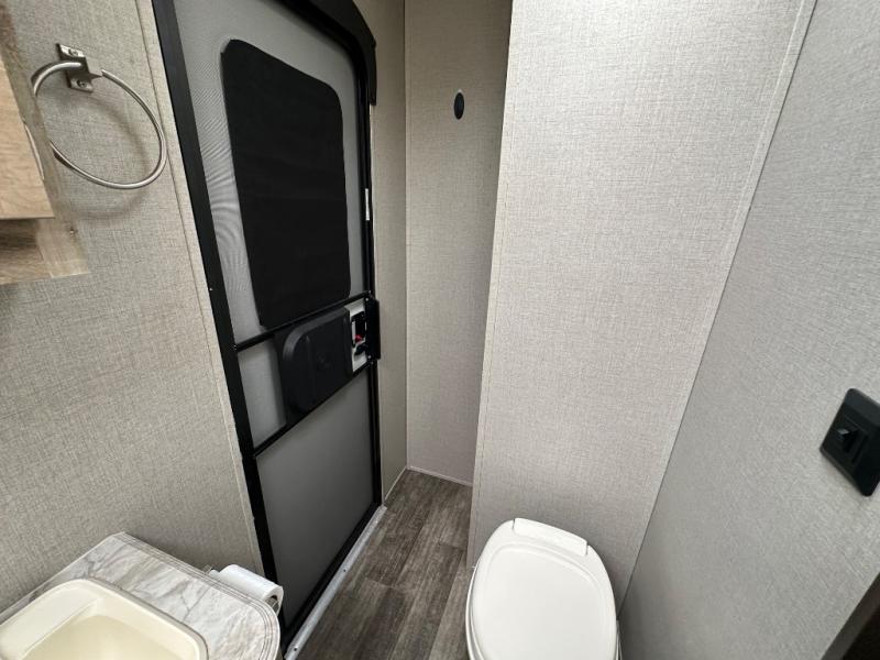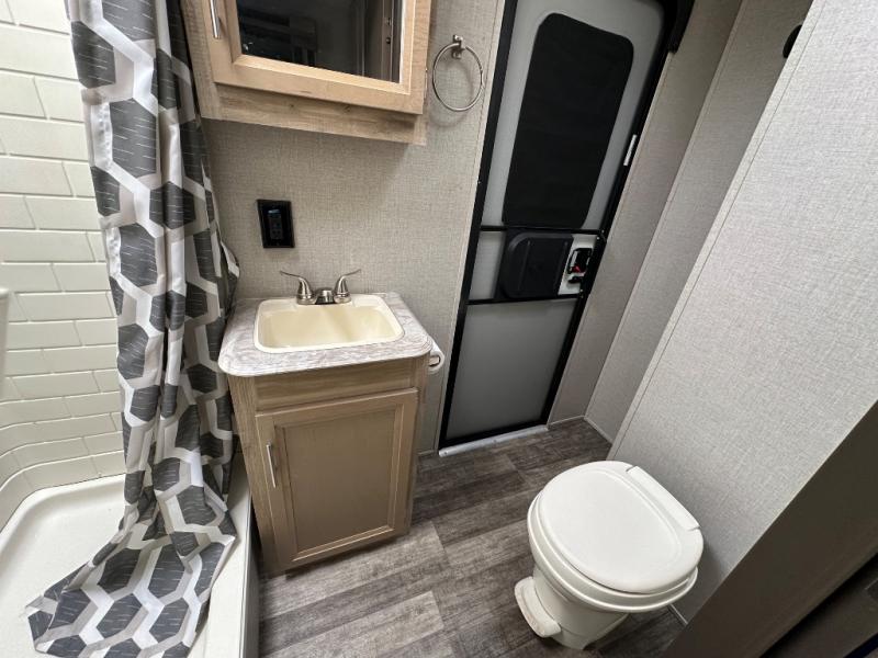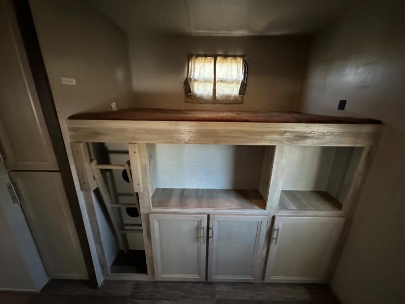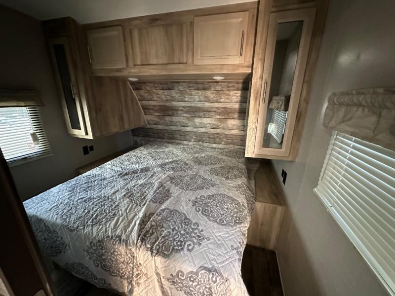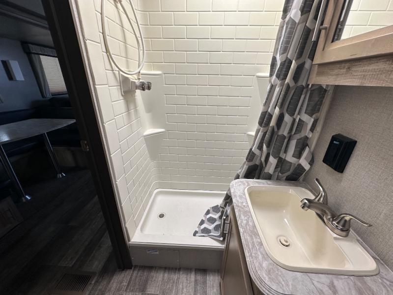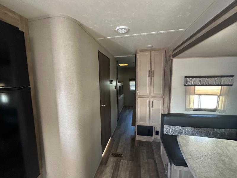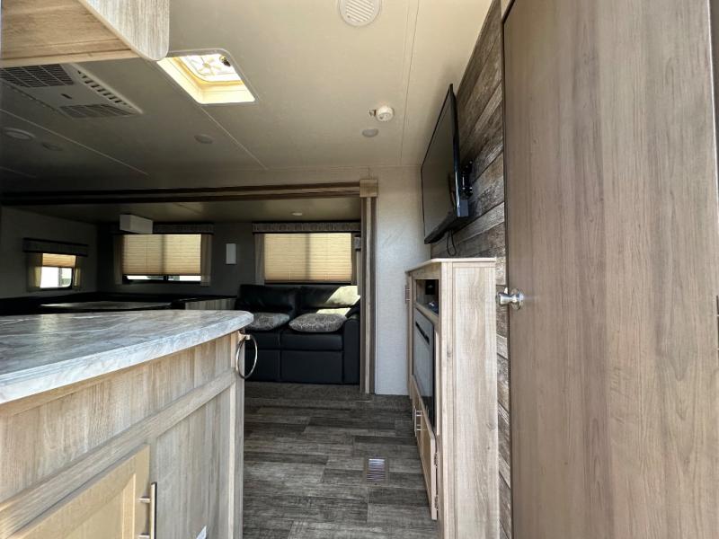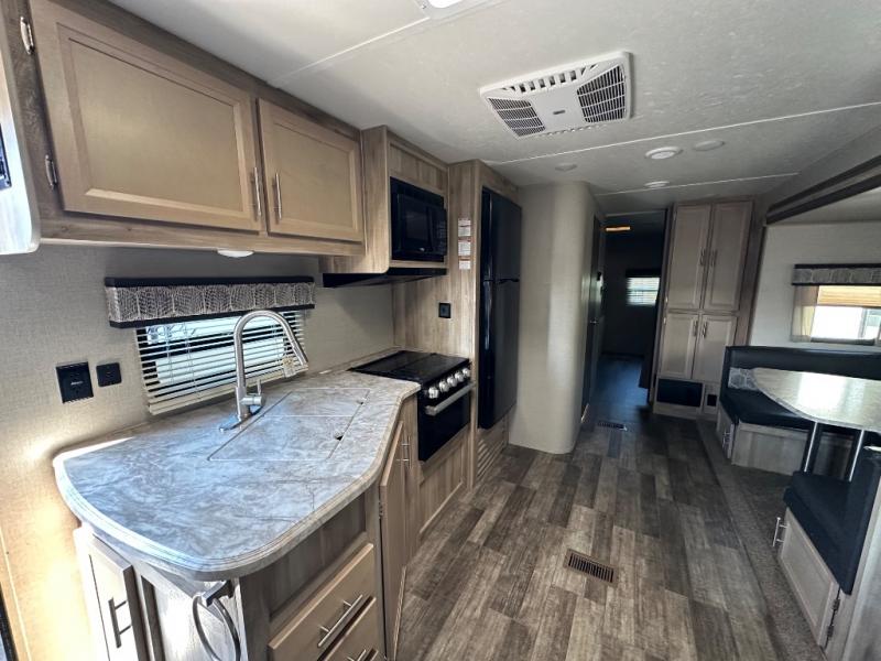 A larger family will love all the space in this trailer with a slide out in the bunkhouse and a second slide out in the main living area! The kids will claim their own bunk bed or COA cube futon to sleep on at night and they will find storage fro their things in the wardrobes and cabinets. You will have dual wardrobes in the private bedroom on the opposite side, and your own walk-around queen bed. The outside full-size camper kitchen might be one of your favorite features or maybe its the 21' electric awning with the choice of LED lighting color to keep the party going into the night. On the chilly evenings, hang out inside at the U-shaped dinette or sofa and watch the 39" LED TV with dual zone entertainment sound bar and optional fireplace. And the inside kitchen has full amenities.