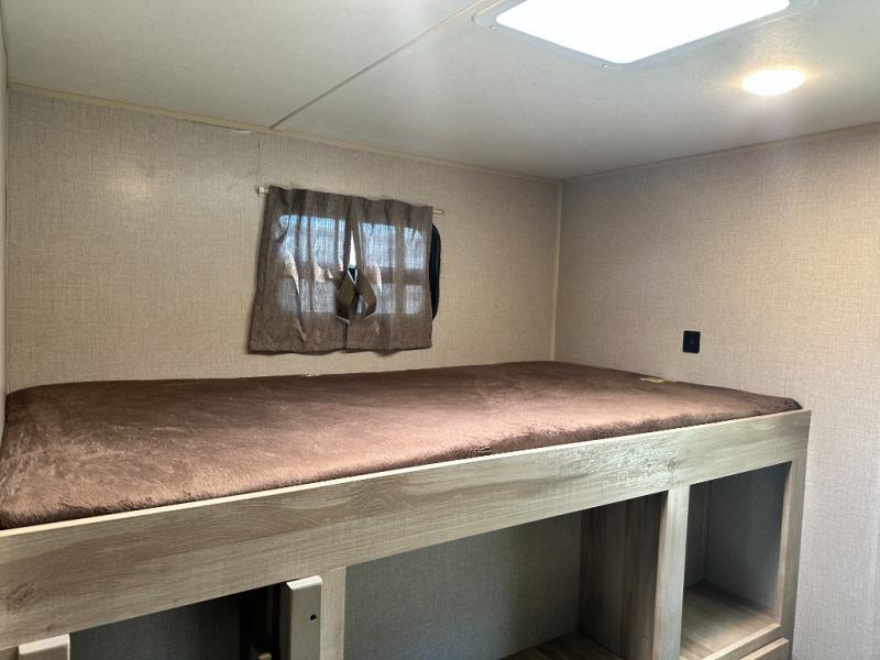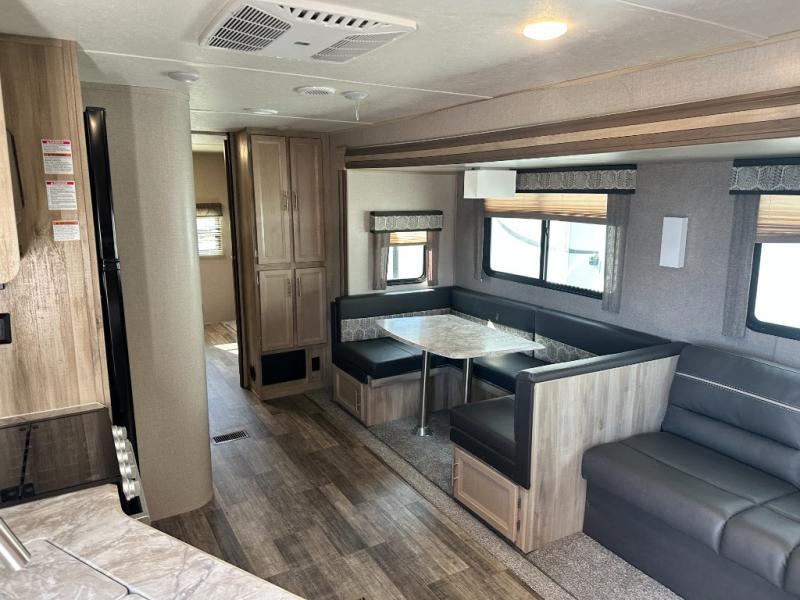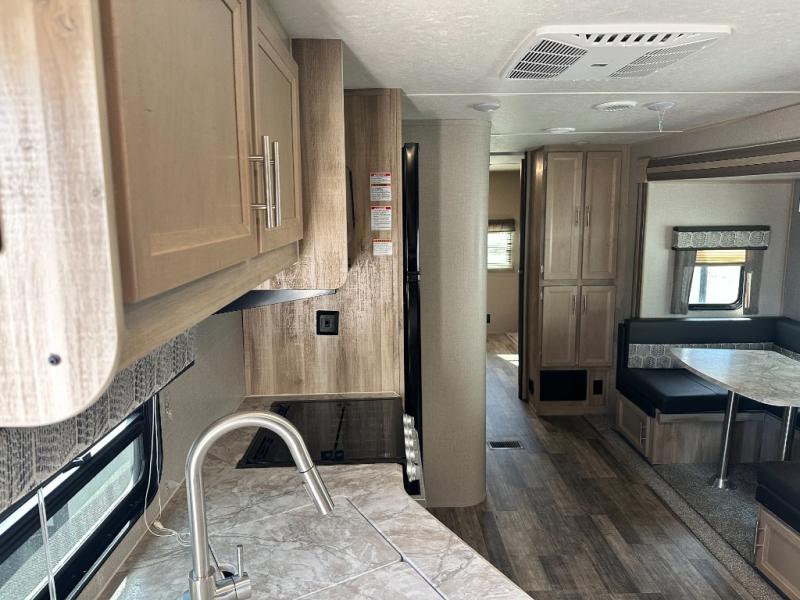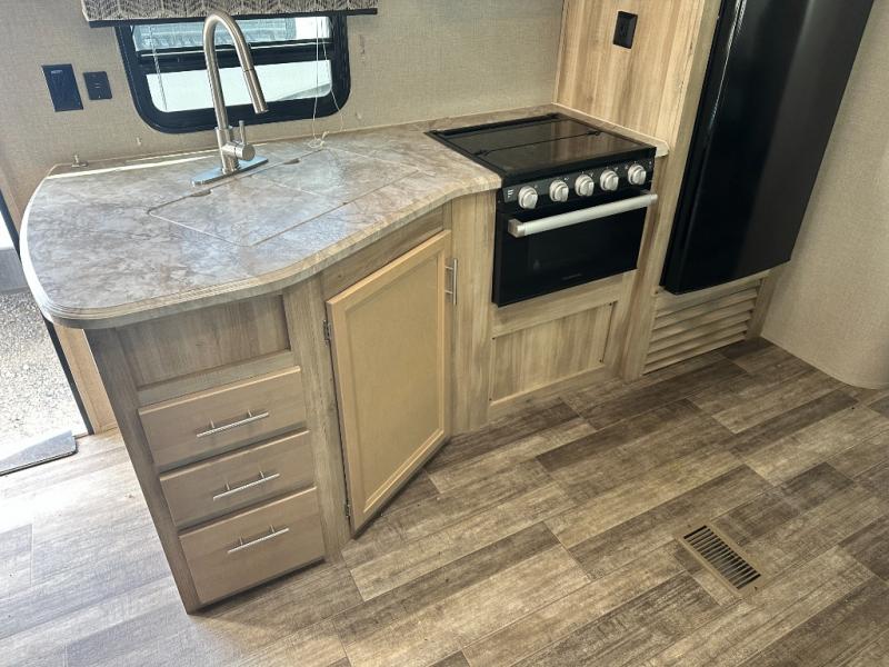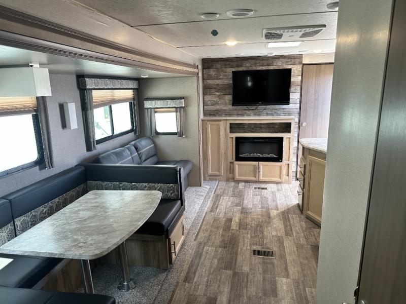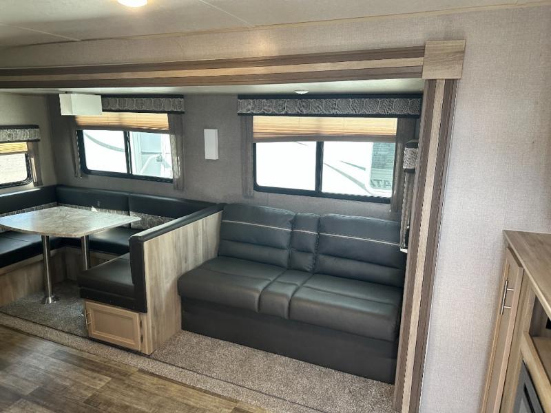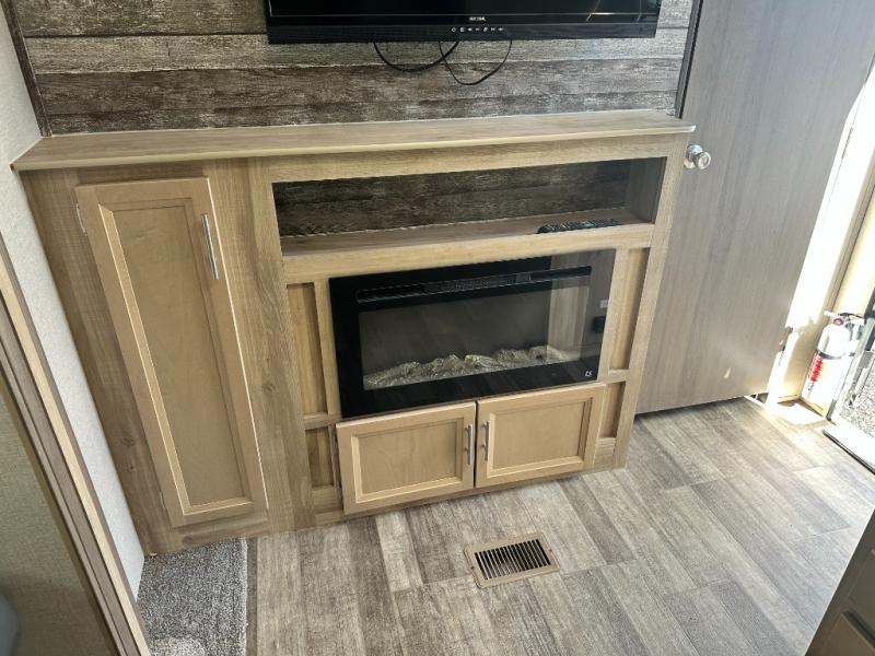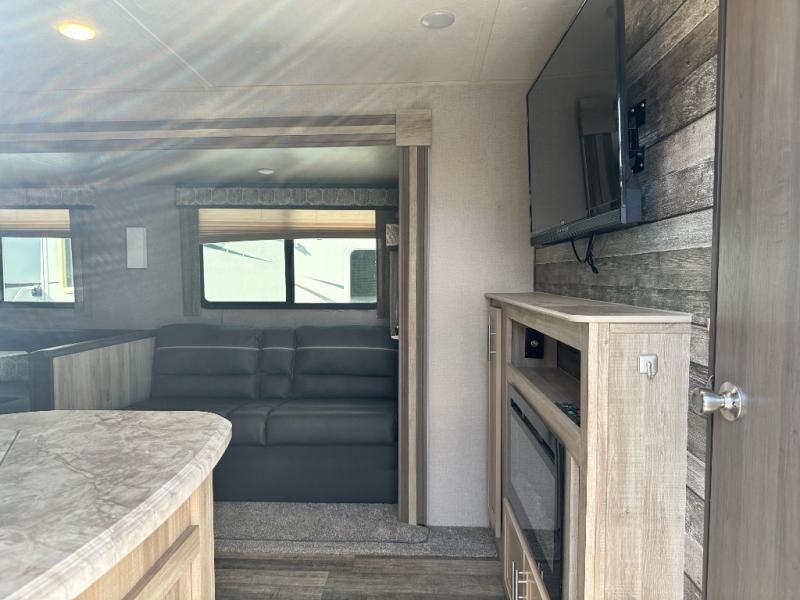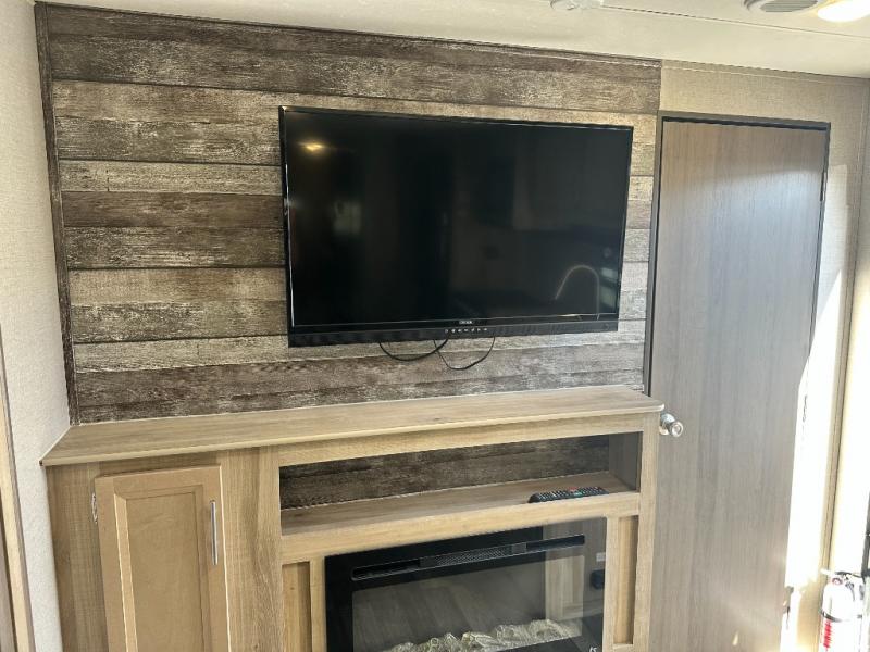 A larger family will love all the space in this trailer with a slide out in the bunkhouse and a second slide out in the main living area! The kids will claim their own bunk bed or COA cube futon to sleep on at night and they will find storage fro their things in the wardrobes and cabinets. You will have dual wardrobes in the private bedroom on the opposite side, and your own walk-around queen bed. The outside full-size camper kitchen might be one of your favorite features or maybe its the 21' electric awning with the choice of LED lighting color to keep the party going into the night. On the chilly evenings, hang out inside at the U-shaped dinette or sofa and watch the 39" LED TV with dual zone entertainment sound bar and optional fireplace. And the inside kitchen has full amenities.