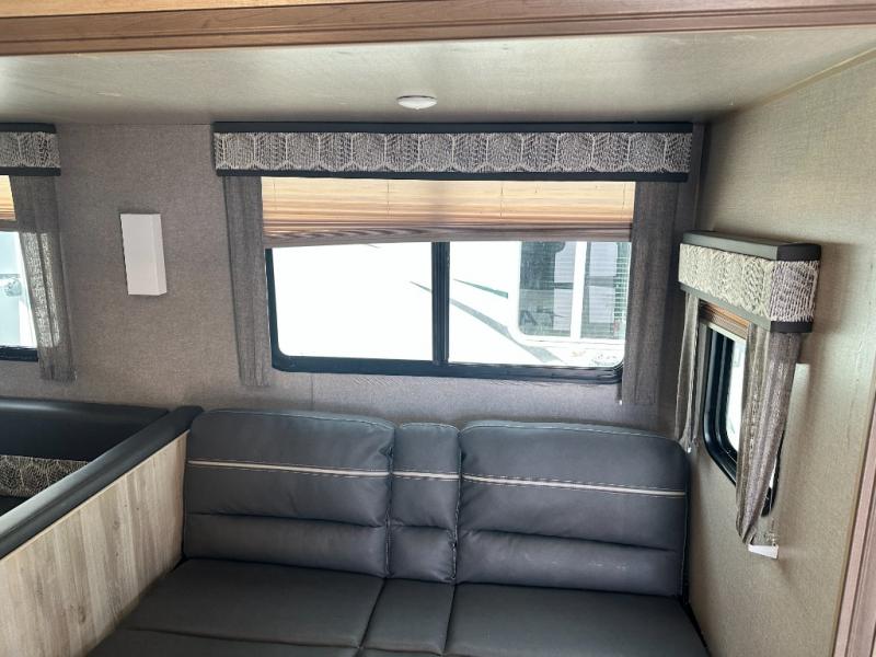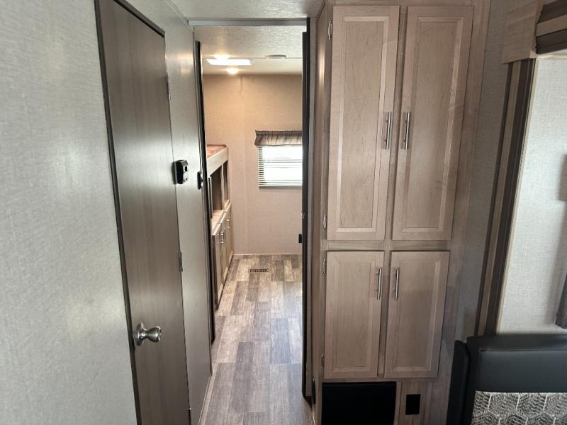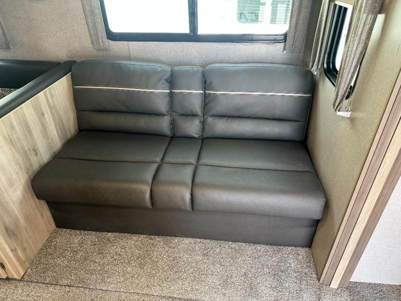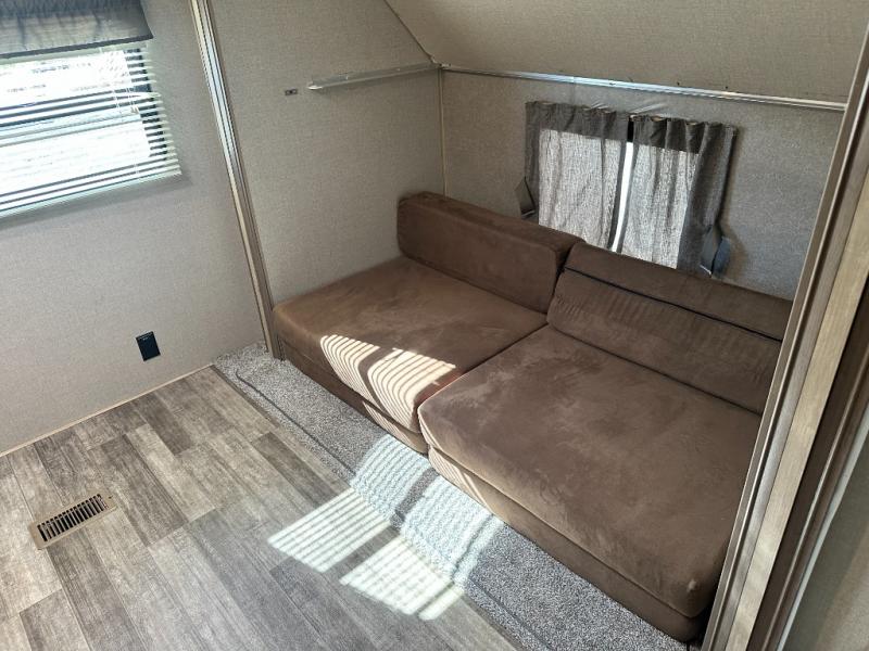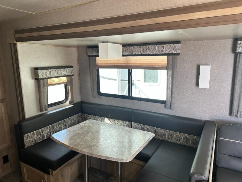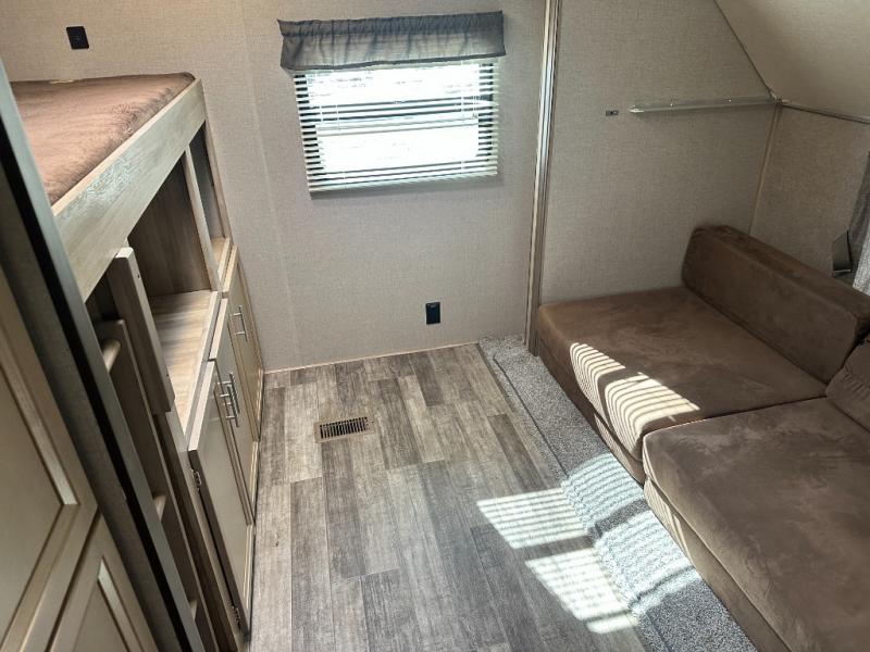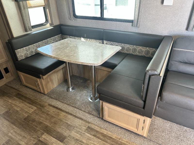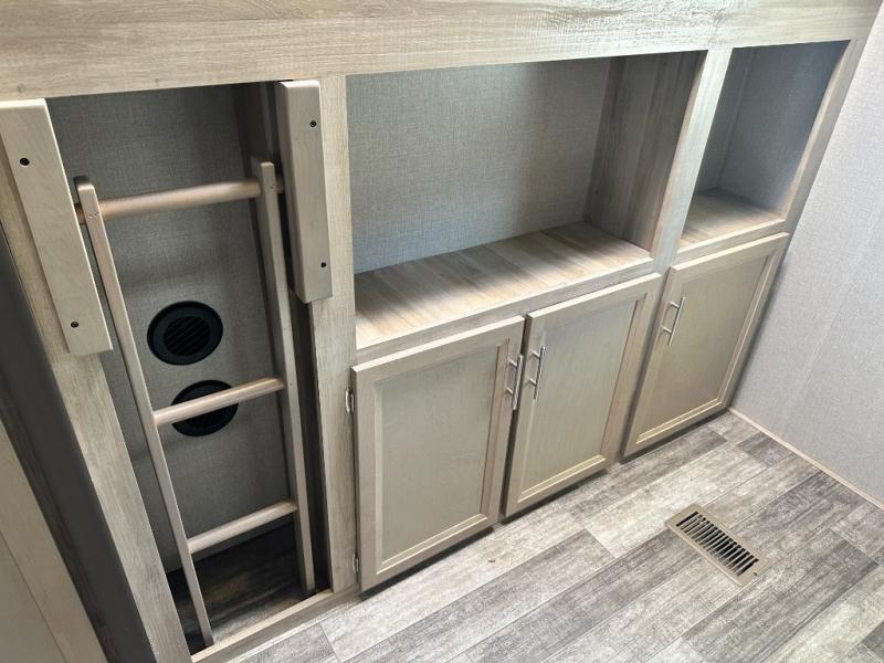 A larger family will love all the space in this trailer with a slide out in the bunkhouse and a second slide out in the main living area! The kids will claim their own bunk bed or COA cube futon to sleep on at night and they will find storage fro their things in the wardrobes and cabinets. You will have dual wardrobes in the private bedroom on the opposite side, and your own walk-around queen bed. The outside full-size camper kitchen might be one of your favorite features or maybe its the 21' electric awning with the choice of LED lighting color to keep the party going into the night. On the chilly evenings, hang out inside at the U-shaped dinette or sofa and watch the 39" LED TV with dual zone entertainment sound bar and optional fireplace. And the inside kitchen has full amenities.