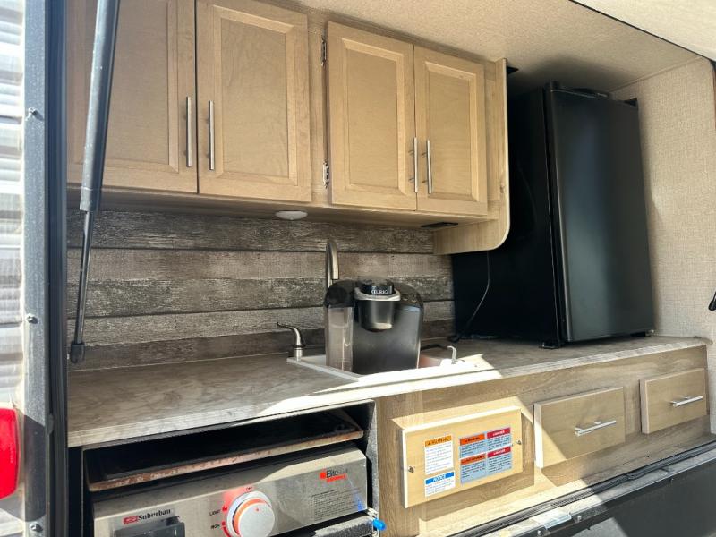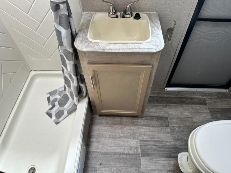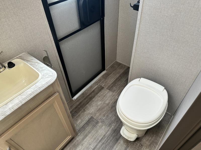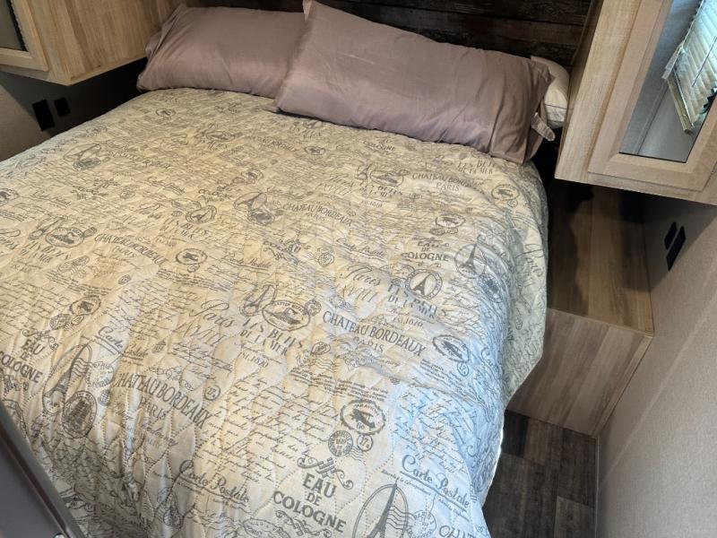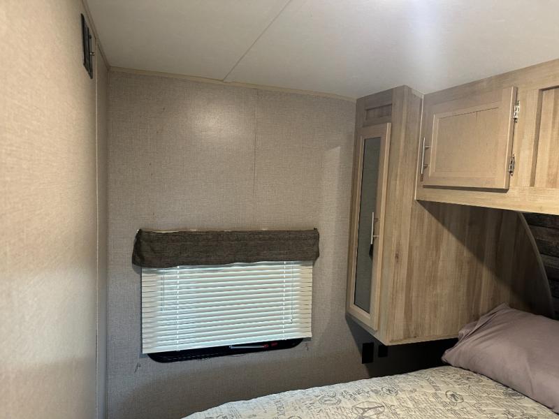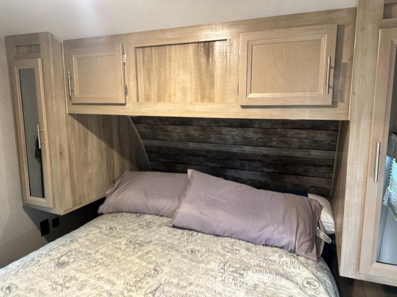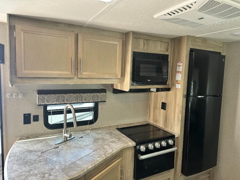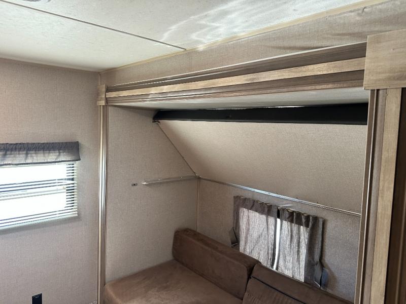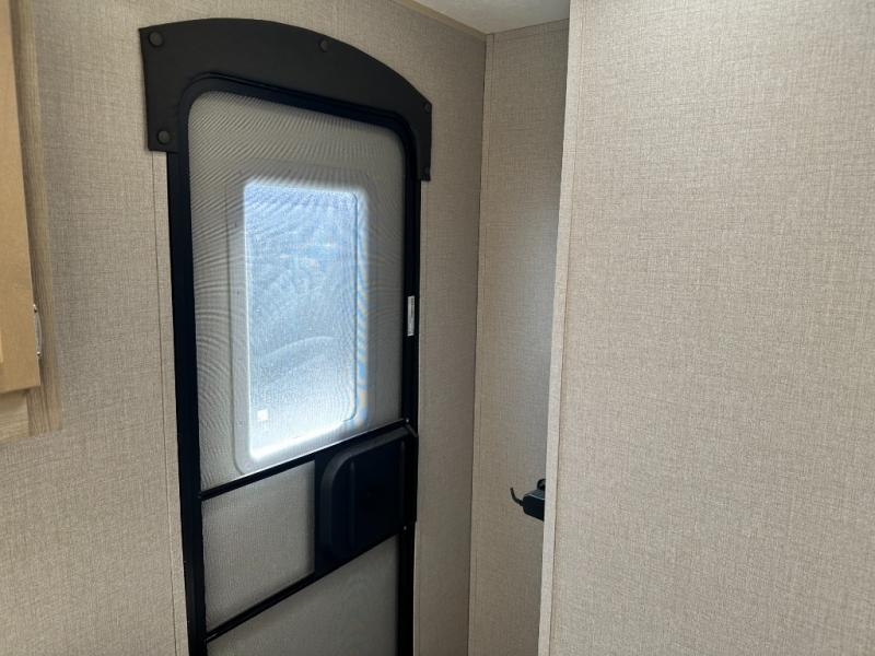A larger family will love all the space in this trailer with a slide out in the bunkhouse and a second slide out in the main living area! The kids will claim their own bunk bed or COA cube futon to sleep on at night and they will find storage fro their things in the wardrobes and cabinets. You will have dual wardrobes in the private bedroom on the opposite side, and your own walk-around queen bed. The outside full-size camper kitchen might be one of your favorite features or maybe its the 21' electric awning with the choice of LED lighting color to keep the party going into the night. On the chilly evenings, hang out inside at the U-shaped dinette or sofa and watch the 39" LED TV with dual zone entertainment sound bar and optional fireplace. And the inside kitchen has full amenities.