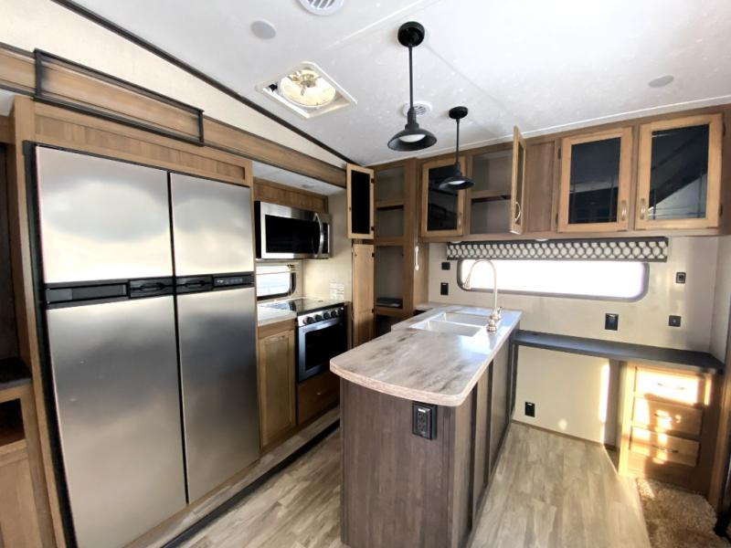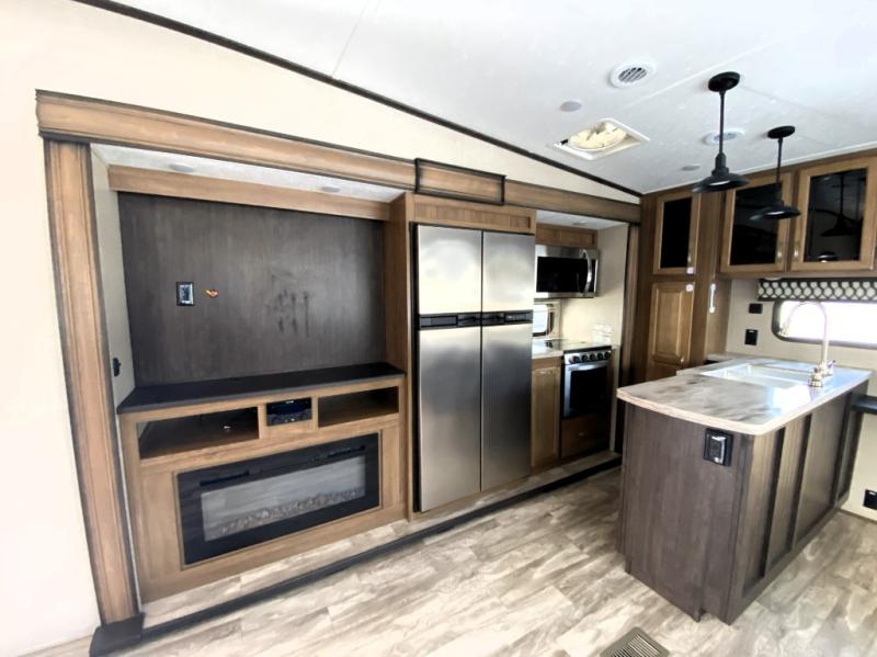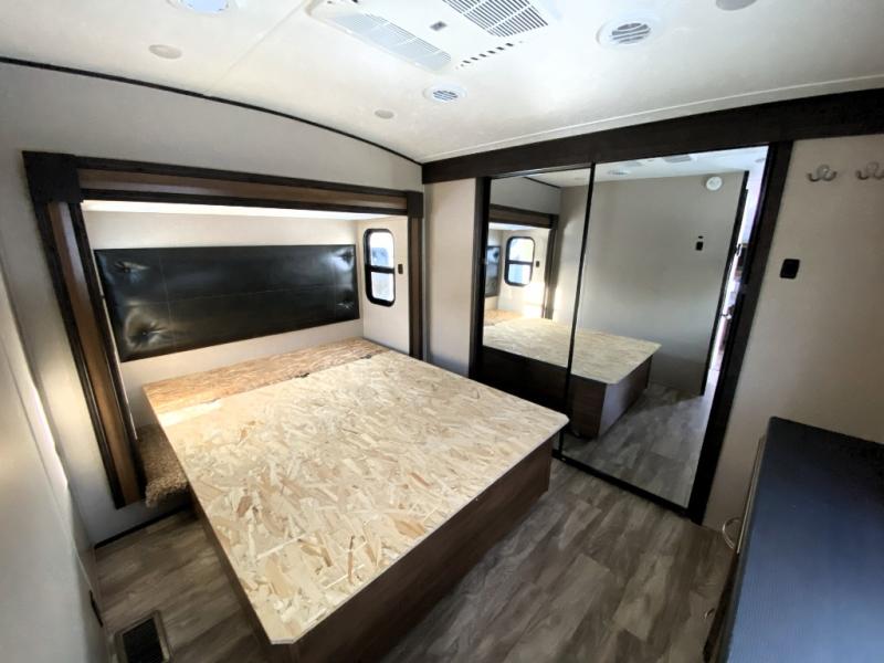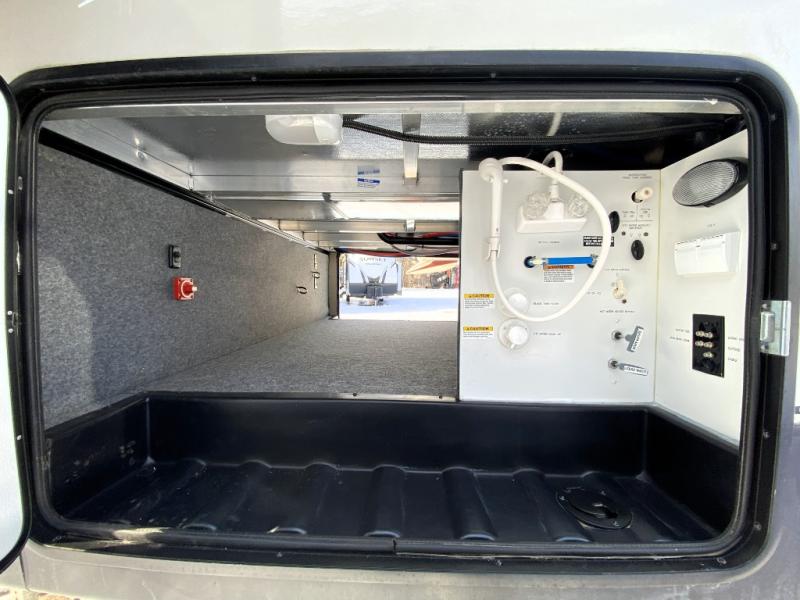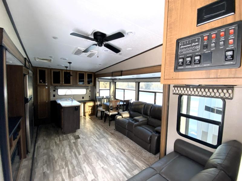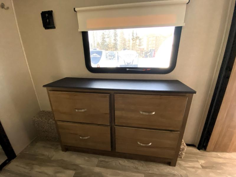 You can have your own front private bedroom with a queen bed slide for you to enjoy a good night's rest, along with a dresser, and a full-wall wardrobe, which is prepped to add an optional washer and dryer. You can also bring along all of your favorite camping goodies and easily store them inside one of the two pantries in the kitchen and enjoy them at either the free standing table and chairs, the theater seats with cup holders, or the tri-fold sofa. The desk will allow you to telecommute while camping or use as a space to keep your cell phone and such. When you want some fresh air, grab a camp chair and your favorite drink, and head underneath the 15' electric awning with LED light strip so that you can enjoy time outdoors during the day or night!