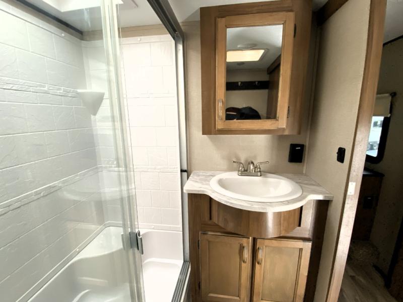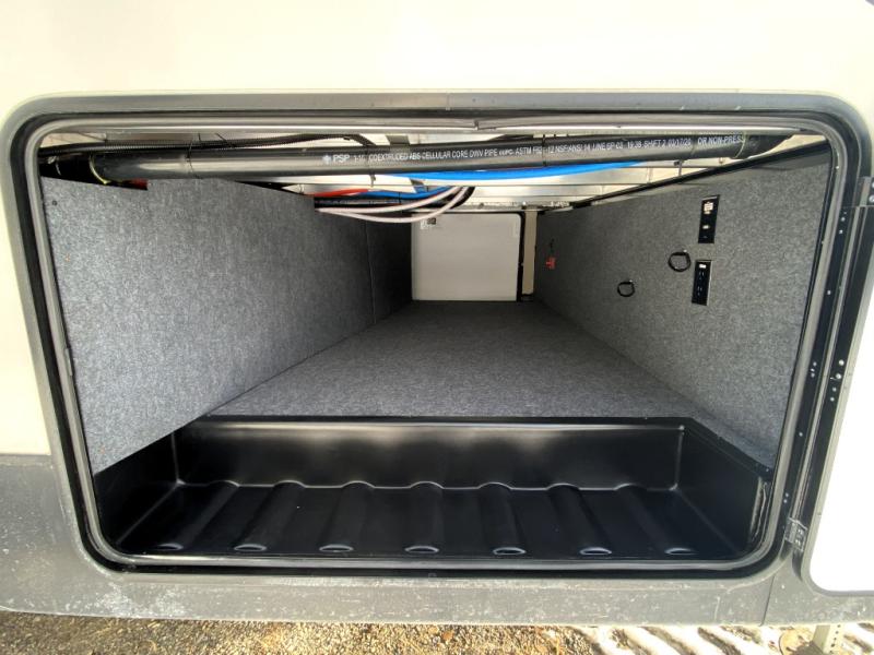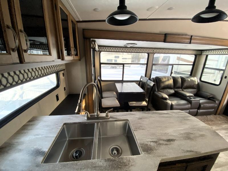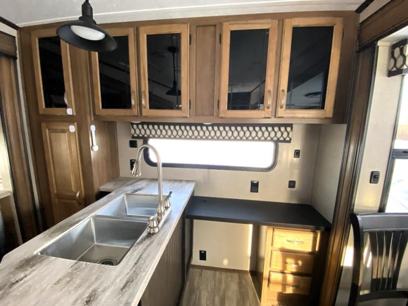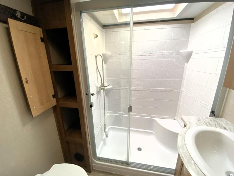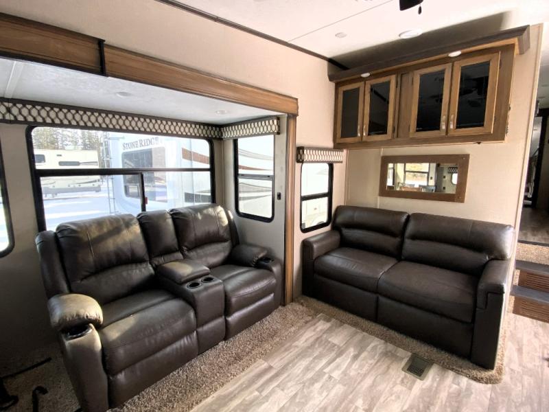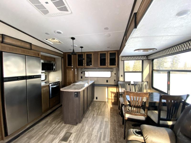 You can have your own front private bedroom with a queen bed slide for you to enjoy a good night's rest, along with a dresser, and a full-wall wardrobe, which is prepped to add an optional washer and dryer. You can also bring along all of your favorite camping goodies and easily store them inside one of the two pantries in the kitchen and enjoy them at either the free standing table and chairs, the theater seats with cup holders, or the tri-fold sofa. The desk will allow you to telecommute while camping or use as a space to keep your cell phone and such. When you want some fresh air, grab a camp chair and your favorite drink, and head underneath the 15' electric awning with LED light strip so that you can enjoy time outdoors during the day or night!