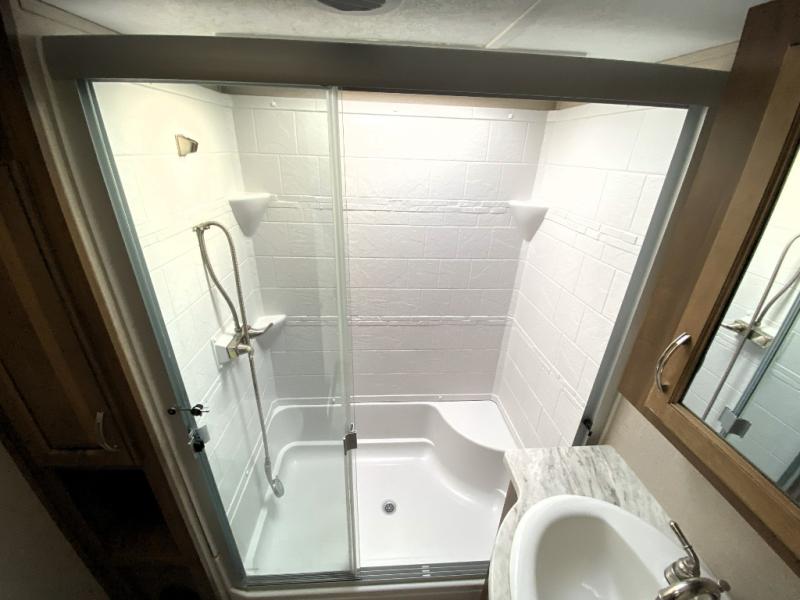 With any Chaparral Mid-Profile fifth wheel you will receive a six-layer, bonded and aluminum framed main floor structure, aluminum framed sidewalls with rot proof AZDEL composite sidewall panels, and the Weather Shield+ that has been 0- degree tested and 110-degree hot tested so you can camp comfortably in any weather. Other stand-out features include the Road Armor suspension by Trail Air, the electric front jacks and rear stabilizer jacks, the Winegard Air 360 HDTV/radio dome antenna, plus the satellite and cable TV hook-up with independent satellite feeds. The interior offers a a Brazilian Walnut free standing table and chairs with a leaf and built-in storage, a residential queen Black Label® pillow top mattress, a residential stainless steel microwave, and a full-size shower with sliding glass doors and a seat. Choose your favorite Chaparral today!
