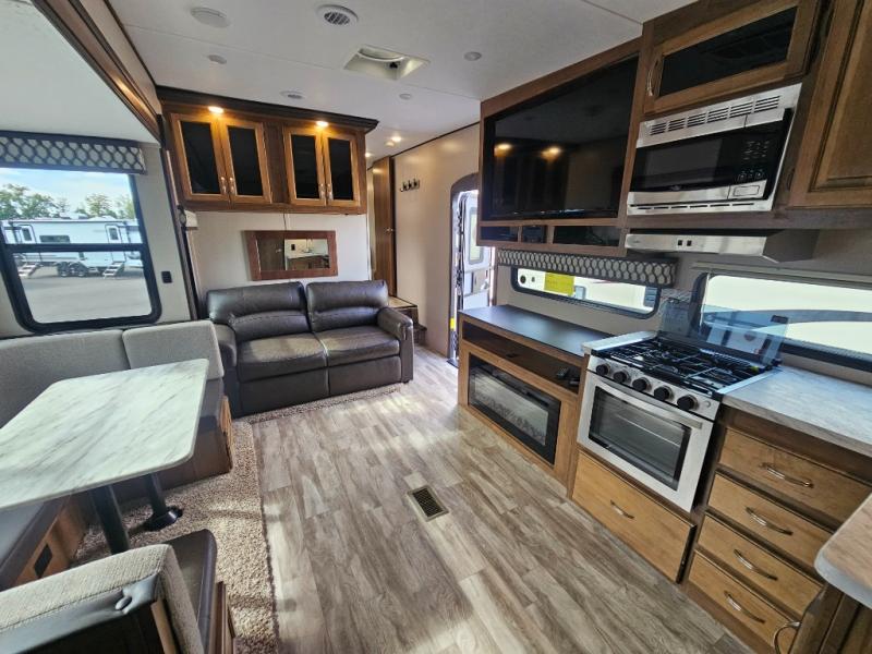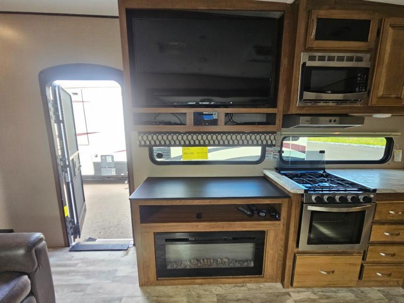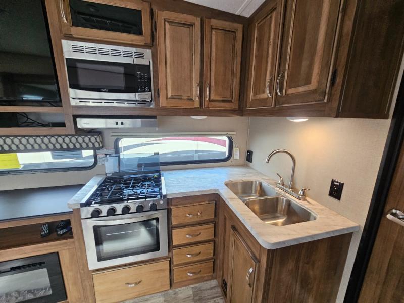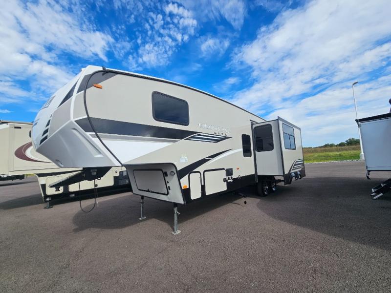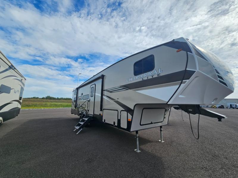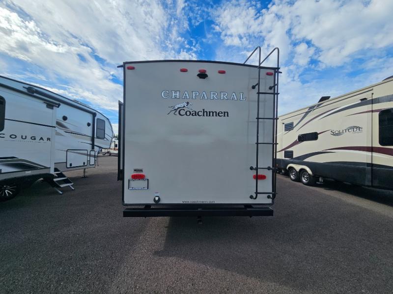 The Chaparral Lite fifth wheels by Coachmen allow you to enjoy the RV lifestyle without all the hassle! These models feature Road Armor Suspension by Trail Air with heavy duty shackles and wet bolts, plus Turn Tech Engineering for easy towability. The Weather Shield+ technology features heated and enclosed gate valves, plus an unobstructed and insulated pass-through storage with built-in tool storage so you don't have to leave anything behind. Step inside to find coordinating Dove Grey decorative slide out fascia, an extra deep farm style sink with matching thermofoil sink covers, and a pillow top mattress for all-around comfort. You will appreciate dual USB ports in the bedroom, an AM/FM/CD/DVD player with Bluetooth, pus a high BTU output modern electric fireplace for a more at-home feel.