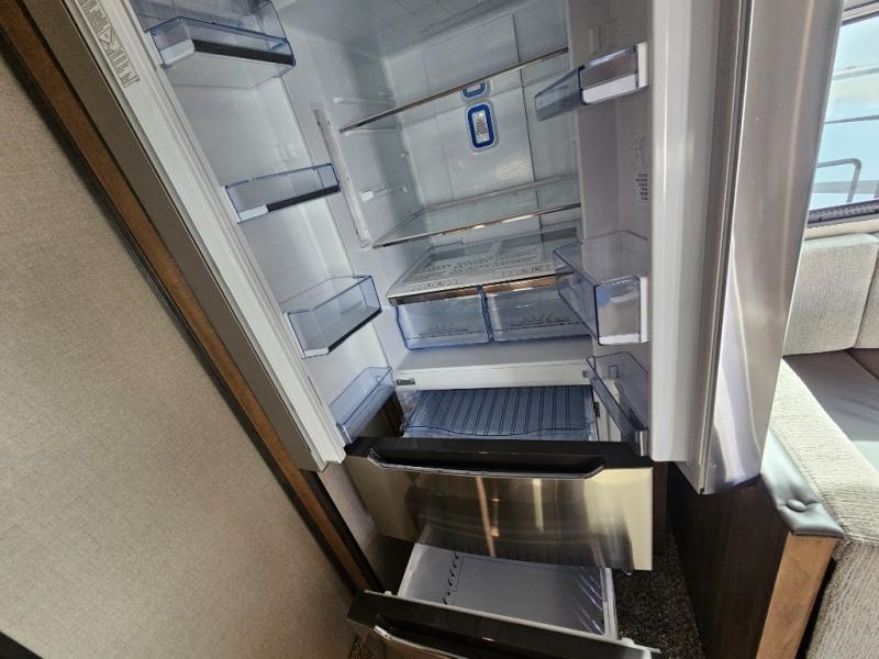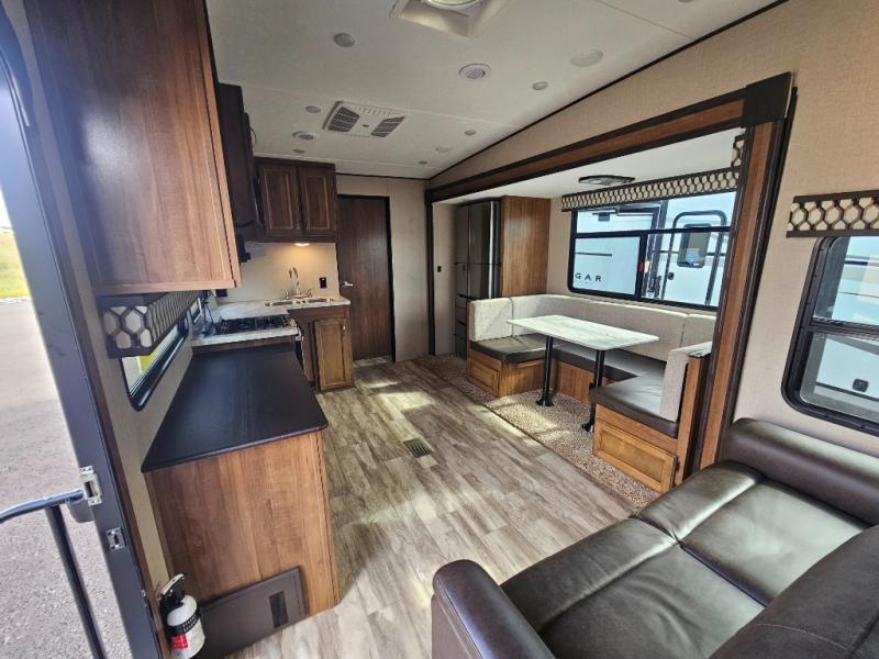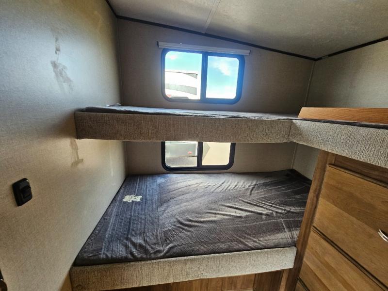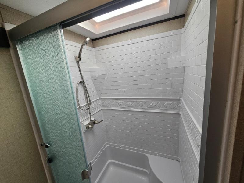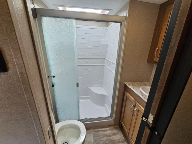 This Chaparral Lite fifth wheel is big enough for the whole family with a rear private bunkhouse and a front private bedroom! There is also a U-shaped dinette for you to enjoy your delicious meals at or even transform into an extra sleeping space if needed. The dinette is also conveniently located across from the entertainment center and beside the tri-fold sofa. Everyone will enjoy getting ready inside the full bathroom with the added natural lighting from the large privacy dome skylight above the 40" x 30" shower with a seat.