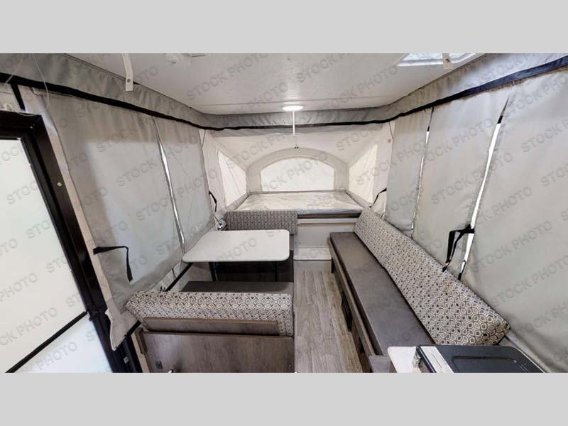 Get out and explore all the state parks easily with this easy to load, set up, tow and store folding pop-up. If you enjoy relaxing outside, the awning offers some protection from the elements, and if you enjoy relaxing inside, the 70" gauchos will provide that comfort. You can cook meals using the two burner range and wash dishes in the deep bowl acrylic sink, and the residential laminated countertop offers space to place your things. You might even like to choose the optional Off-Road package offering 15" off-road tires and a spare, plus length stabilizing extended jacks and more for you to explore even further each trip!