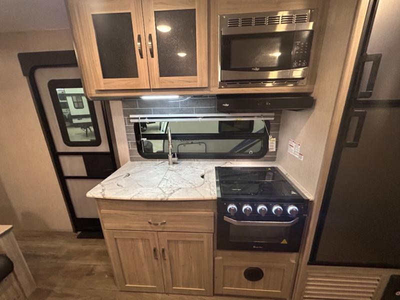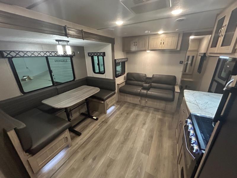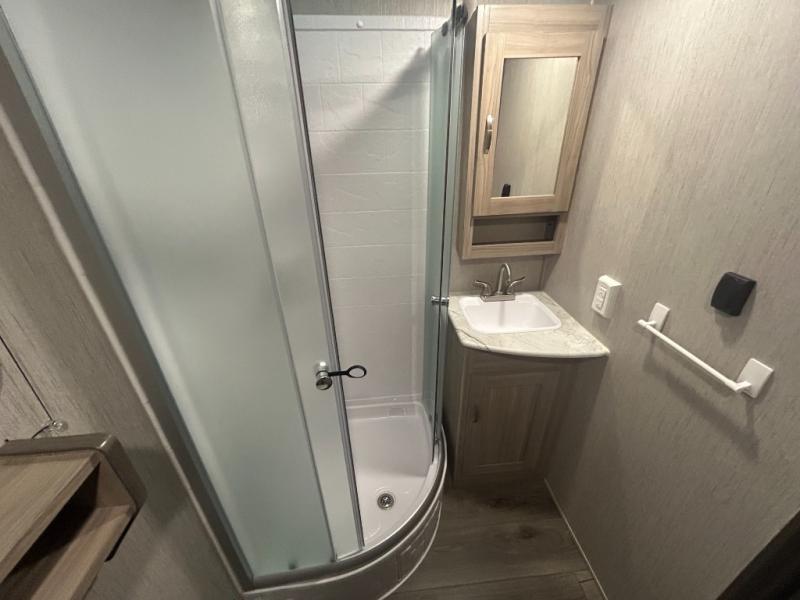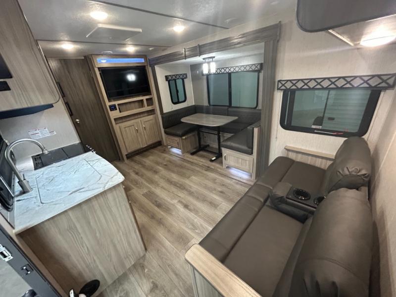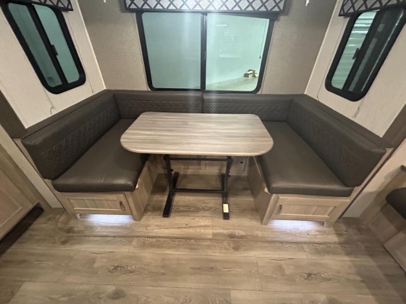 This Freedom Express Ultra Lite travel trailer allows you to relax like you do at home with more interior space thanks to the slide out in the living area. You'll appreciate the front private bedroom with a queen bed and wardrobes for your clothes. The kids can make their beds either on the U-shaped dinette or the sofa once folded down for the night. This unit features a full rear bath with a 32" radius shower and a linen closet for towels. If you enjoy cooking outdoors, then imagine making dinner for everyone at the outdoor camp kitchen!