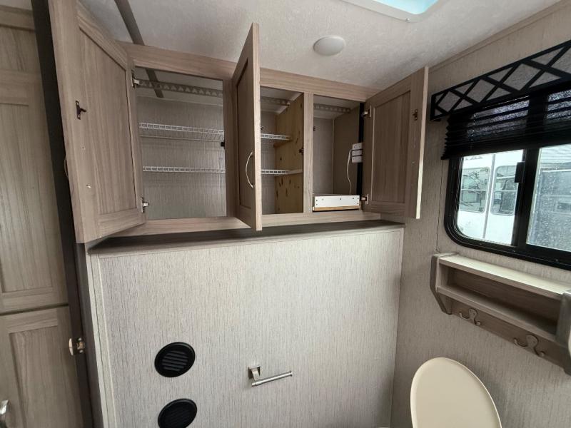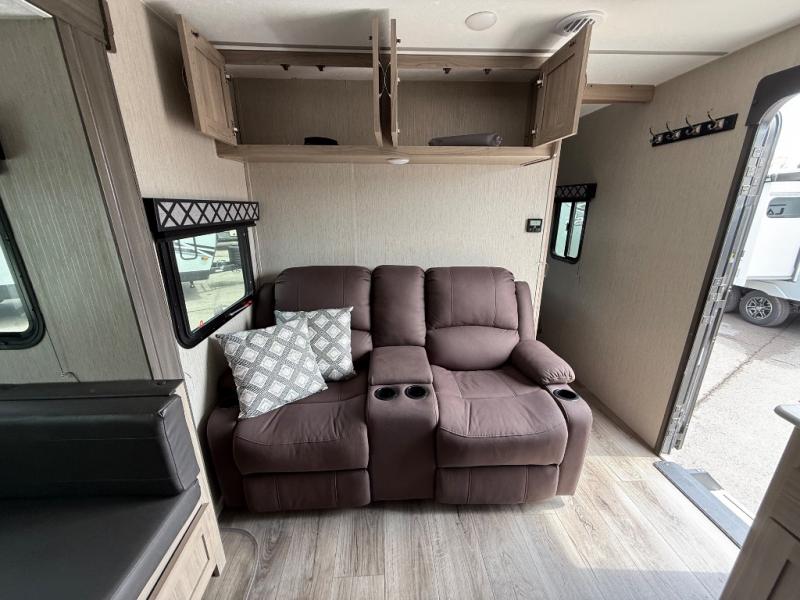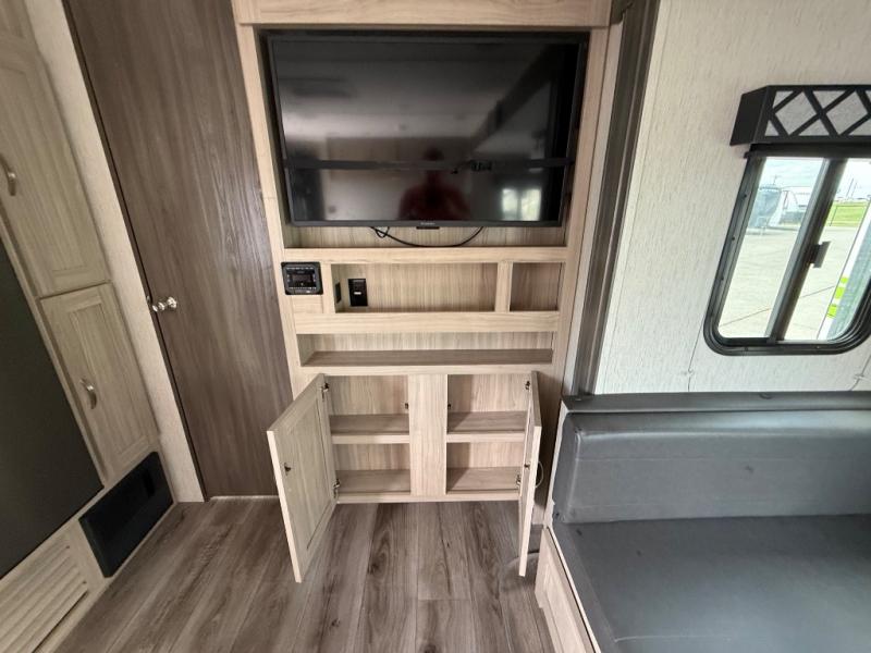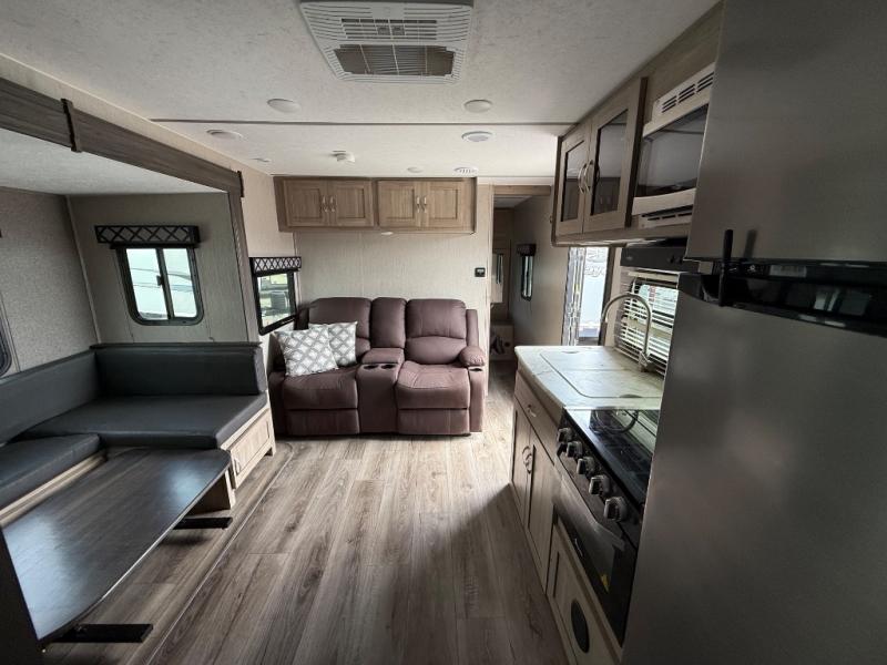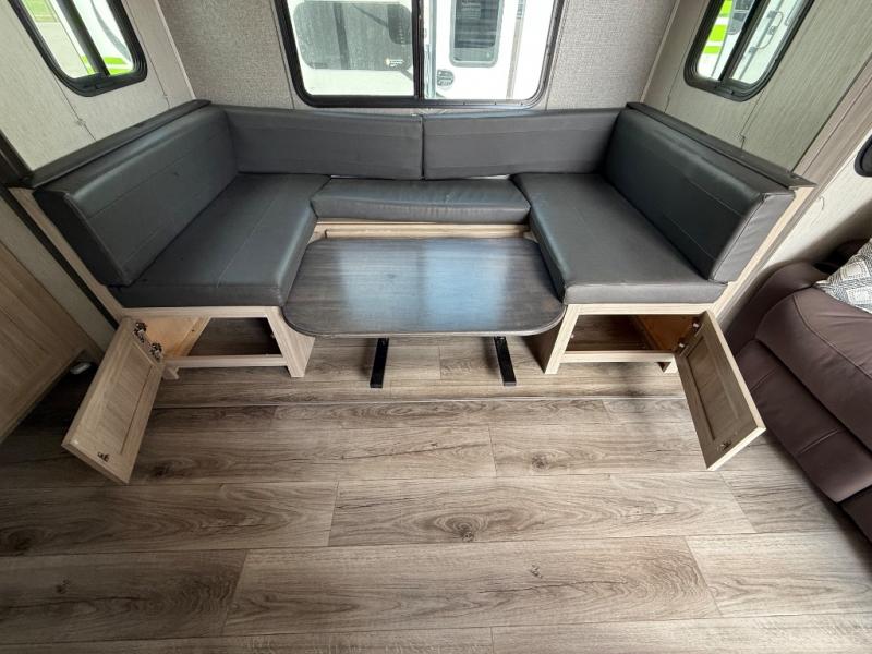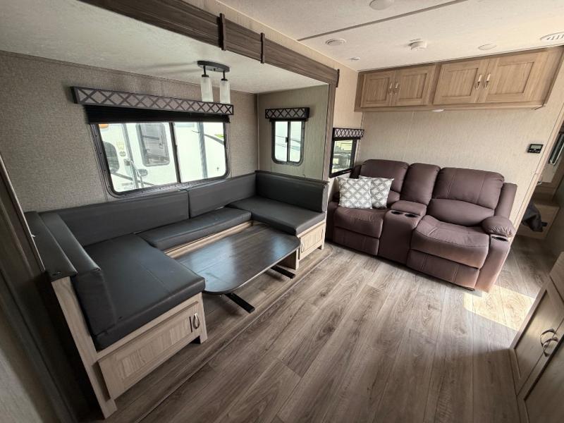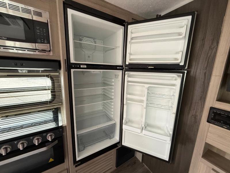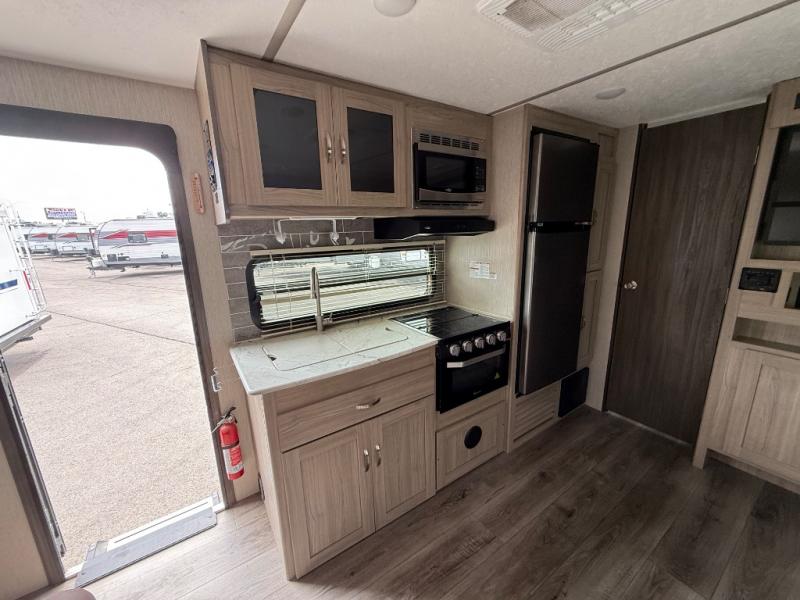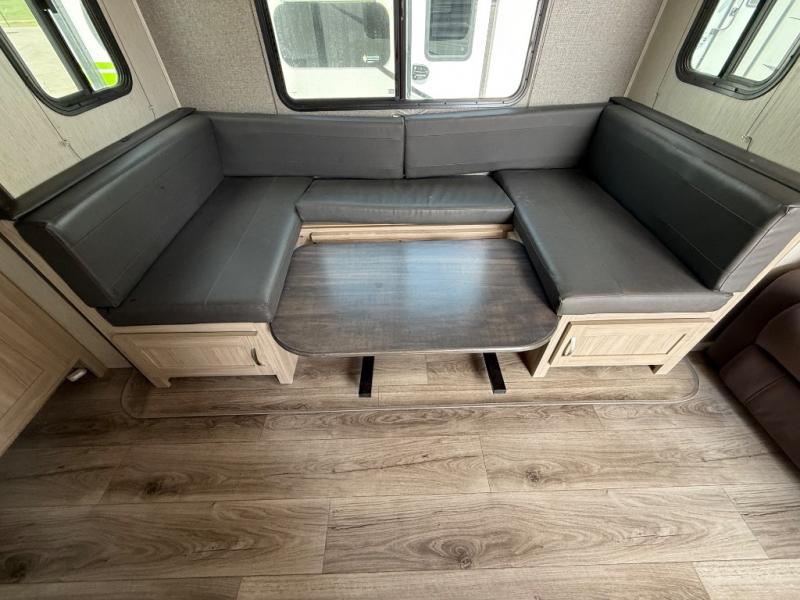 This Freedom Express Ultra Lite travel trailer allows you to relax like you do at home with more interior space thanks to the slide out in the living area. You'll appreciate the front private bedroom with a queen bed and wardrobes for your clothes. The kids can make their beds either on the U-shaped dinette or the sofa once folded down for the night. This unit features a full rear bath with a 32" radius shower and a linen closet for towels. If you enjoy cooking outdoors, then imagine making dinner for everyone at the outdoor camp kitchen!